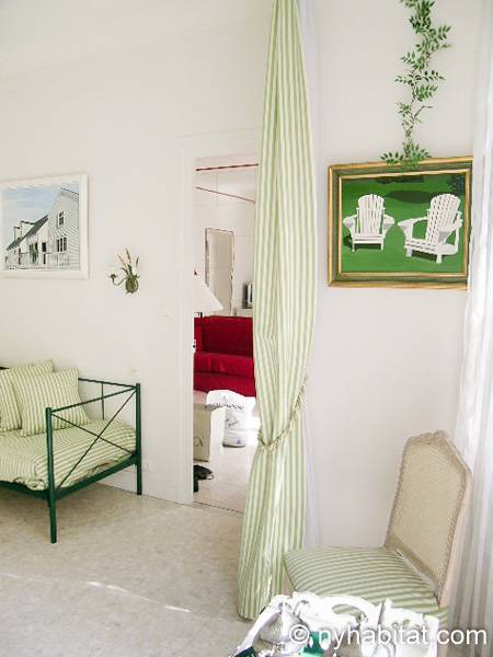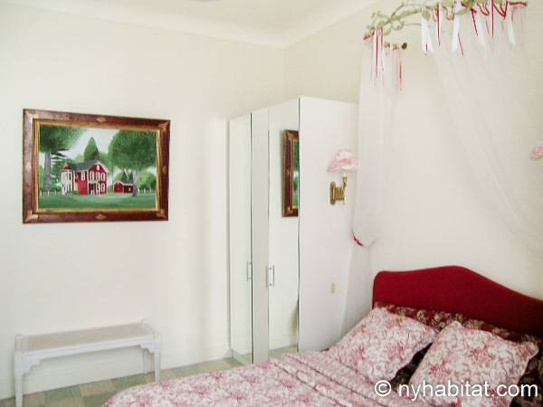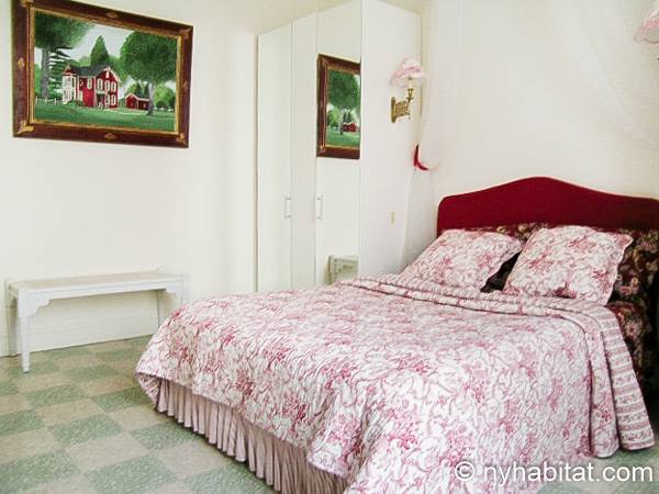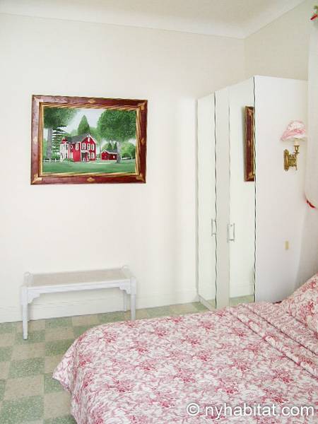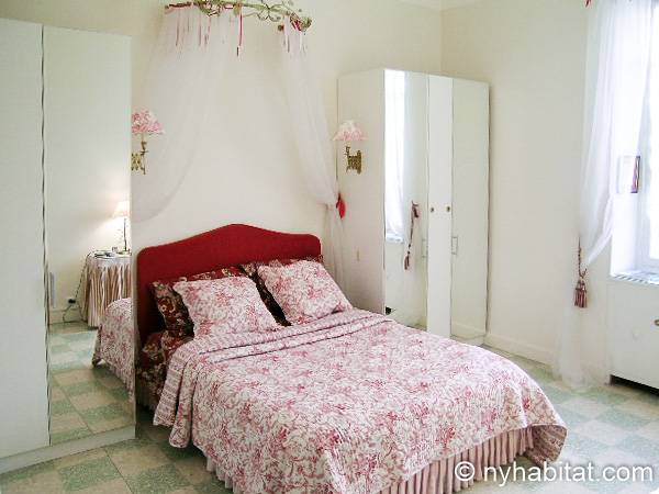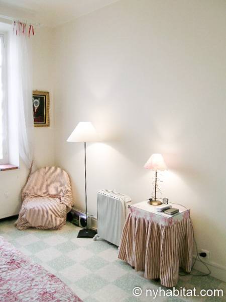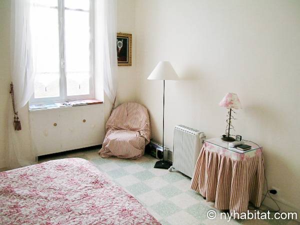 The first bedroom is furnished with a double bed, a small bench and a wardrobe. There is a window opening onto a small courtyard and the street.