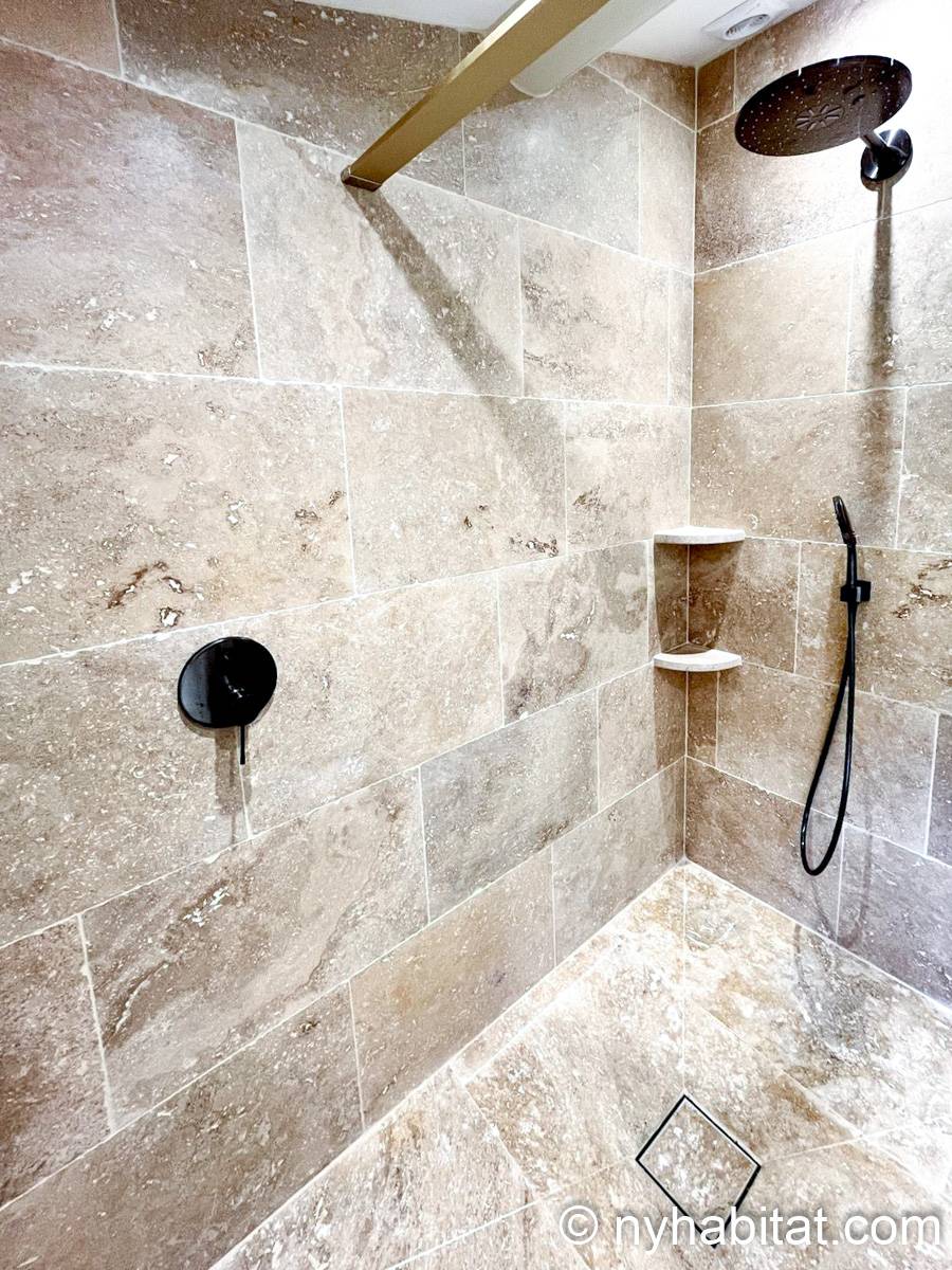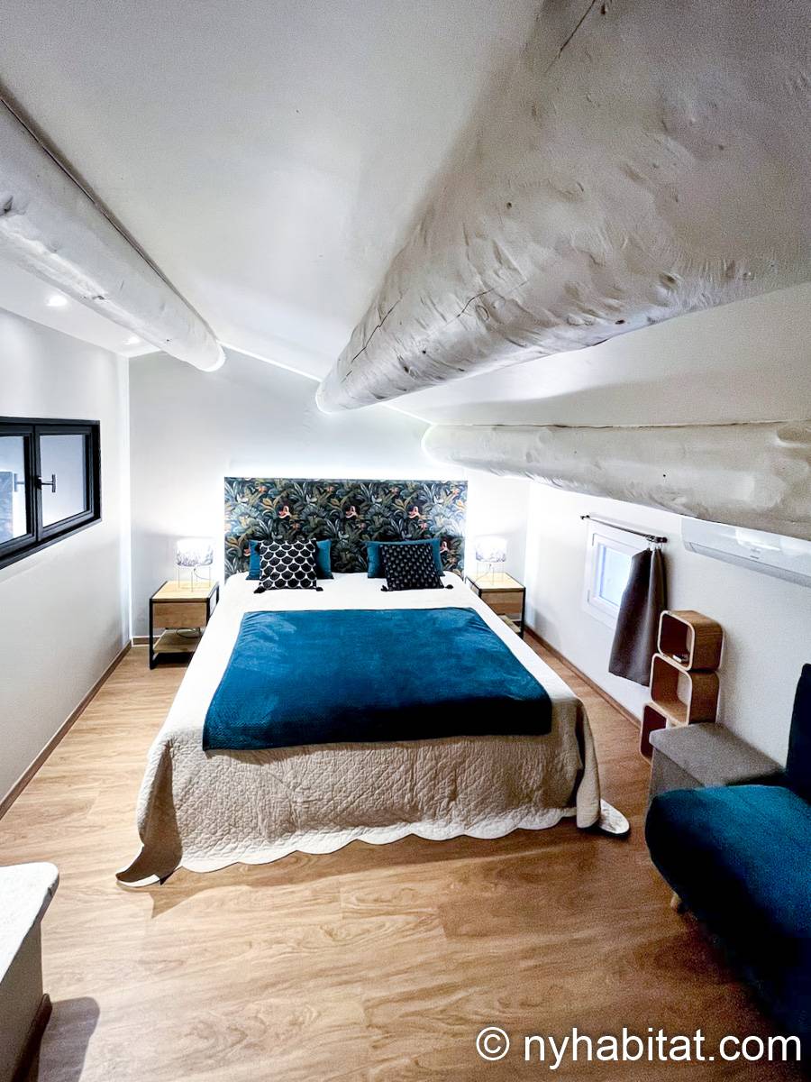 Step inside and you will find a living room with high ceilings featuring exposed wooden beams. This is a 35 m2 (around 376 square-foot) space with lounge chairs, a sofa, dining table, TV and decorative fireplace. Sliding glass doors allow natural light to fill the scene, and give you access to the terrace. The separate kitchen has a fridge, freezer, oven, microwave, toaster, coffeemaker, and dishwasher. There is also a door here to access outside. These sliding doors also allow natural light to enter the spaces. The first bedroom has a king-size bed and a lounge chair. The second bedroom has a king-size bed and an armchair in the corner. The third bedroom has a double-size bed and a ceiling with exposed wooden beams. The fourth bedroom has a king-size bed, an armchair, and its own sitting room with a sofa, coffee table and desk. The rooms are separated by a brick archway. There are two bathrooms with a shower and a single sink. Another bathroom has a shower and two sinks. The largest bathroom features two sinks, a separate shower and tub. There is also a half bathroom in this short-term rental. Outside the villa, the terrace has a seating area with a table, and chairs, and a bar. Relax by the pool in one of the lounge chairs. There are also umbrellas to provide shade.