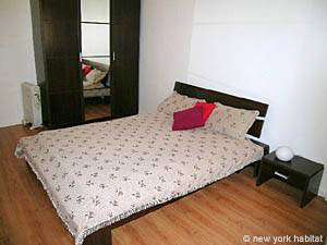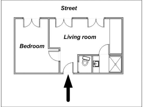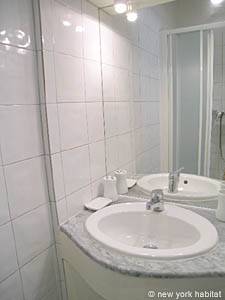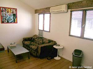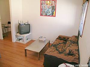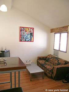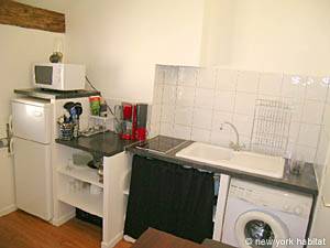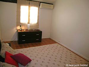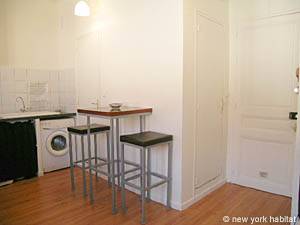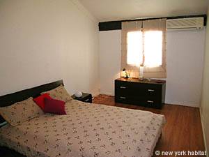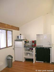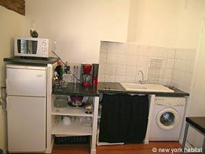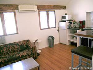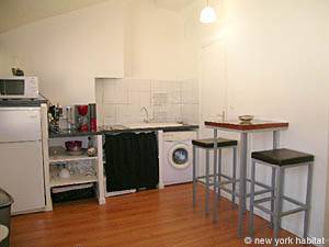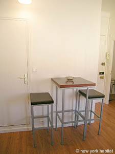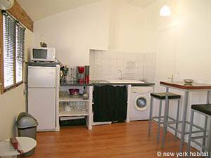 This one bedroom rental is fully furnished with sleeping space for three to sleep on the sofa bed in the 12 sq m (130 sq ft) living room and the double (140 cm wide) bed in the 14 sq m (150 sq ft) bedroom. There is a kitchen as well, with a stove, microwave, refrigerator and coffee maker. There is also a table with space for two to eat. There are also the comforts of home here: a washing machine, air conditioning and cable TV (including English channels), as well as internet access.