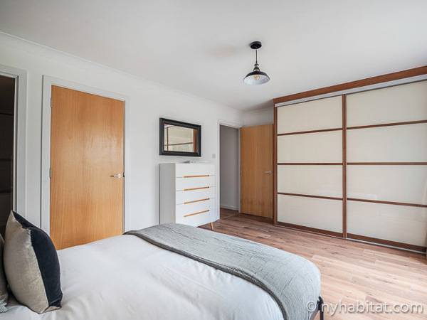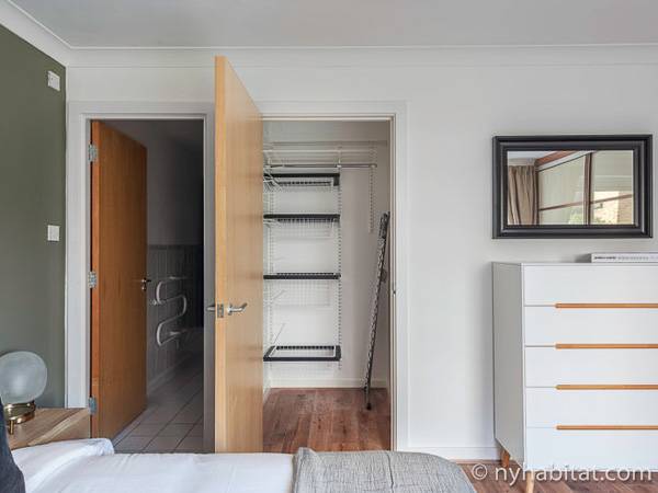 El espacioso dormitorio tiene un muy buen diseño y cuenta con una cama matrimonial y un armario empotrado que combina con una cómoda, ofreciendo amplio espacio para todas sus pertenencias. La pared que da al rio tiene dos ventanas que van del techo hasta el suelo y permiten que entre abundante luz natural.