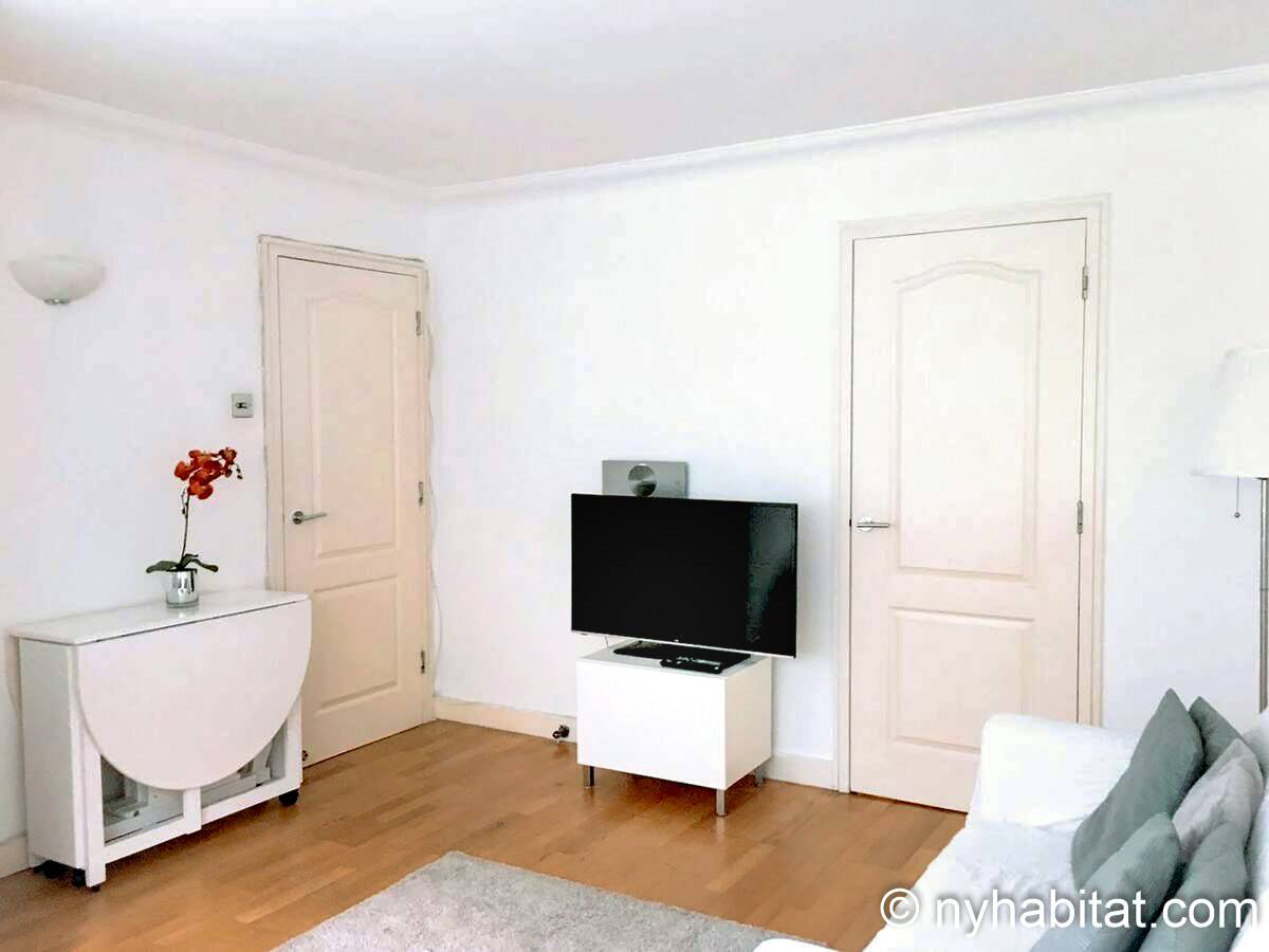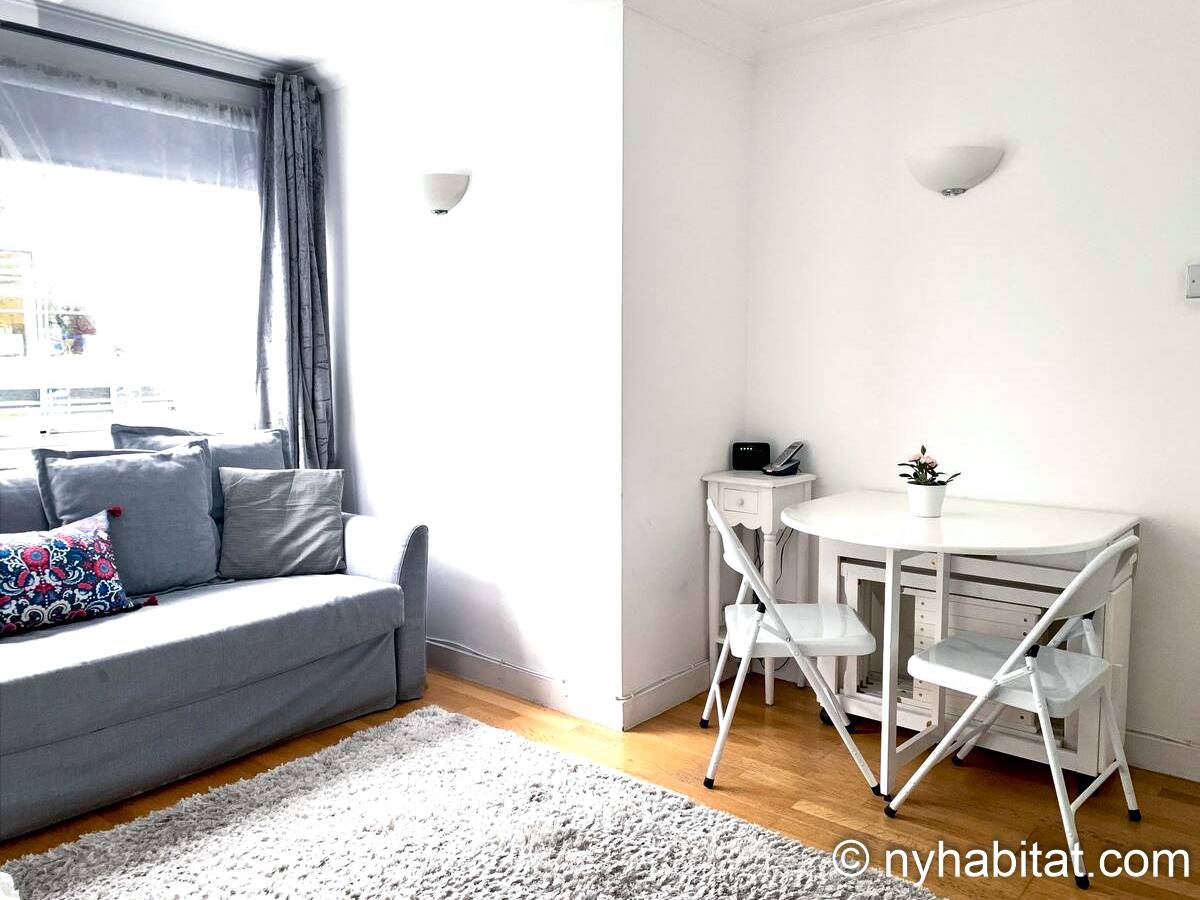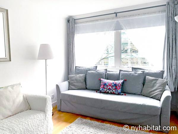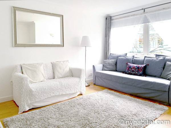 Este apartamento completamente amueblado cuenta con suelos de madera y ventanas amplias dentro de un edificio de época modernizado. En la sala de estar hay una moqueta de un color rojo vivo, cerca de un sofá-cama matrimonial blanco con cojines y, detrás, hay una ventana amplia que permite que entre aire fresco para ventilar el apartamento. Además cuenta con una televisión de pantalla plana con reproductor de DVD y las películas favoritas del propietario, así como una mesa de comedor para dos y una lámpara al lado de la ventana para proporcionar iluminación adicional.