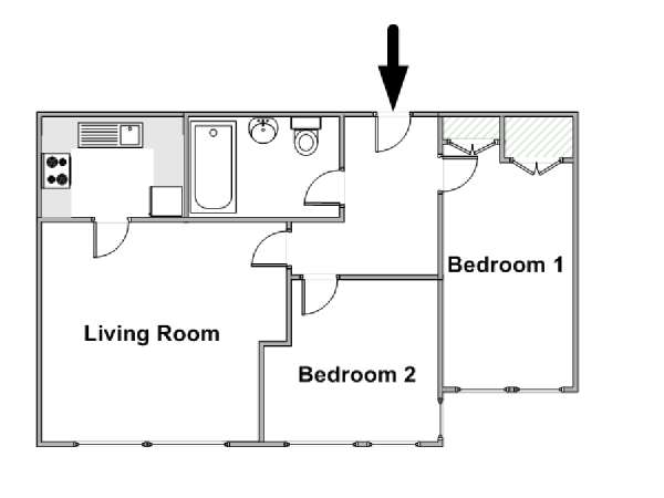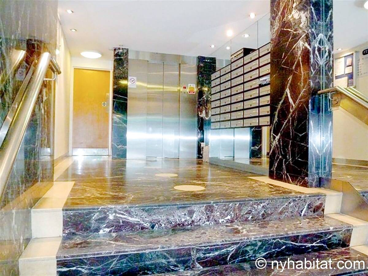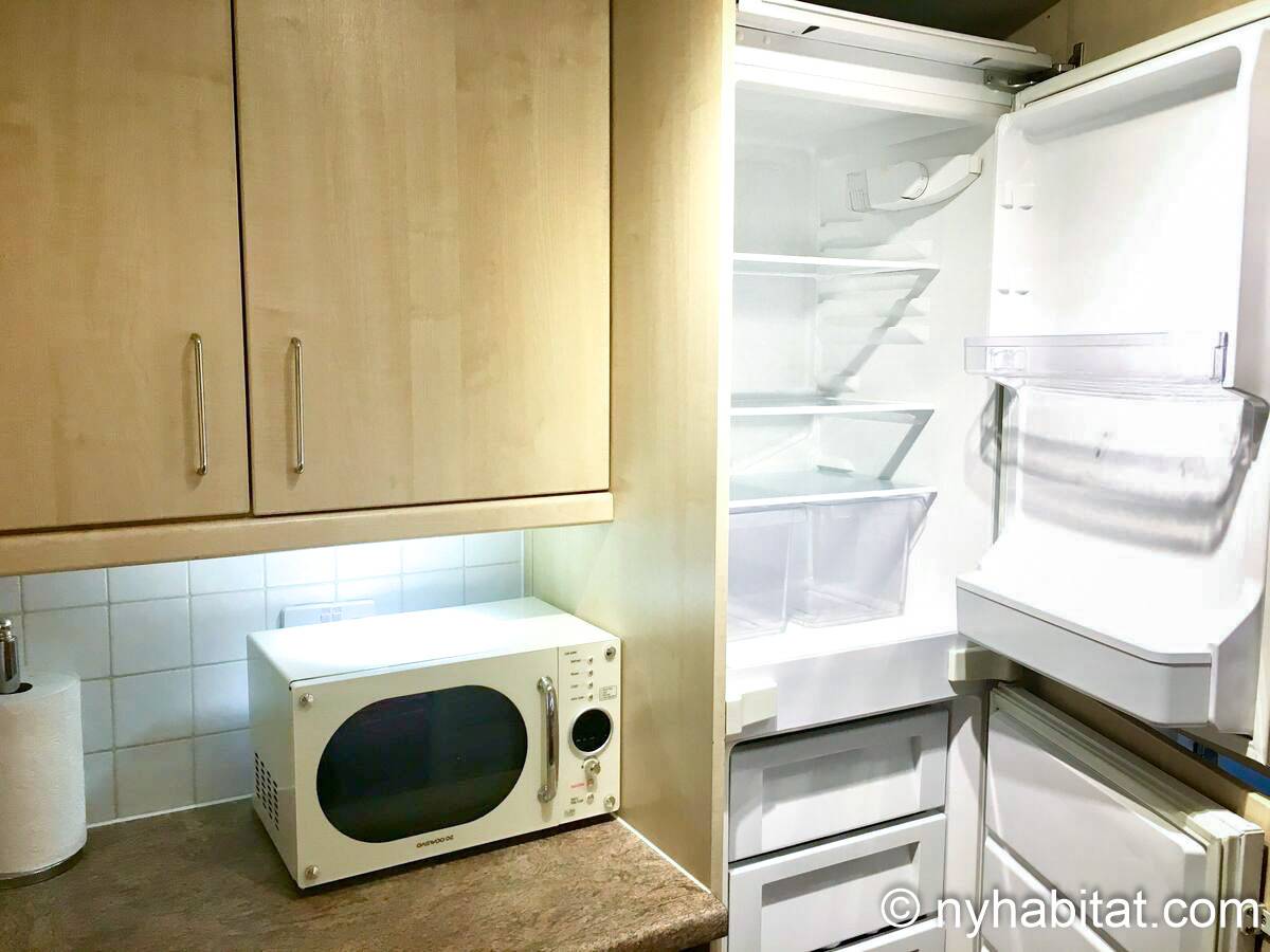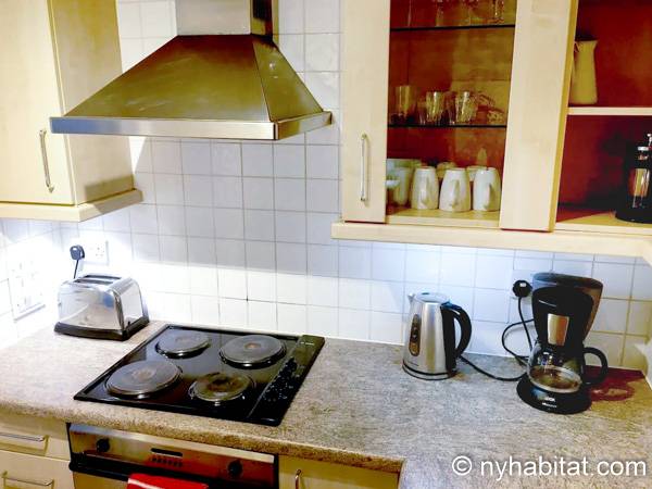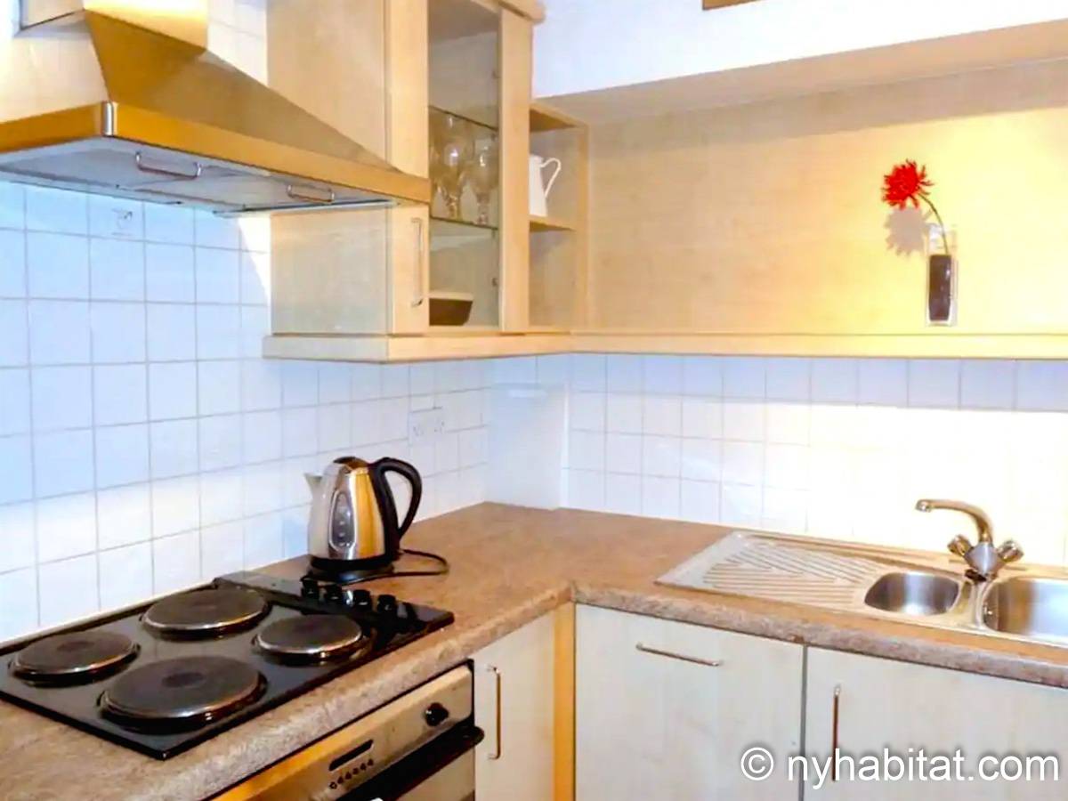 Este apartamento completamente amueblado cuenta con suelos de madera y ventanas amplias dentro de un edificio de época modernizado. En la sala de estar hay una moqueta de un color rojo vivo, cerca de un sofá-cama matrimonial blanco con cojines y, detrás, hay una ventana amplia que permite que entre aire fresco para ventilar el apartamento. Además cuenta con una televisión de pantalla plana con reproductor de DVD y las películas favoritas del propietario, así como una mesa de comedor para dos y una lámpara al lado de la ventana para proporcionar iluminación adicional.