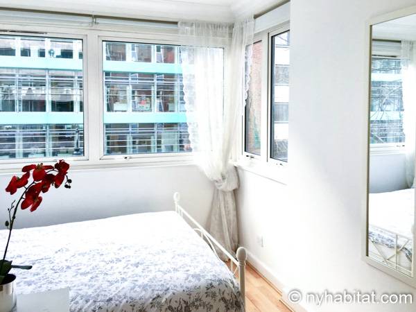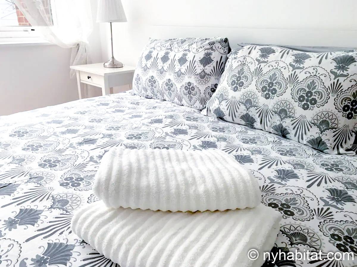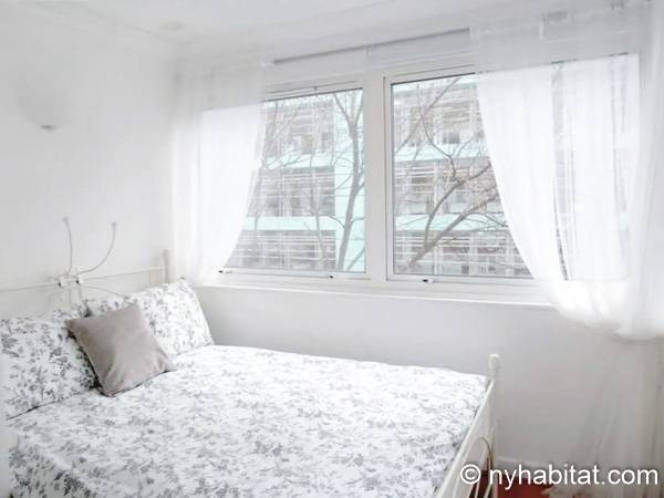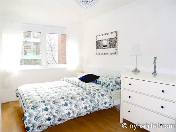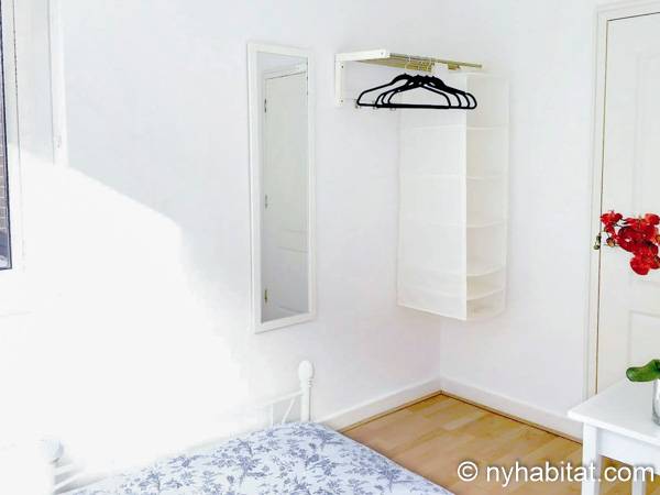 El dormitorio 2 tiene unas dimensiones de 8 m2 e incluye una cama de matrimonio con sábanas limpias y, a su izquierda, unas ventanas con doble cristal, doble orientación y persianas para poder ventilar fácilmente y, al mismo tiempo, disponer de la oscuridad necesaria para un sueño reparador. Además hay armarios con espacio para guardar cosas.