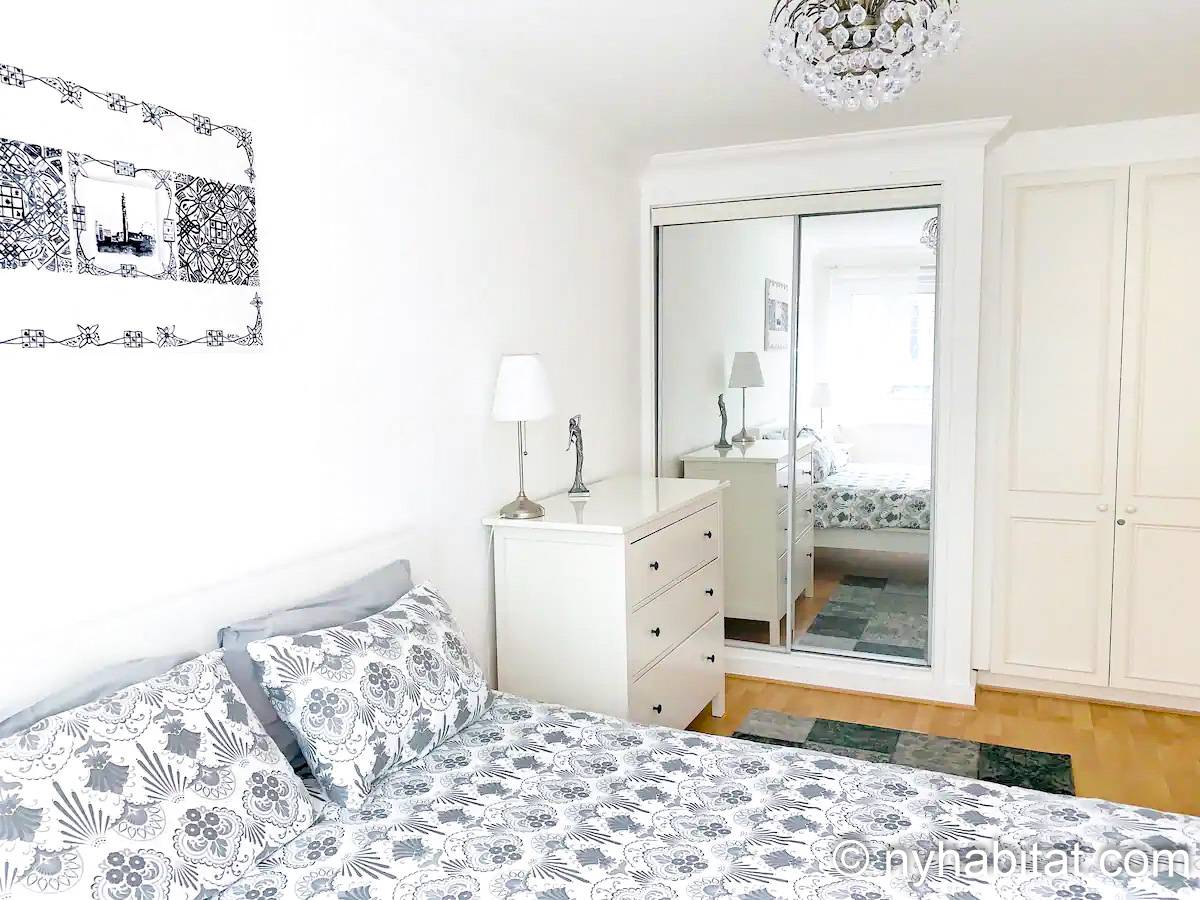 El dormitorio principal (dormitorio 1) abarca 10 m2 e incluye una cama tamaño king con sábanas limpias, ventanas con doble cristal a la derecha de la cama, permitiendo la entrada de aire fresco y luz natural a la habitación. Además está amueblado de forma moderna, con una cómoda para guardar cosas y un espejo de cuerpo entero.