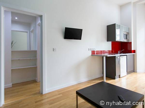 Este apartamento de 1 dormitorio está formado por un salón, un dormitorio, un baño y una cocina. Puede relajarse en el sofá del salón viendo la televisión o cocinando en la pequeña pero funcional cocina americana. Aquí encontrará un frigorífico con congelador, un microondas y un hervidor de agua para las comidas rápidas. La zona del comedor, junto a la cocina, tiene una ventana, lo que permite que entre luz natural al salón y lo ilumine. El dormitorio del piso cuenta con una cama doble, una cómoda y una ventana.