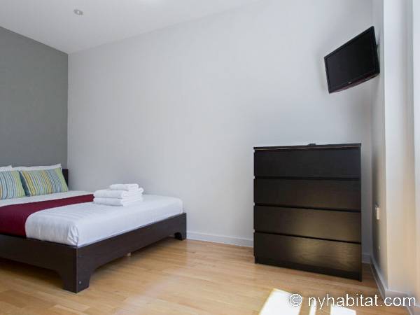 El interior de este apartamento estudio dispone de elegantes suelos de madera combinados con paredes blancas y muebles modernos. El dormitorio incluye una cama, con ropa de cama, que mira hacia el televisor con servicio de televisión por cable fijado a la pared. También cuenta con una cómoda para que almacene su ropa y un teléfono. Continúe y verá la cocina completamente equipada y la zona de comedor, con suelos de baldosa blanca y repleta de luz natural. Dispondrá de frigorífico, microondas y una zona bar con taburetes. El baño de este apartamento tiene plato de ducha y retrete.