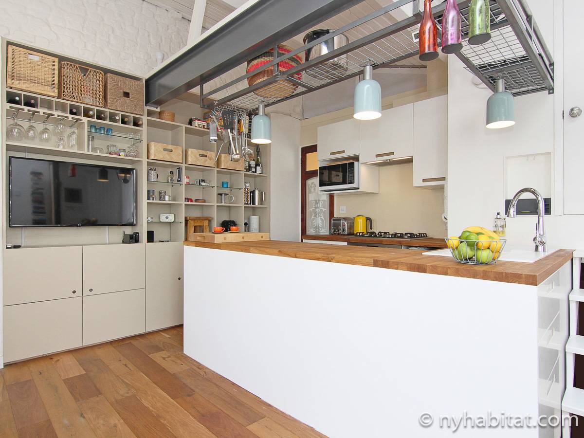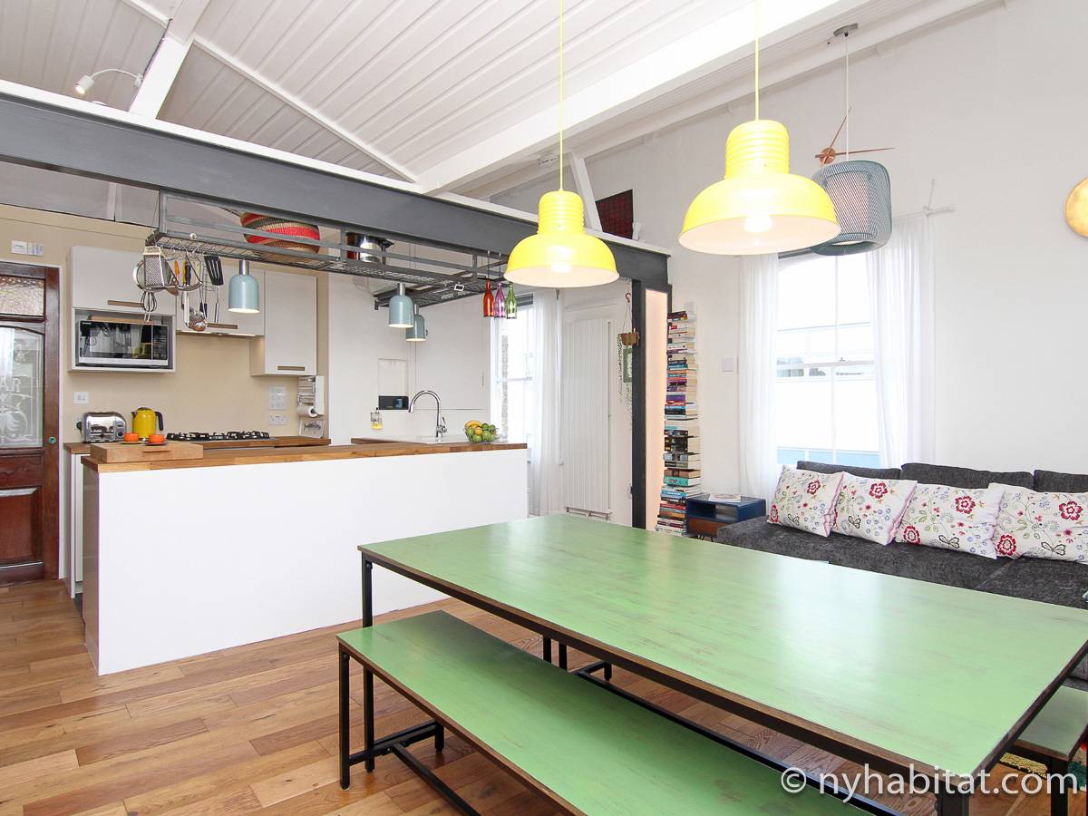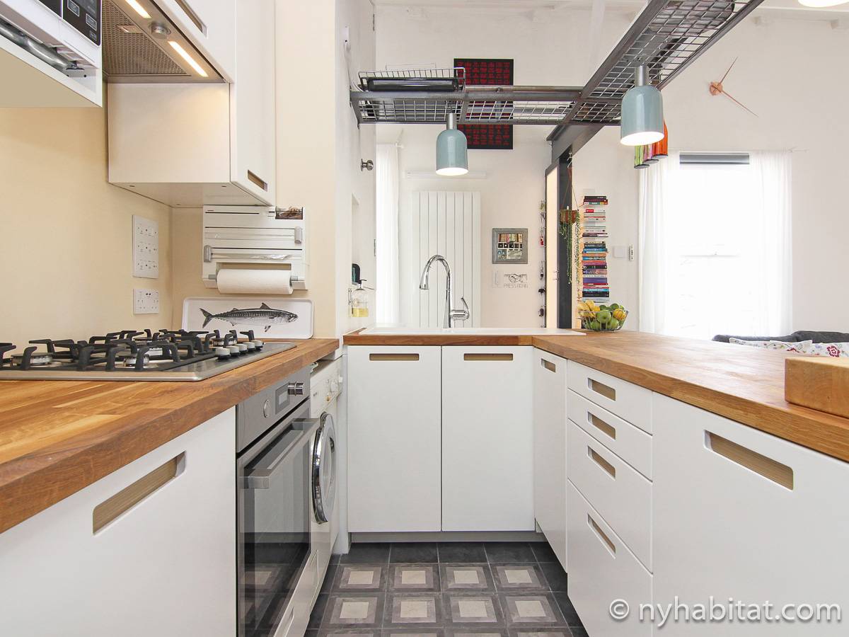 Este alojamiento de Kentish Town West Londres tiene una cocina contemporánea abierta en forma de “u”, equipada llevar a cabo cualquier receta con su encimera de gran tamaño. Microondas, cocina y horno están a su servicio. Los armarios de madera blanca permiten fácil acceso a los utensilios de cocina.