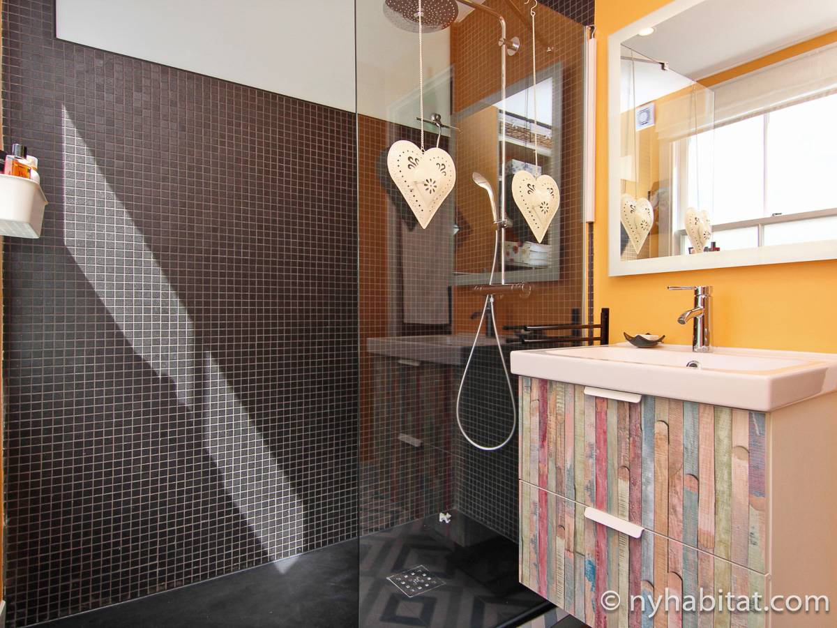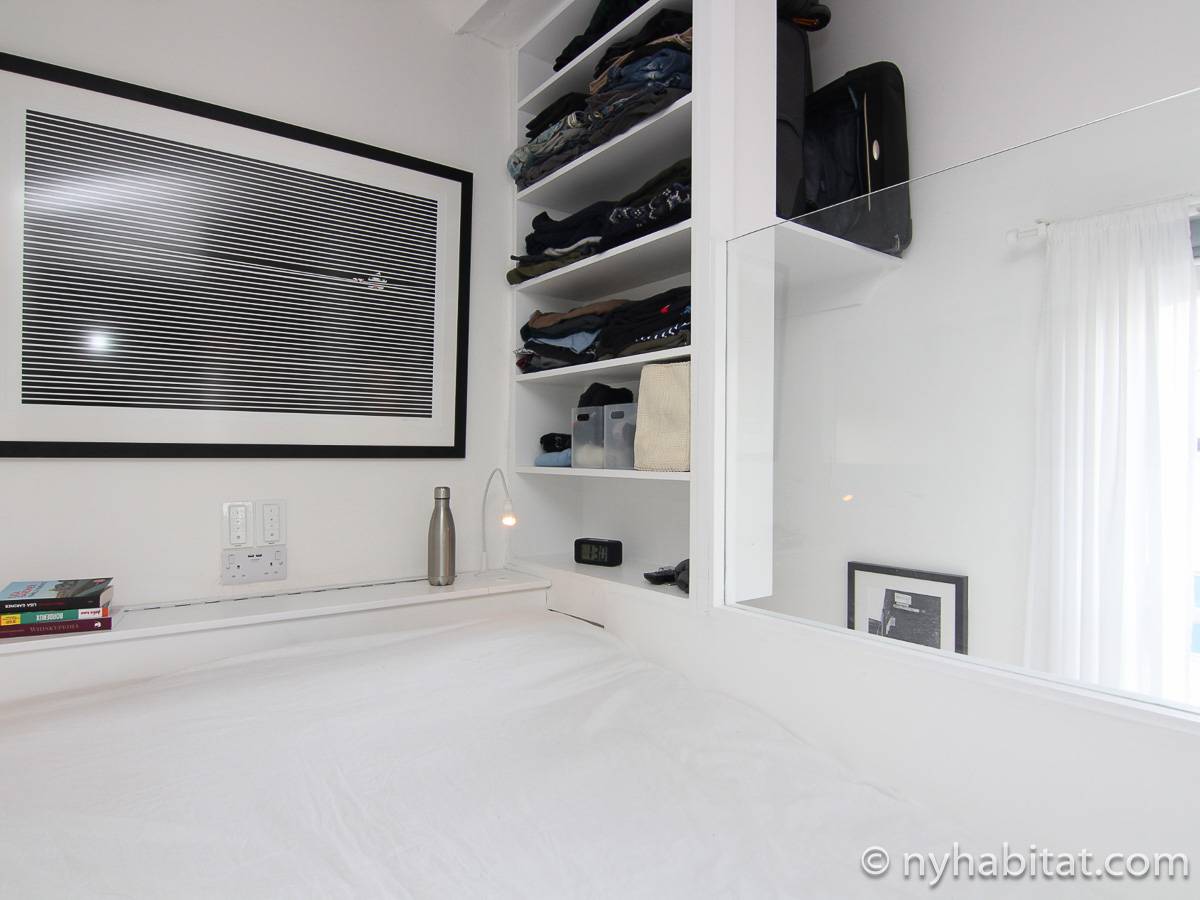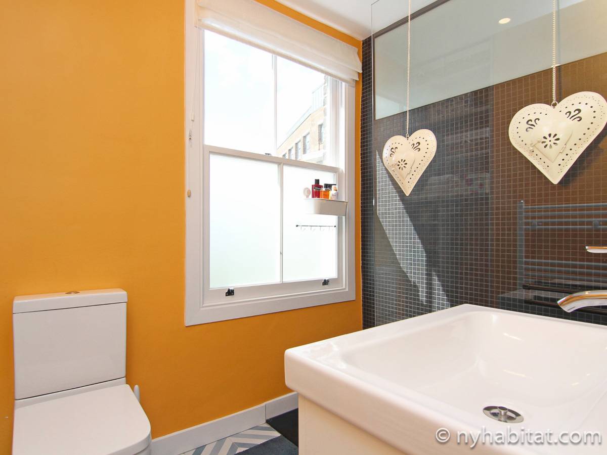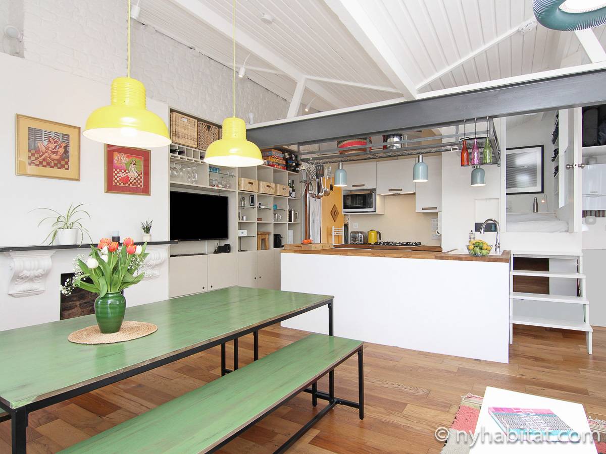 Este alojamiento de Kentish Town West Londres tiene una cocina contemporánea abierta en forma de “u”, equipada llevar a cabo cualquier receta con su encimera de gran tamaño. Microondas, cocina y horno están a su servicio. Los armarios de madera blanca permiten fácil acceso a los utensilios de cocina.