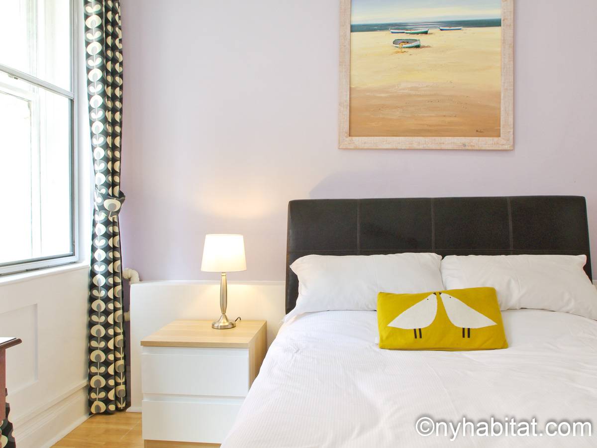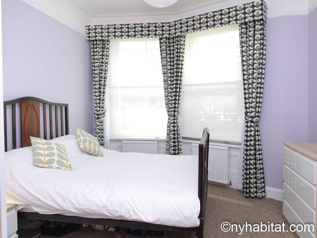 Dormitorio 1 cuenta con: dos ventanas, un armario de cuatro cajones, mesilla de noche, una alfombra y una cama de matrimonio.