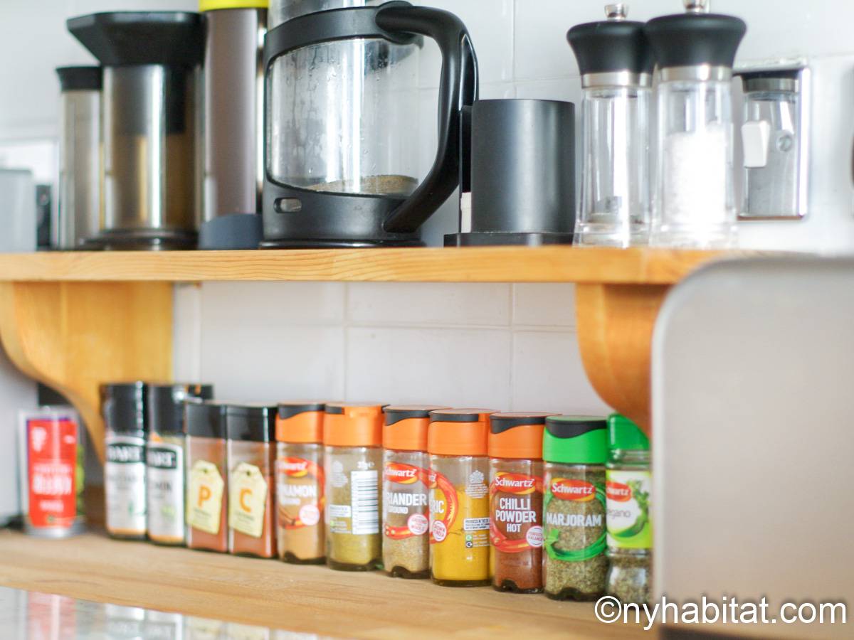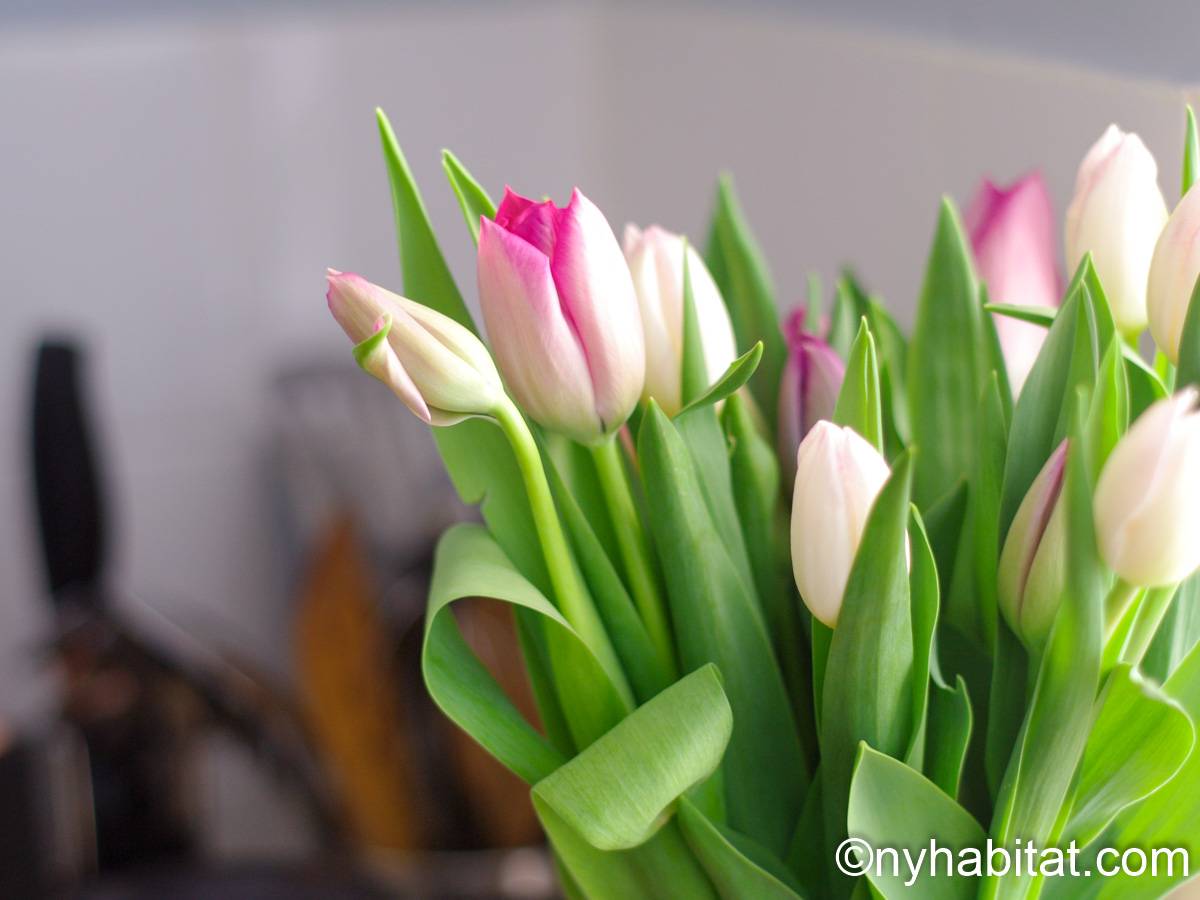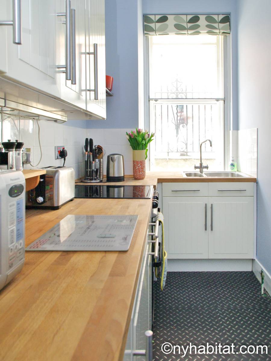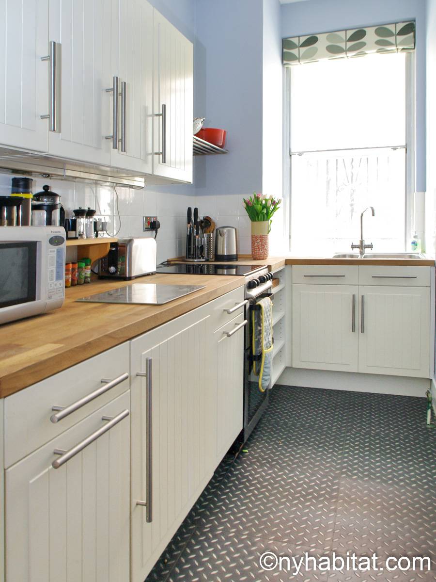 Las tres ventanas grandes permiten que entre luz natural y amplifican el aire relajado de este alojamiento de dos dormitorios en Fitzrovia, Londres. Los muebles y suelos de madera unifican el espacio. En la cocina abierta encontrará todos los utensilios de cocina que un chef puede necesitar. Los electrodomésticos modernos combinan con los armarios blancos y su distribución compacta y eficiente hace que cocinar no sea un caos. Con una ventana grande, la cocina se mantiene iluminada mientras se prepara el desayuno o el almuerzo.