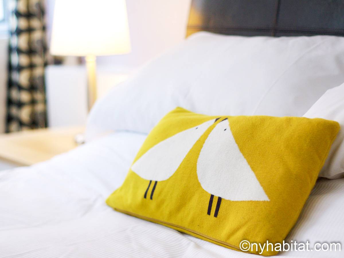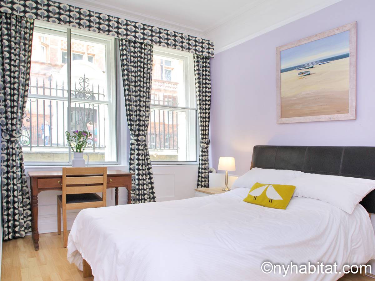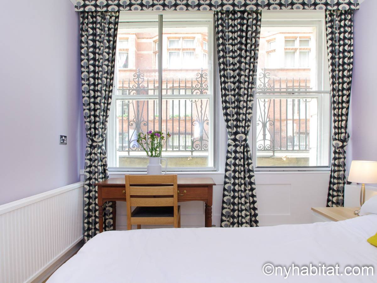 El dormitorio 2 tiene una cama King-size, un escritorio pequeño, mesilla y dos ventanas grandes.
