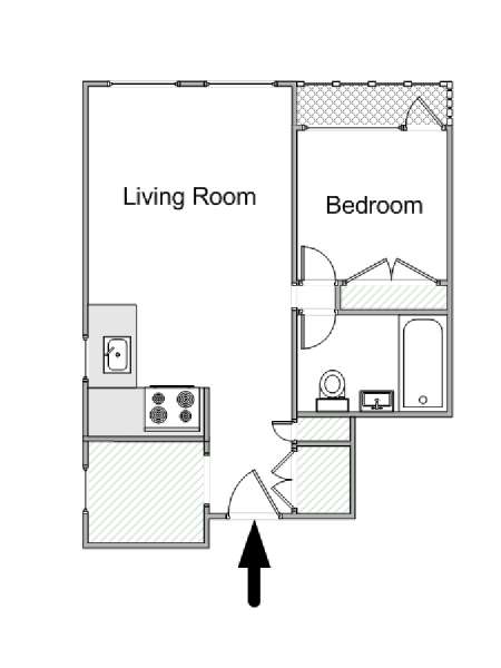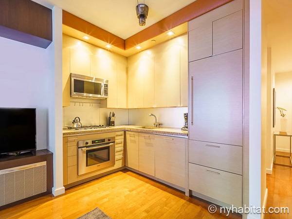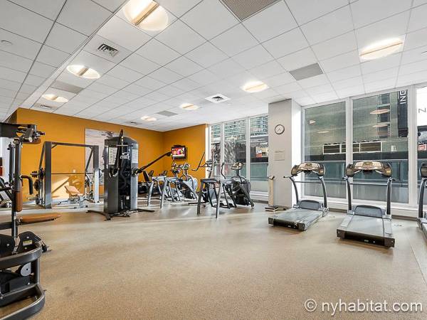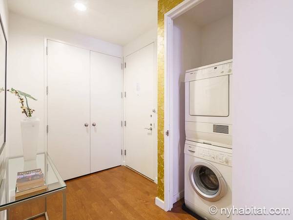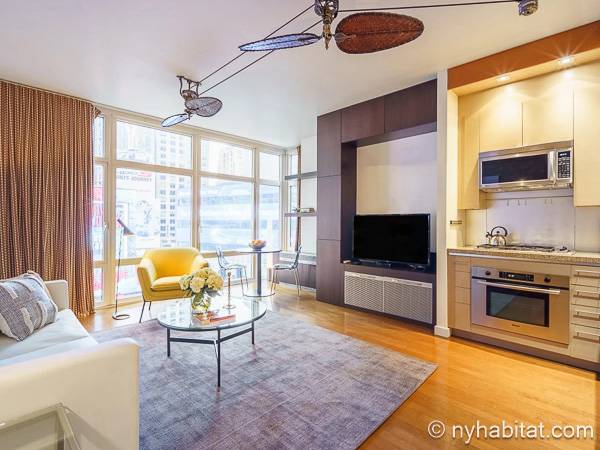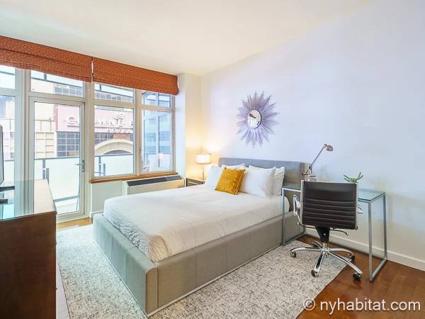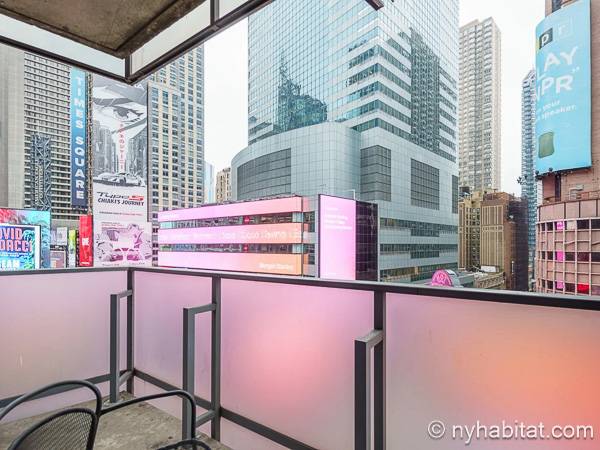 Este apartamento de un dormitorio se encuentra en Midtown West, Manhattan, entre Broadway y West 49th Street. Este piso completamente amueblado está ubicado en un edificio con ascensor que dispone de una terraza al aire libre, un salón de ocio y un gimnasio para su conveniencia, así como de servicio de portero a tiempo completo.