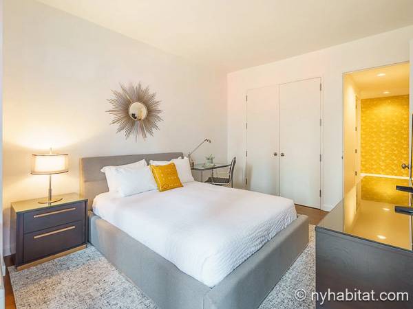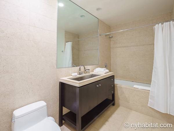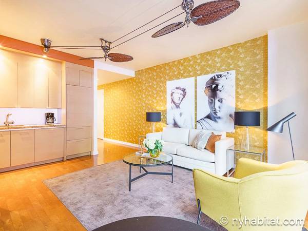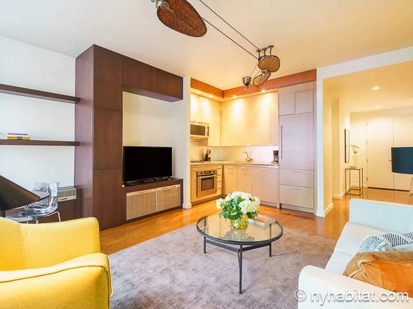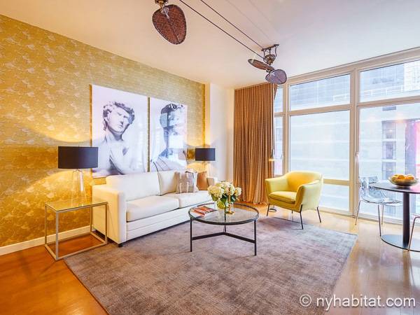 Este apartamento de un dormitorio está decorado con un toque contemporáneo, tiene grandes ventanales por los que entra ampliamente la luz del día y a través de los que ofrece unas vistas impresionantes a la ciudad de Nueva York. En la sala de estar, el sofá se sitúa frente a la televisión con cable, lo que lo convierte en un espacio perfecto para relajarse. Una mesa de comedor con capacidad para cuatro personas es ideal para disfrutar de un plato hecho en casa o para trabajar.