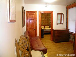 Este apartamento de un dormitorio amueblado posee muebles contemporáneos y espacio suficiente. Se encuentra entre 10th Street y Avenue A, en la planta más alta de un edificio vistoso de cinco plantas (equivalente a cuatro plantas en Europa) de poca altura de la preguerra con escalera. Para garantizar su comodidad, dispone además de un sistema de seguridad con interfono y timbre.