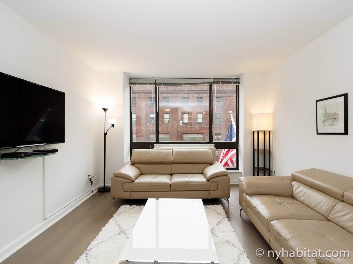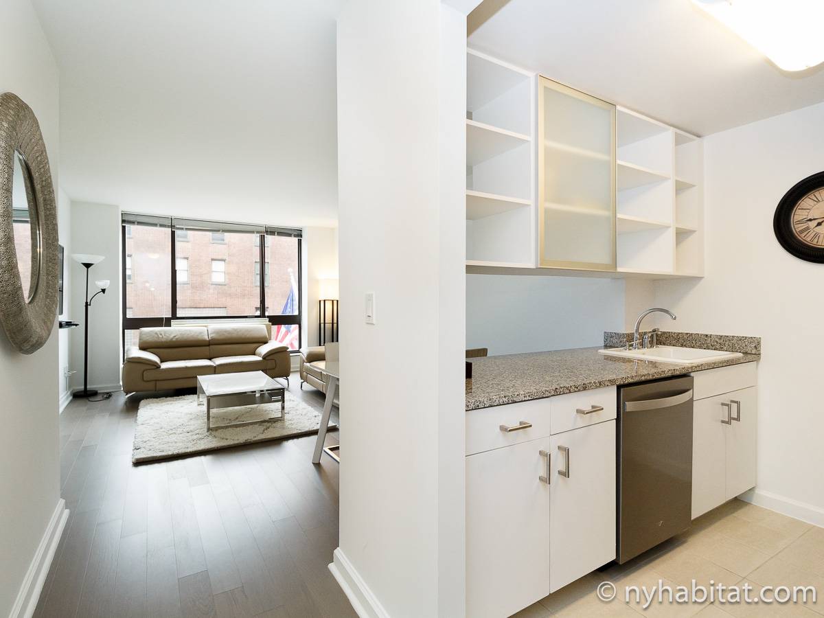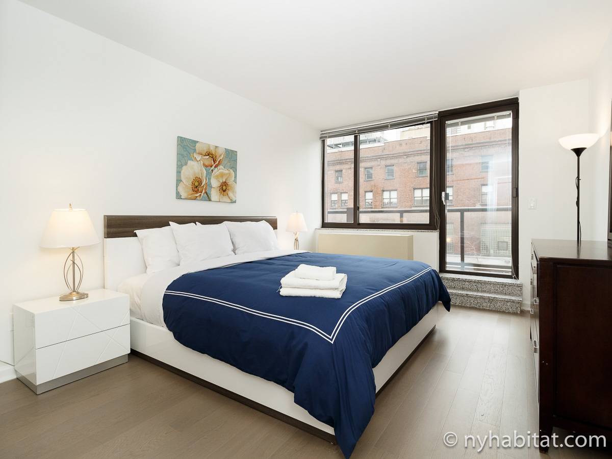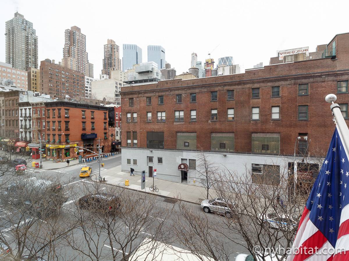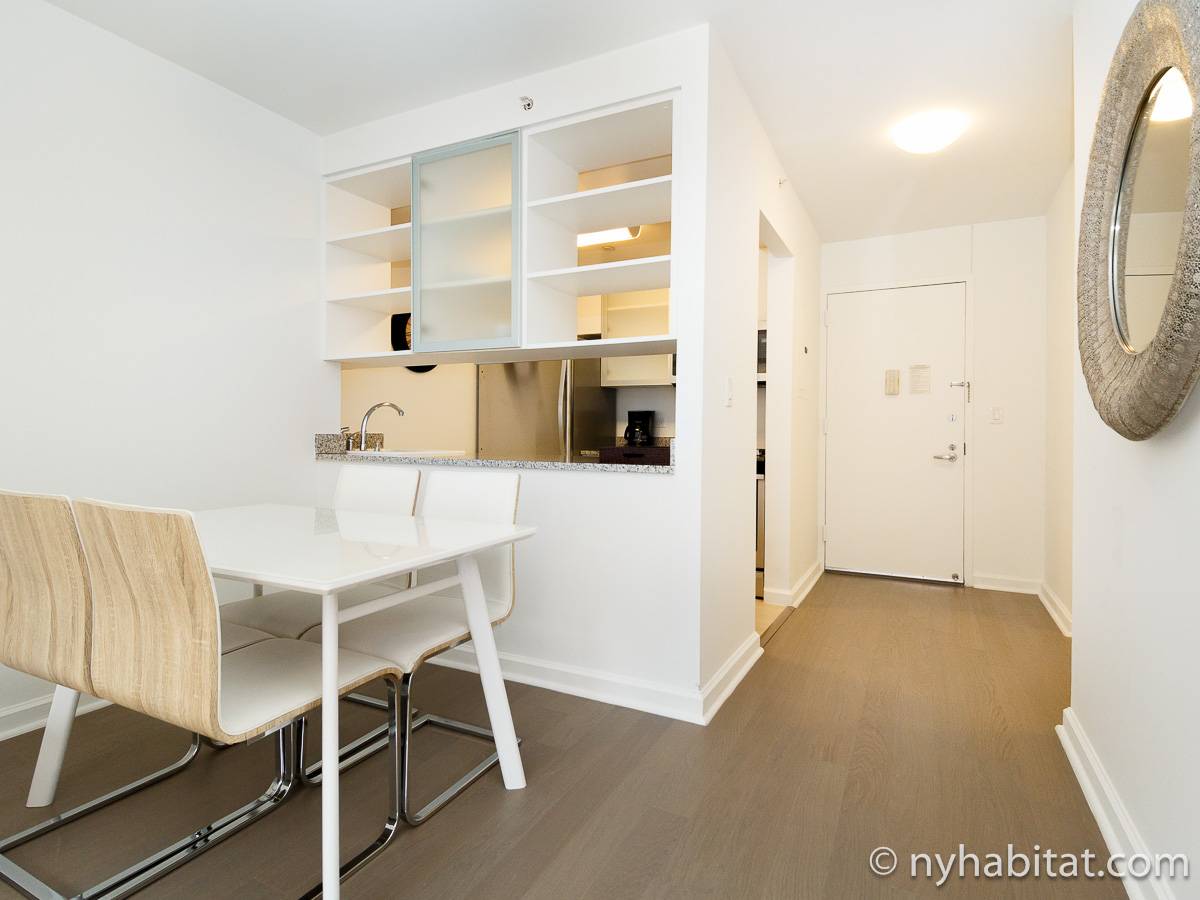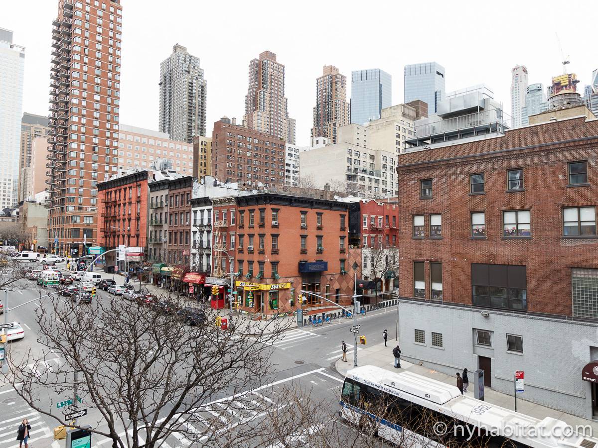 Alquile mensualmente este apartamento totalmente amueblado de 1 dormitorio en Midtown West, un barrio animado de Manhattan. Se encuentra en la quinta planta (equivalente a la cuarta planta en Europa) de un lujoso edificio de gran altura que cuenta con un conserje a tiempo completo, un patio-jardín, una azotea con terraza, gimnasio, cancha de baloncesto cubierta y servicio de lavandería, cerca de West 56th Street y 10th Avenue.