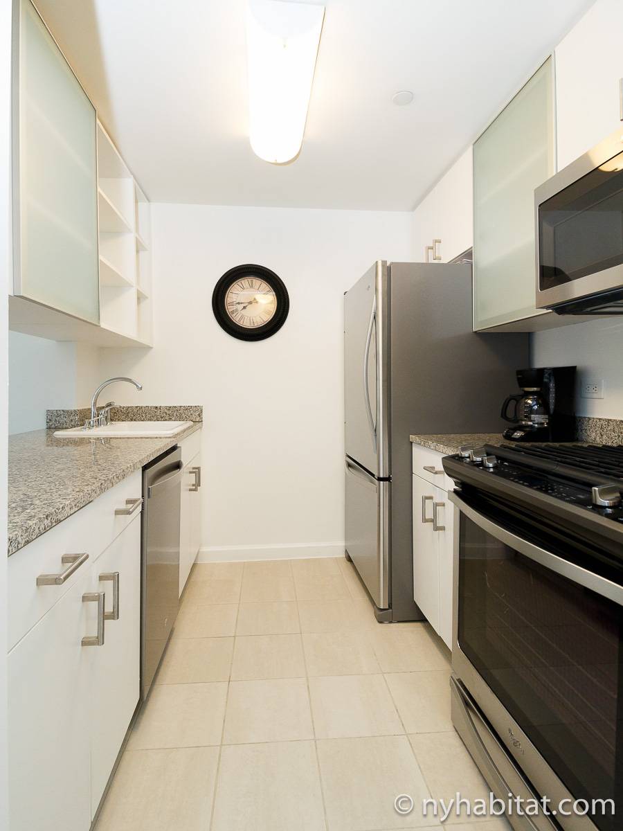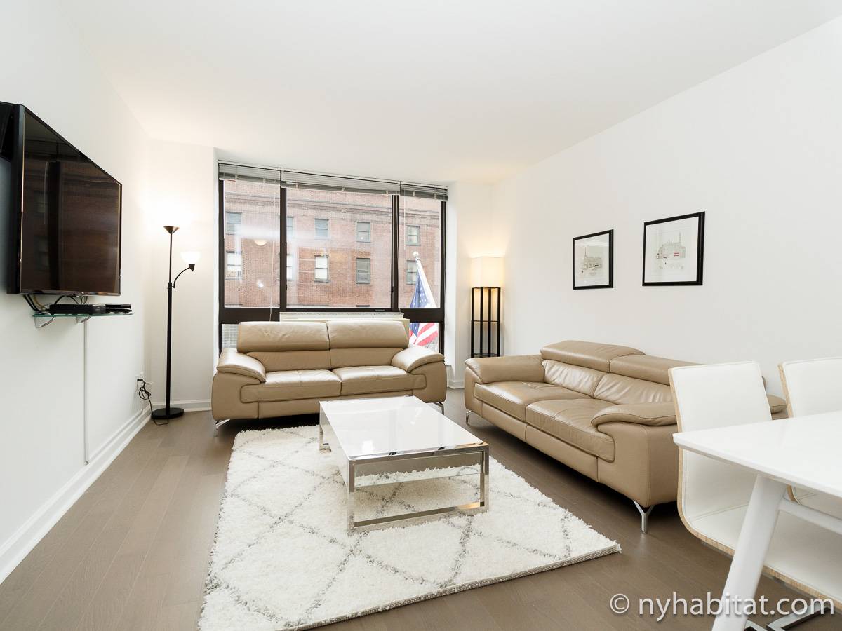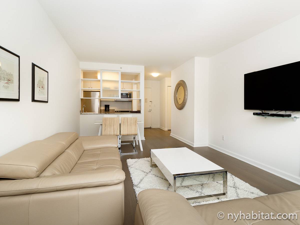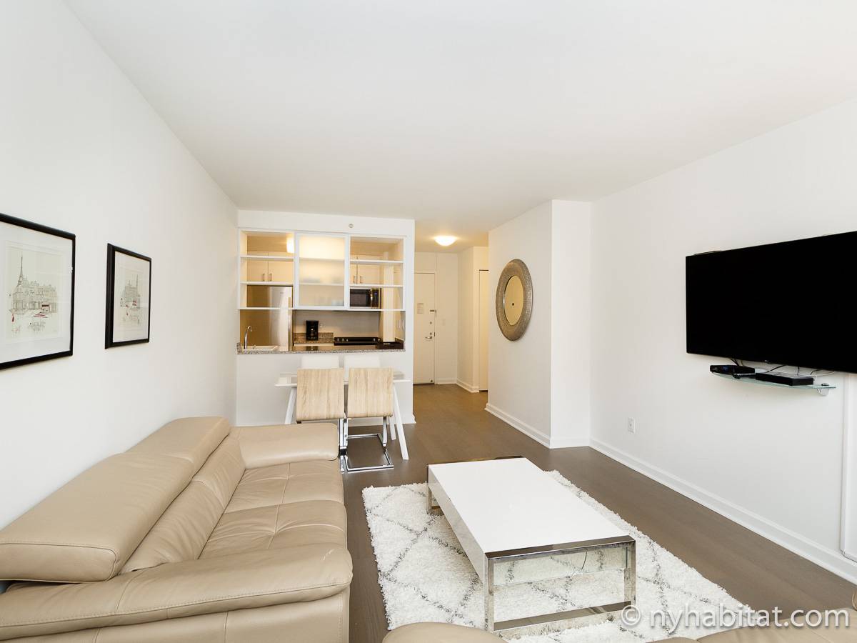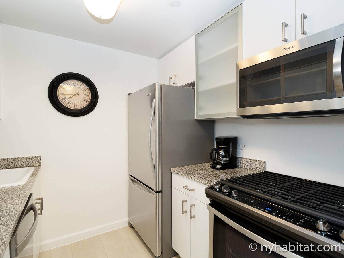 Alquile mensualmente este apartamento totalmente amueblado de 1 dormitorio en Midtown West, un barrio animado de Manhattan. Se encuentra en la quinta planta (equivalente a la cuarta planta en Europa) de un lujoso edificio de gran altura que cuenta con un conserje a tiempo completo, un patio-jardín, una azotea con terraza, gimnasio, cancha de baloncesto cubierta y servicio de lavandería, cerca de West 56th Street y 10th Avenue.