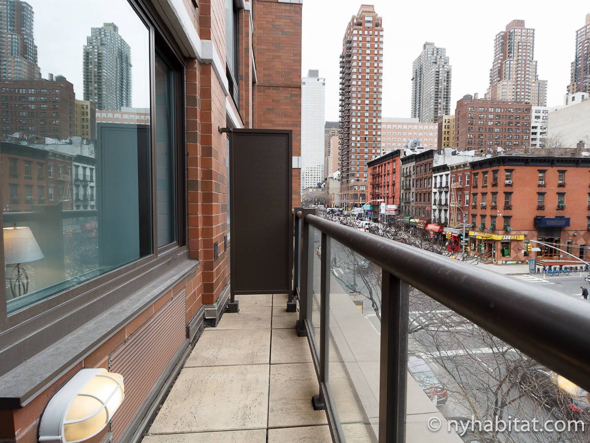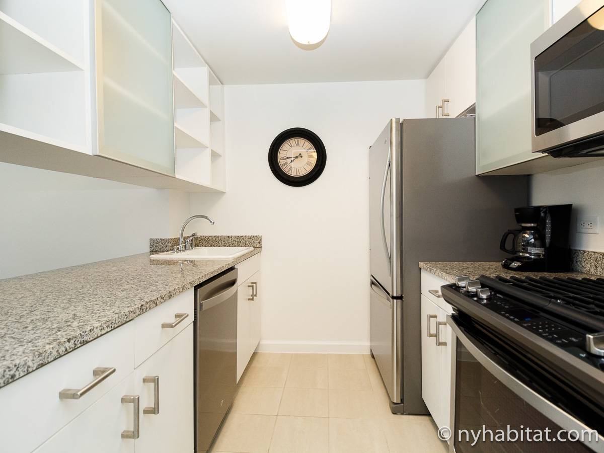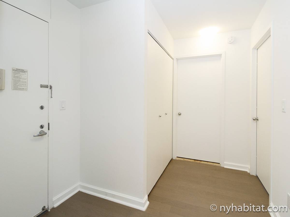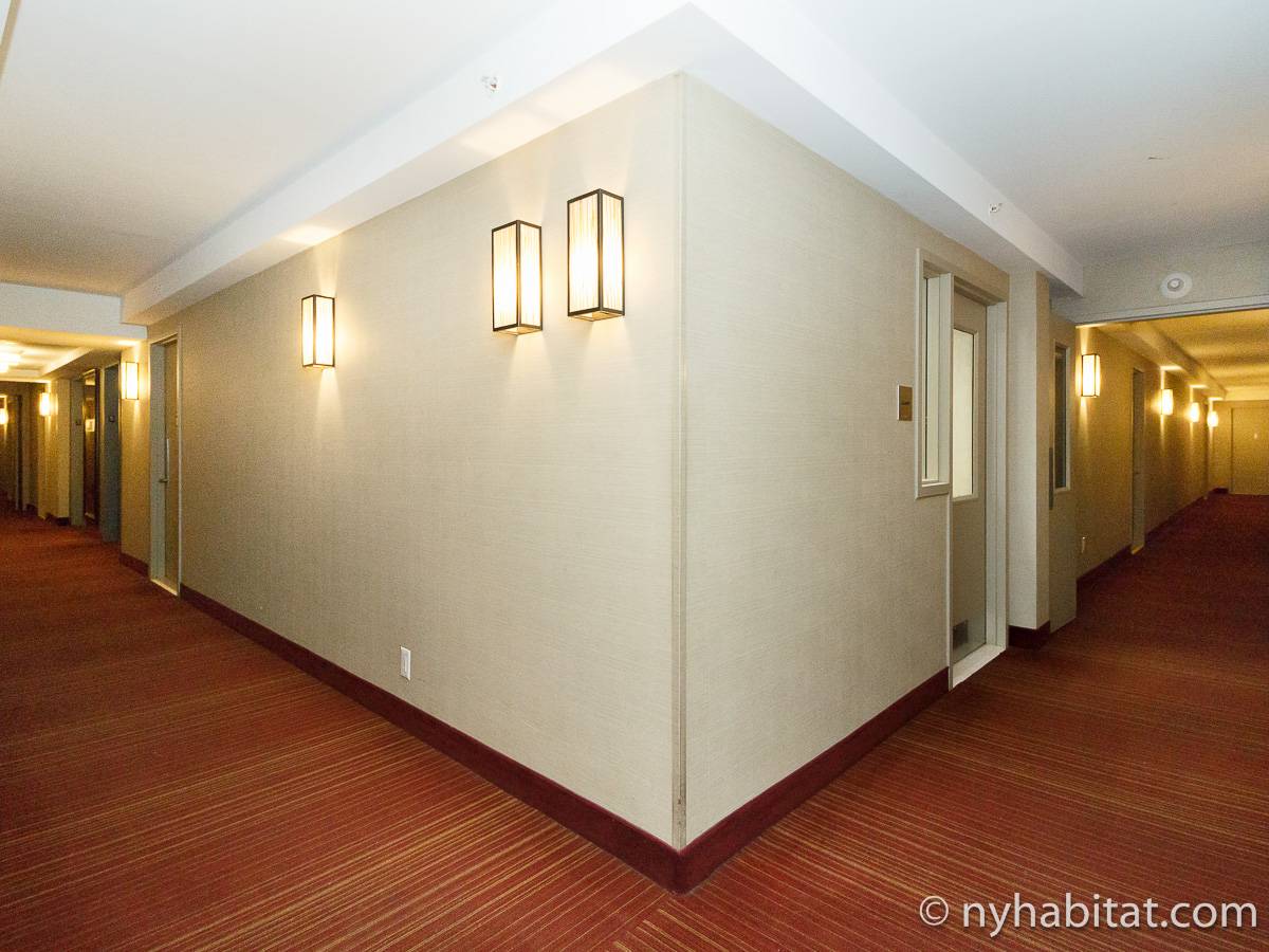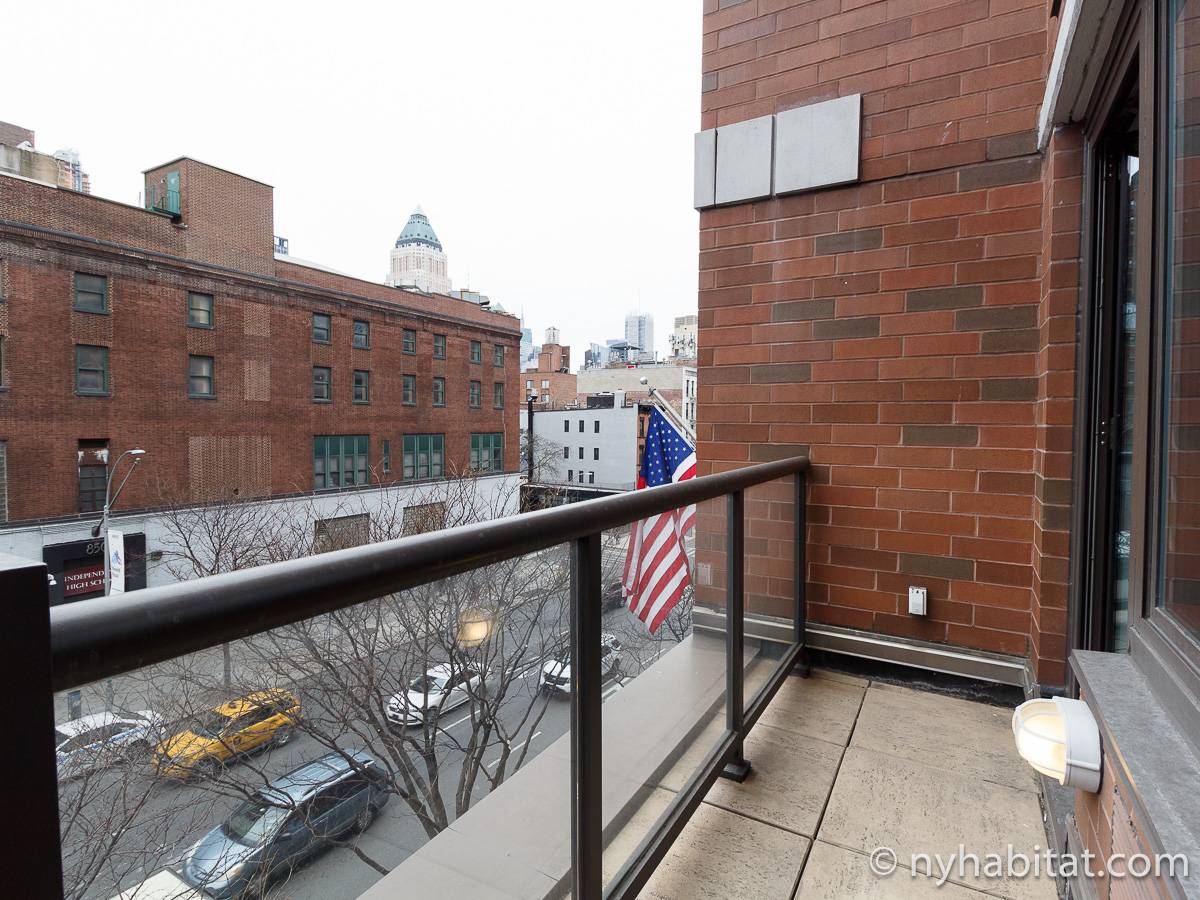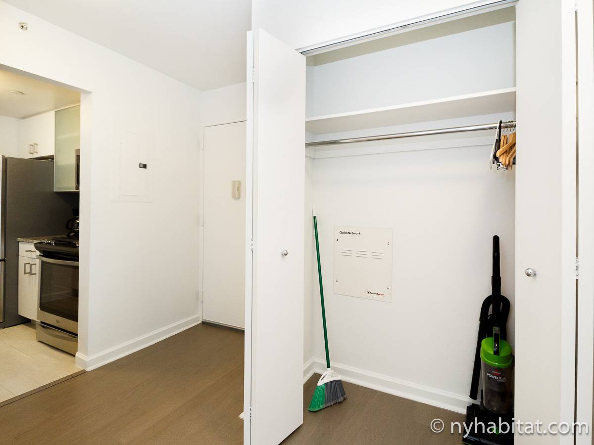 Alquile mensualmente este apartamento totalmente amueblado de 1 dormitorio en Midtown West, un barrio animado de Manhattan. Se encuentra en la quinta planta (equivalente a la cuarta planta en Europa) de un lujoso edificio de gran altura que cuenta con un conserje a tiempo completo, un patio-jardín, una azotea con terraza, gimnasio, cancha de baloncesto cubierta y servicio de lavandería, cerca de West 56th Street y 10th Avenue.