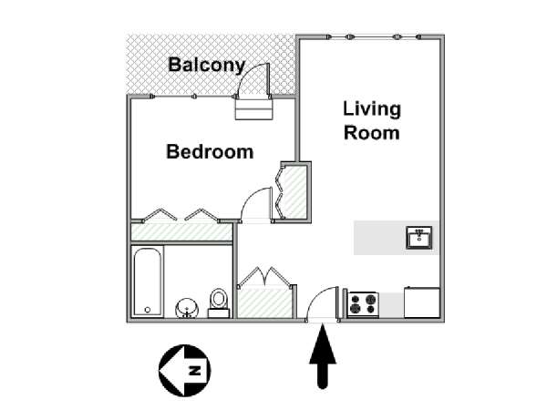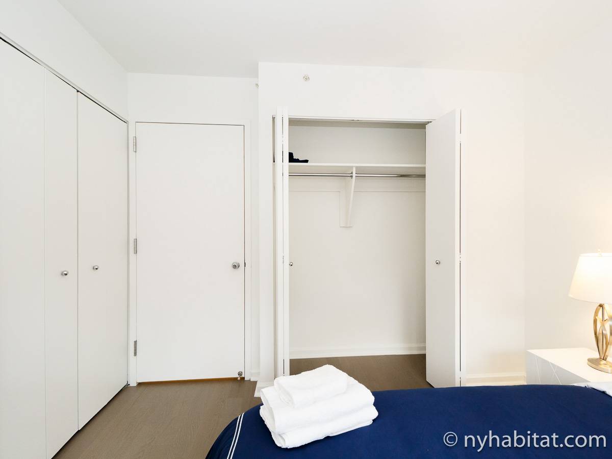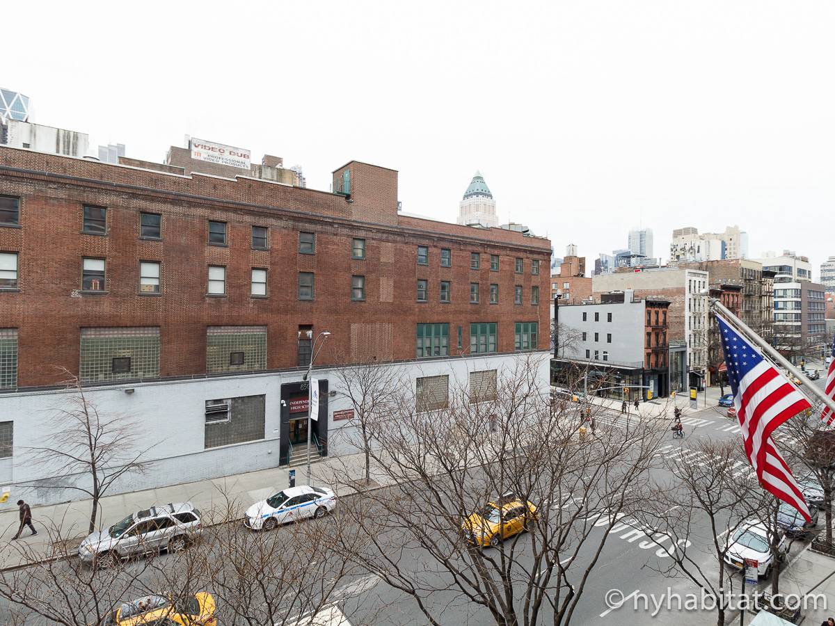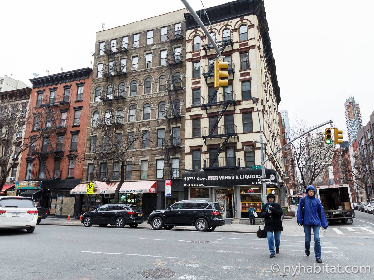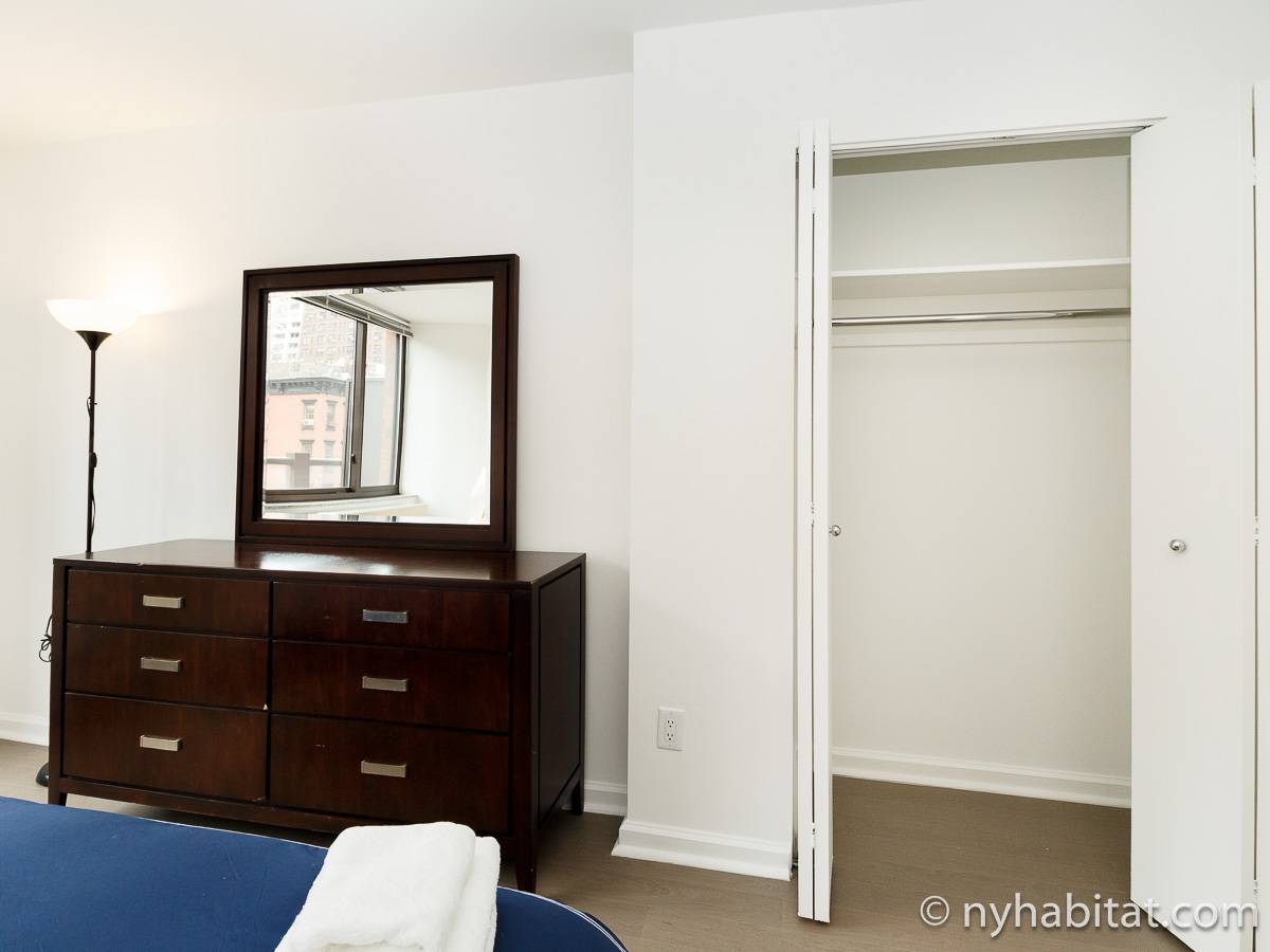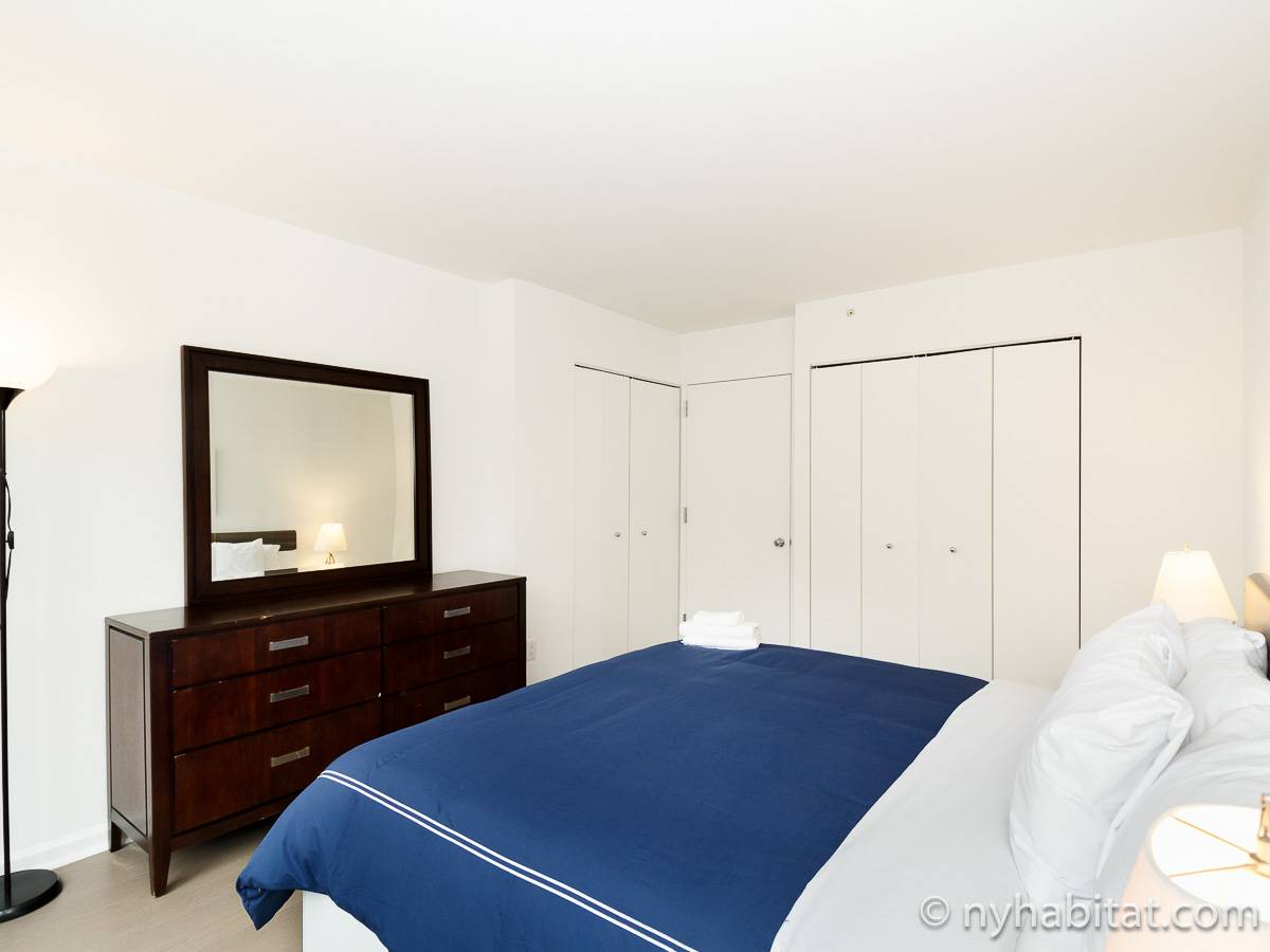 Alquile mensualmente este apartamento totalmente amueblado de 1 dormitorio en Midtown West, un barrio animado de Manhattan. Se encuentra en la quinta planta (equivalente a la cuarta planta en Europa) de un lujoso edificio de gran altura que cuenta con un conserje a tiempo completo, un patio-jardín, una azotea con terraza, gimnasio, cancha de baloncesto cubierta y servicio de lavandería, cerca de West 56th Street y 10th Avenue.