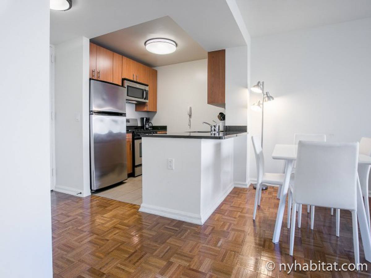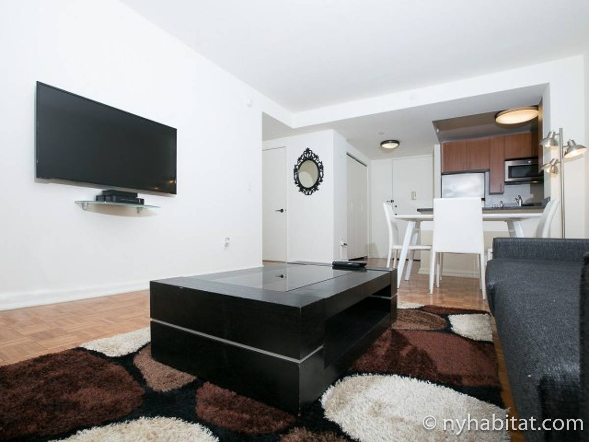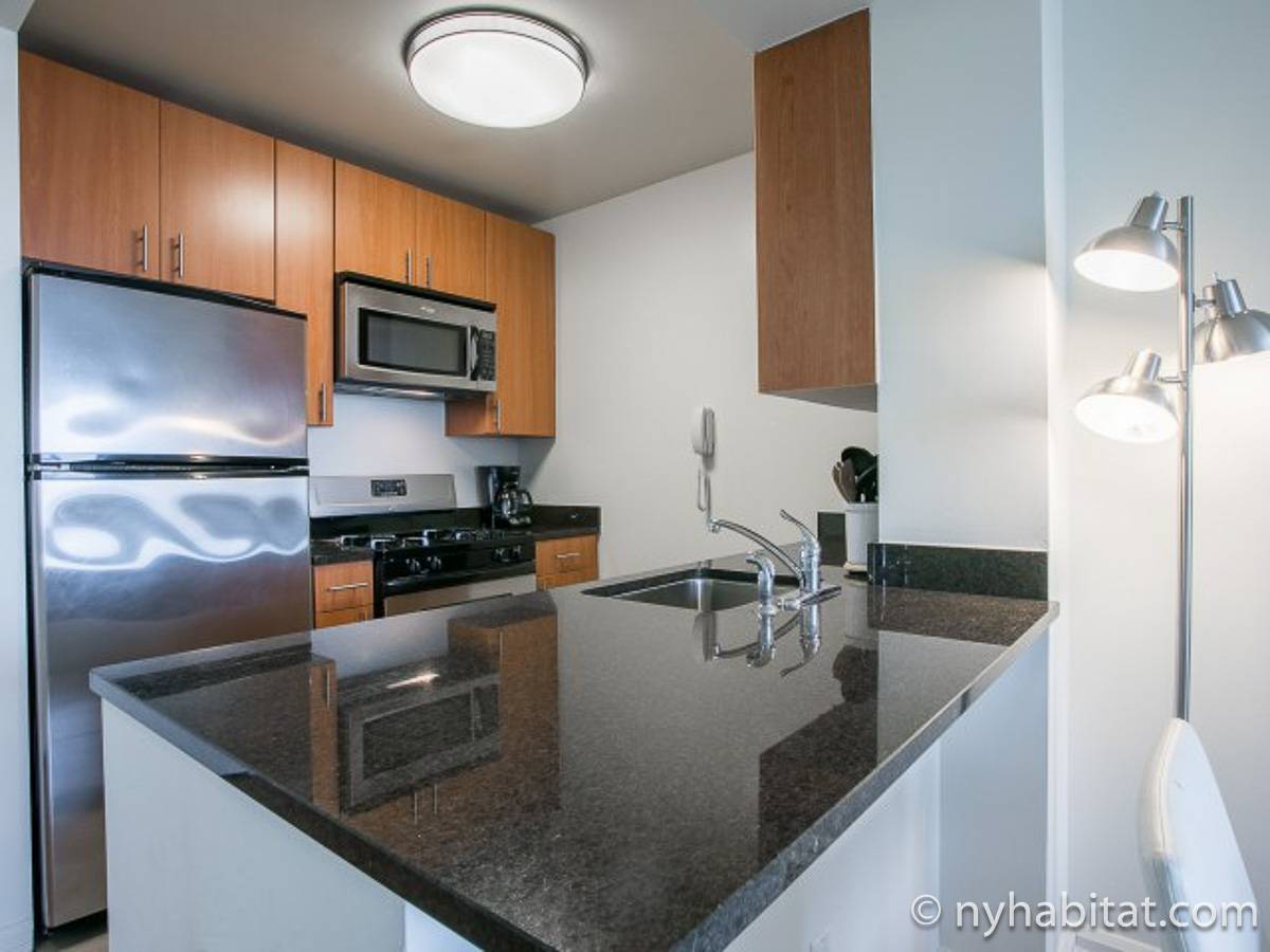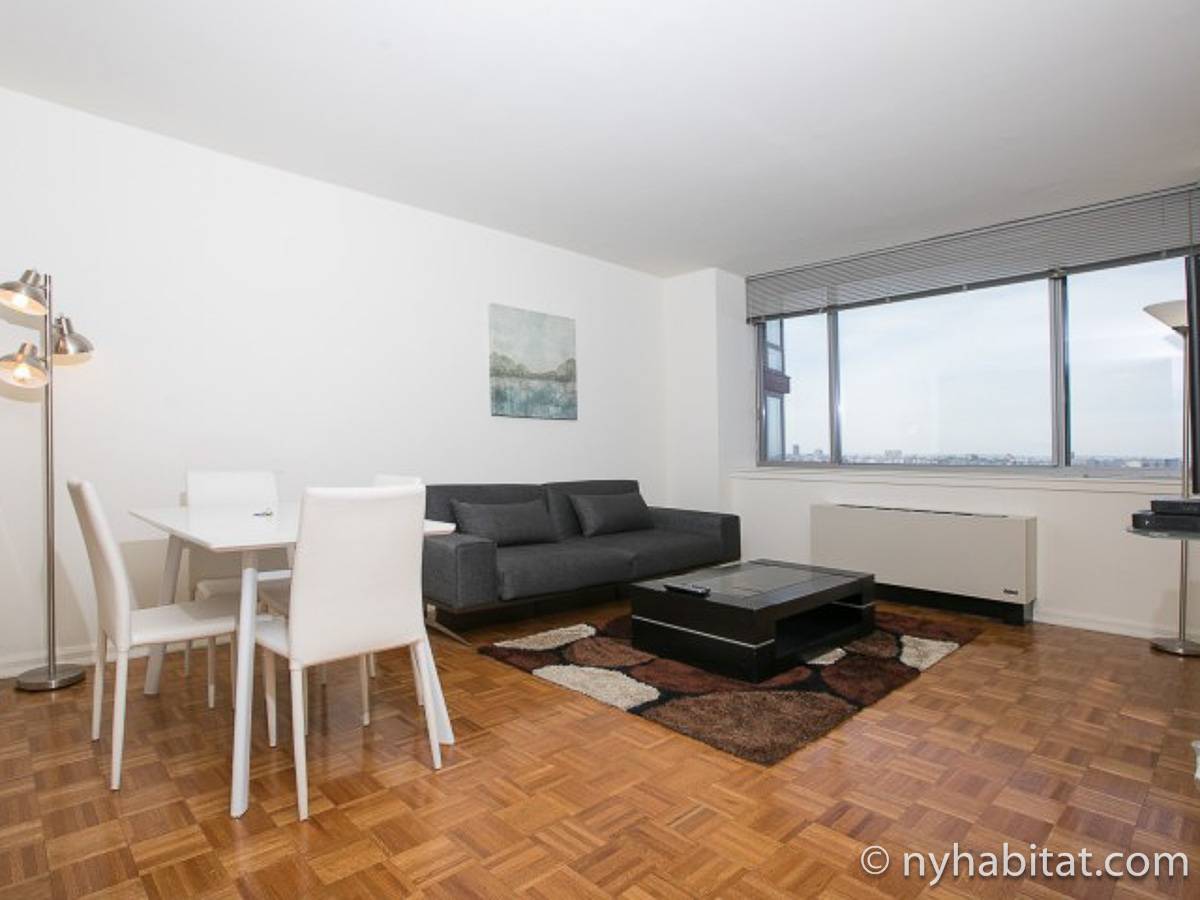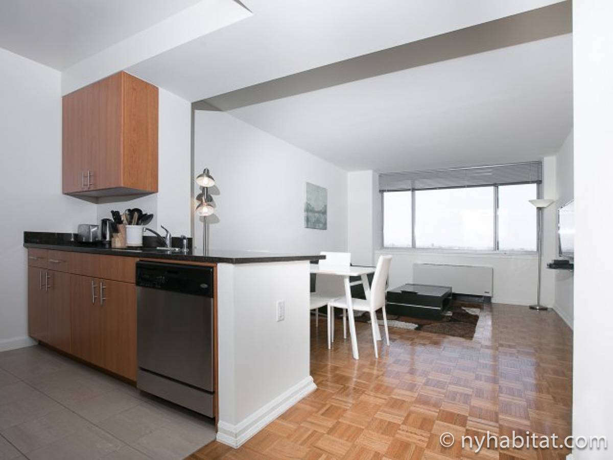Disfrute de las vistas desde un piso alto de este apartamento amueblado de 1 dormitorio de Nueva York con pisos de parqué por todo el espacio y mobiliario contemporáneo. Se puede descansar en la sala de estar amueblado con un sofá gris oscuro, una mesa de centro y un televisor de pantalla plana montado en la pared. Cerca de la cocina de concepto abierto hay una mesa de comedor para cuatro personas para sentarse a comer. La cocina está abierta a la sala de estar, lo que le permite socializar mientras prepara la comida en la cocina. Los armarios a medida de madera de cerezo y los electrodomésticos de acero inoxidable combinan con las encimeras de granito en este espacio. La cocina totalmente equipada incluye horno, microondas, frigorífico y un práctico lavavajillas integrado en la isla de la encimera. En el dormitorio puede relajarse en la cama tamaño queen y disfrutar de las vistas al río mientras se duerme. También hay otro televisor de pantalla plana en esta habitación para que pueda ver la televisión desde la comodidad de su cama. Dispone de armarios y una cómoda para guardar sus pertenencias. El baño ofrece una bañera/ducha junto con un gran espejo, inodoro y lavabo con almacenaje debajo. Se proporcionan sábanas y toallas.