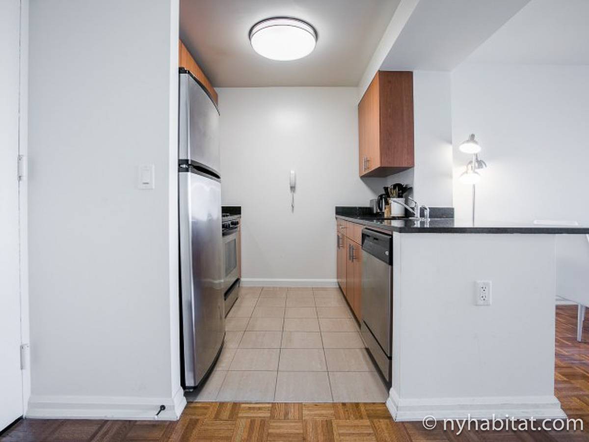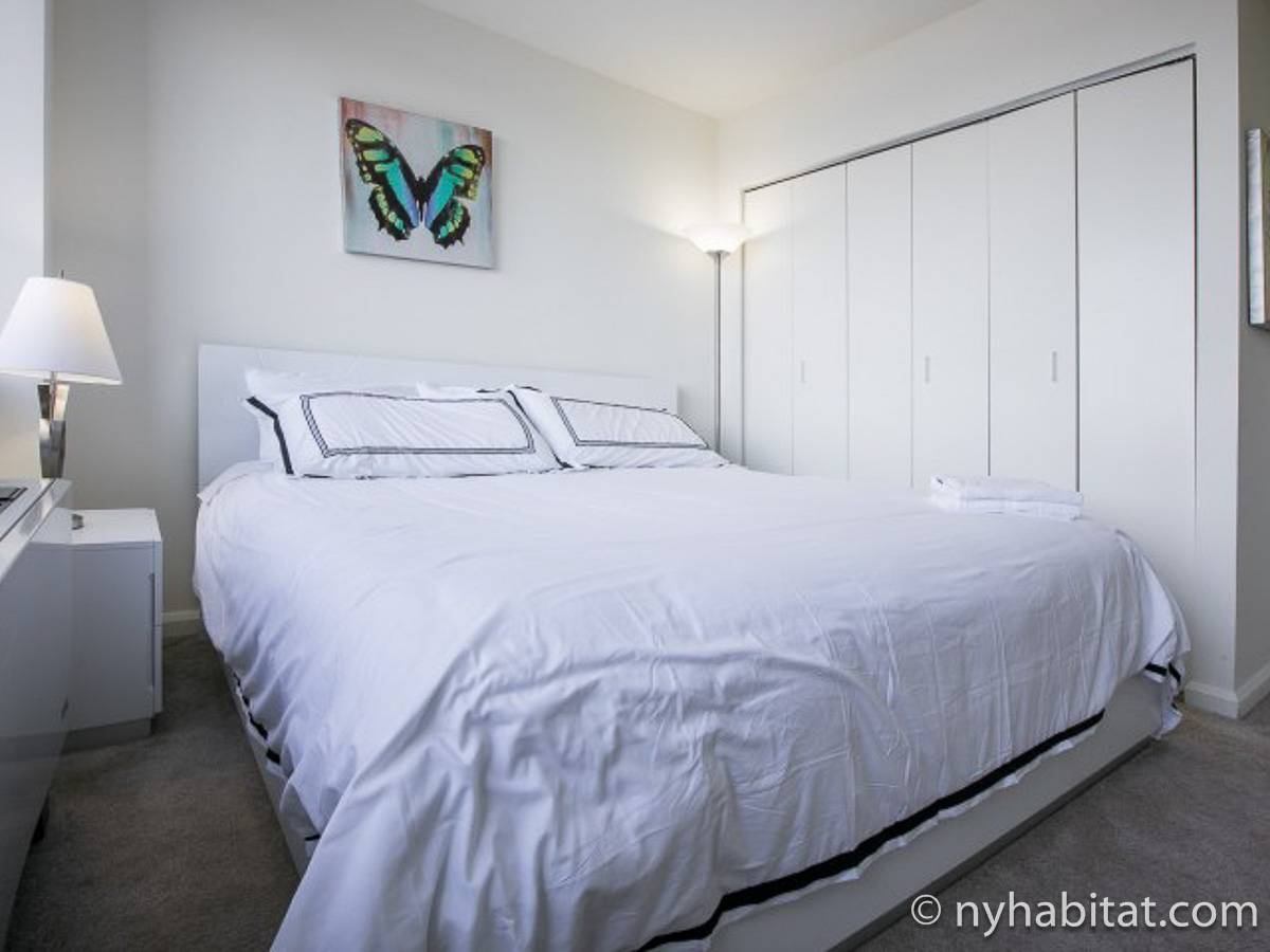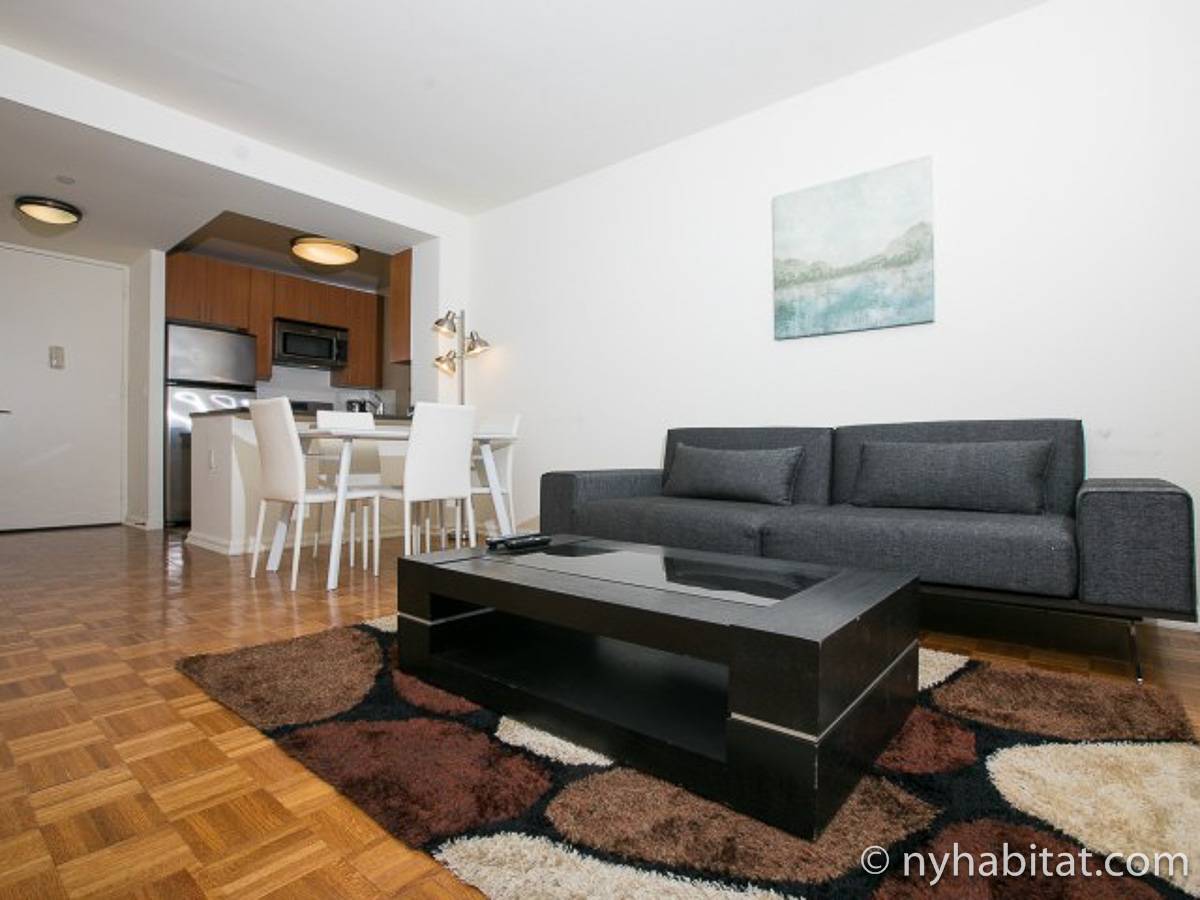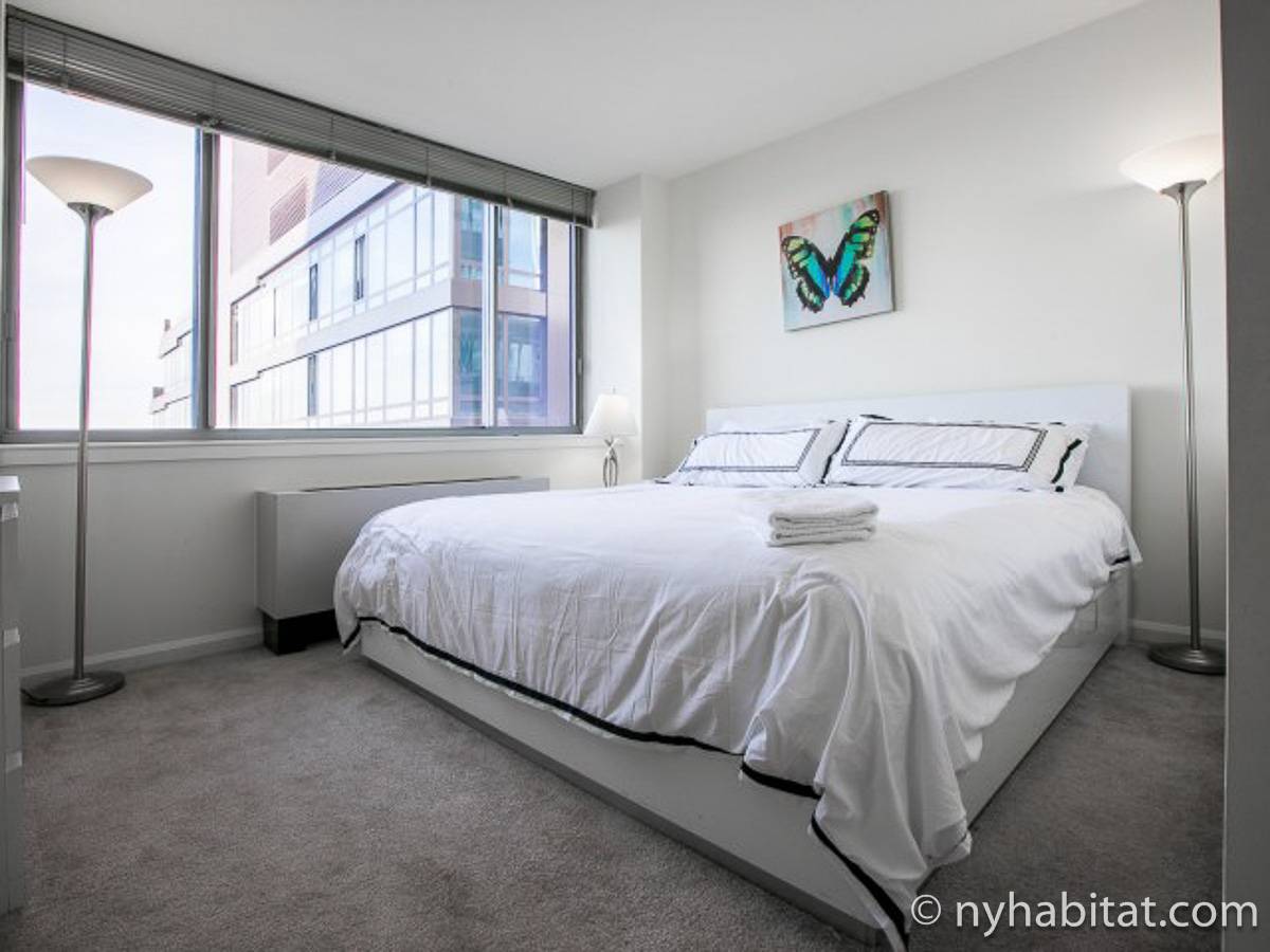 Disfrute de las vistas desde un piso alto de este apartamento amueblado de 1 dormitorio de Nueva York con pisos de parqué por todo el espacio y mobiliario contemporáneo. Se puede descansar en la sala de estar amueblado con un sofá gris oscuro, una mesa de centro y un televisor de pantalla plana montado en la pared. Cerca de la cocina de concepto abierto hay una mesa de comedor para cuatro personas para sentarse a comer. La cocina está abierta a la sala de estar, lo que le permite socializar mientras prepara la comida en la cocina. Los armarios a medida de madera de cerezo y los electrodomésticos de acero inoxidable combinan con las encimeras de granito en este espacio. La cocina totalmente equipada incluye horno, microondas, frigorífico y un práctico lavavajillas integrado en la isla de la encimera. En el dormitorio puede relajarse en la cama tamaño queen y disfrutar de las vistas al río mientras se duerme. También hay otro televisor de pantalla plana en esta habitación para que pueda ver la televisión desde la comodidad de su cama. Dispone de armarios y una cómoda para guardar sus pertenencias. El baño ofrece una bañera/ducha junto con un gran espejo, inodoro y lavabo con almacenaje debajo. Se proporcionan sábanas y toallas.