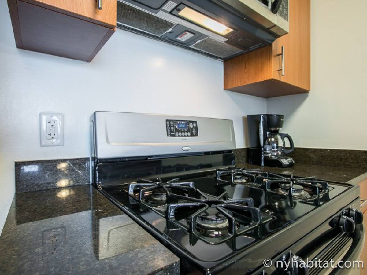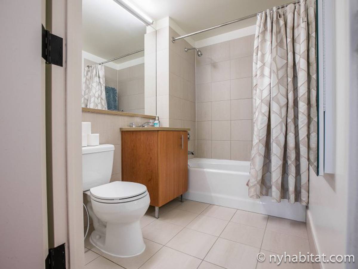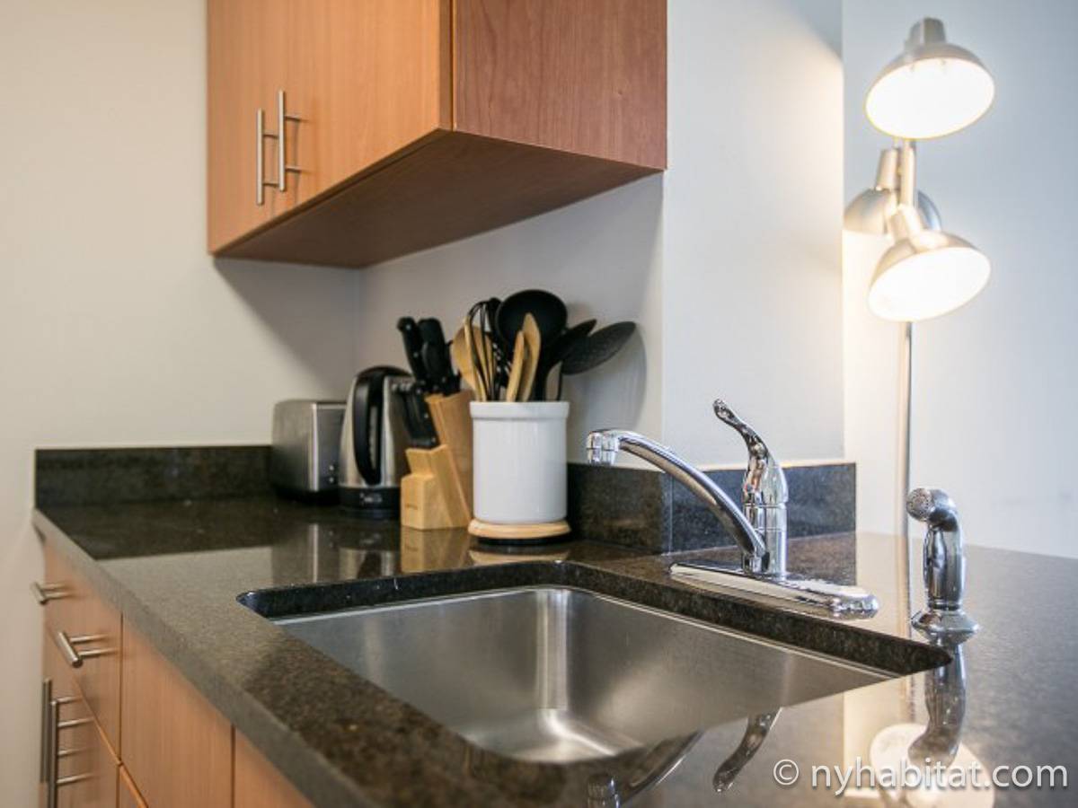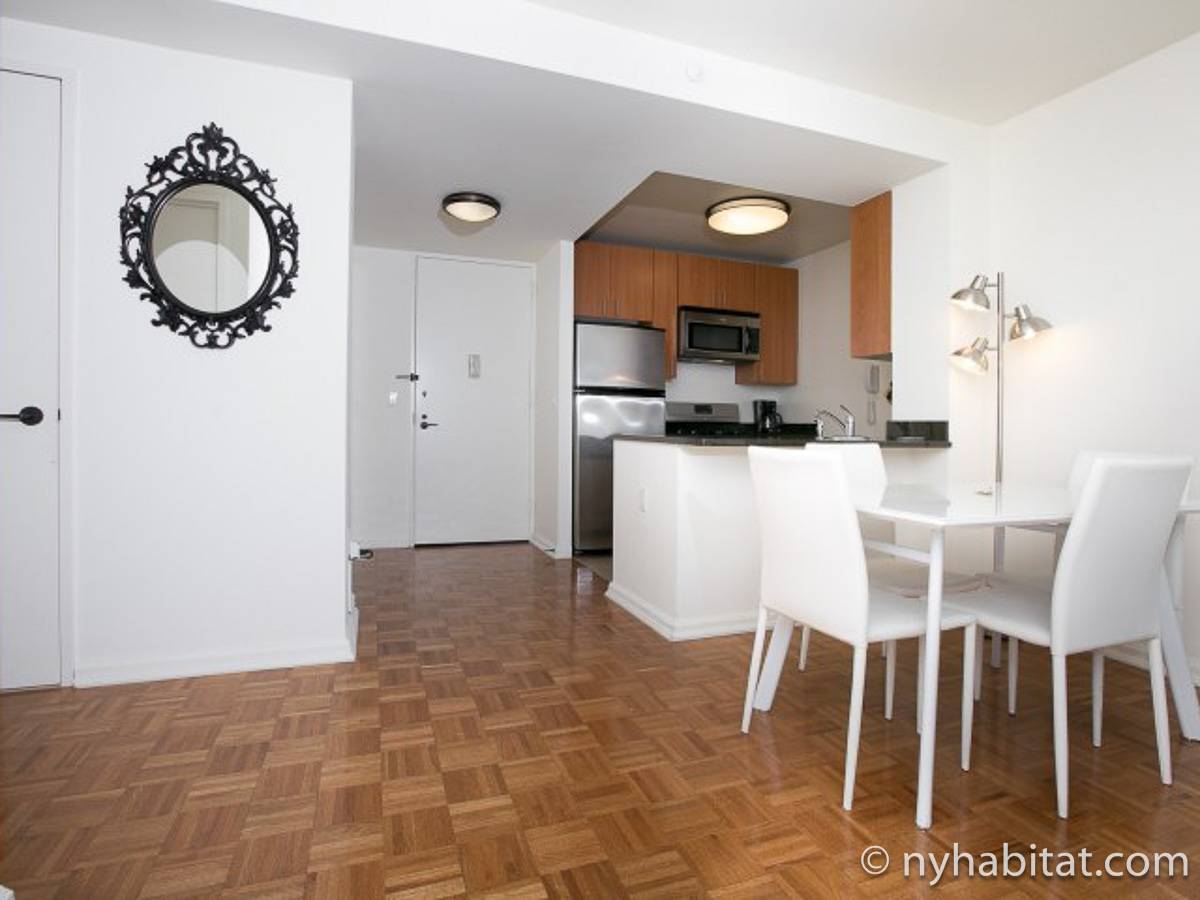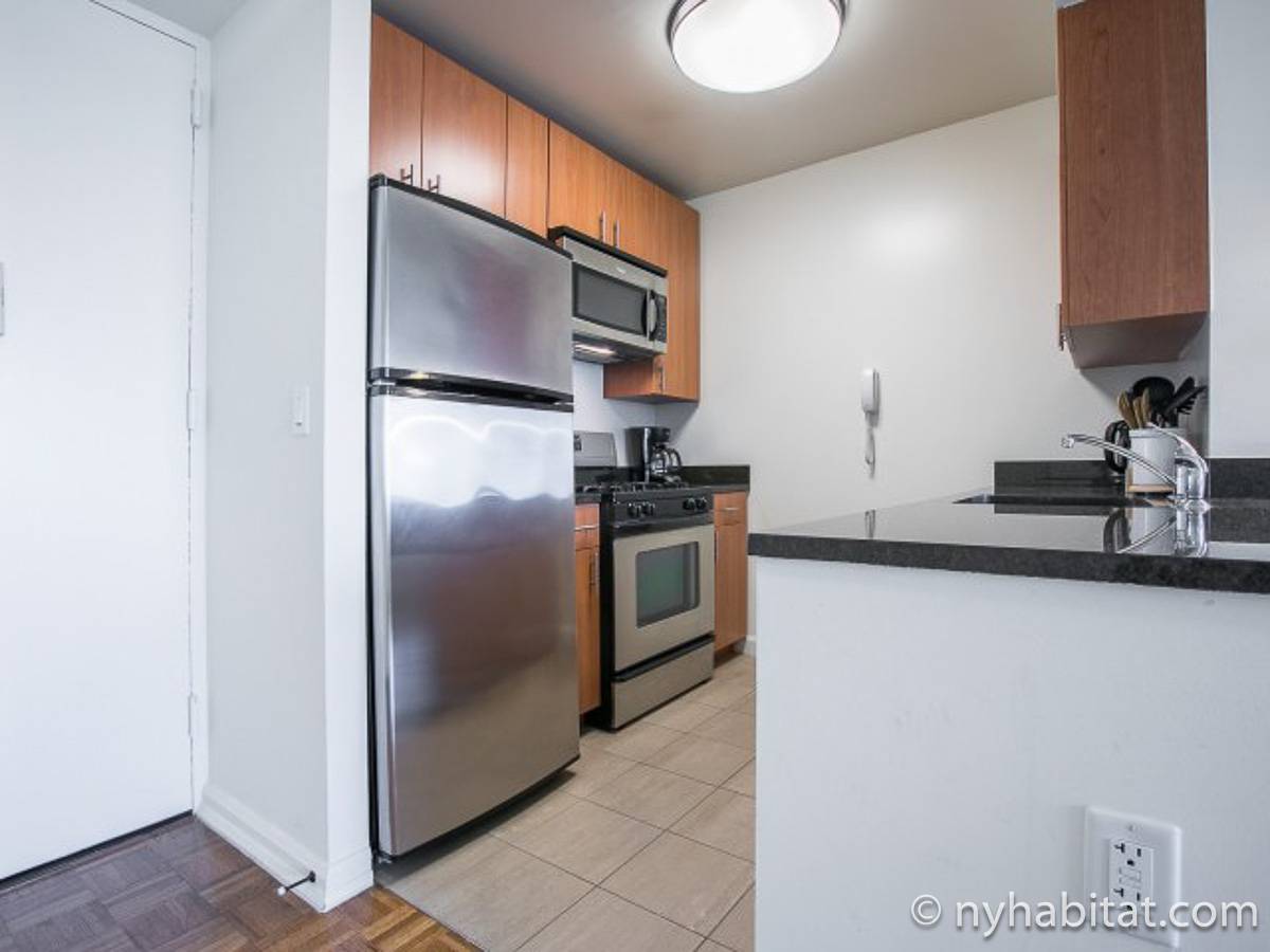 Disfrute de las vistas desde un piso alto de este apartamento amueblado de 1 dormitorio de Nueva York con pisos de parqué por todo el espacio y mobiliario contemporáneo. Se puede descansar en la sala de estar amueblado con un sofá gris oscuro, una mesa de centro y un televisor de pantalla plana montado en la pared. Cerca de la cocina de concepto abierto hay una mesa de comedor para cuatro personas para sentarse a comer. La cocina está abierta a la sala de estar, lo que le permite socializar mientras prepara la comida en la cocina. Los armarios a medida de madera de cerezo y los electrodomésticos de acero inoxidable combinan con las encimeras de granito en este espacio. La cocina totalmente equipada incluye horno, microondas, frigorífico y un práctico lavavajillas integrado en la isla de la encimera. En el dormitorio puede relajarse en la cama tamaño queen y disfrutar de las vistas al río mientras se duerme. También hay otro televisor de pantalla plana en esta habitación para que pueda ver la televisión desde la comodidad de su cama. Dispone de armarios y una cómoda para guardar sus pertenencias. El baño ofrece una bañera/ducha junto con un gran espejo, inodoro y lavabo con almacenaje debajo. Se proporcionan sábanas y toallas.