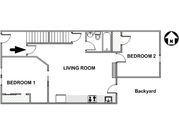 Este apartamento de 2 dormitorios recién renovado tiene suelos de madera de tonos claros y unos modernos acabados. La zona del salón cuenta con iluminación empotrada. La cocina abierta se extiende a lo largo de toda una pared y es perfecta para conversar mientras se cocina. La moderna y elegante cocina, revestida de blanco, está totalmente equipada para todas sus necesidades culinarias y cuenta con electrodomésticos de acero inoxidable, incluido un práctico lavavajillas. Una peculiar puerta de granero corrediza conduce al dormitorio #1, donde encontrará a dos grandes ventanales que dejan entrar la luz natural. El dormitorio #2 está en el extremo opuesto del apartamento, que da al jardín trasero. El cuarto de baño, de estilo moderno, está decorado en blanco con azulejos decorativos en el suelo y consta de bañera y ducha combinadas, lavabo con espacio de almacenamiento inferior, espejo de tocador redondo e inodoro. Desde el apartamento podrá acceder al jardín trasero.
