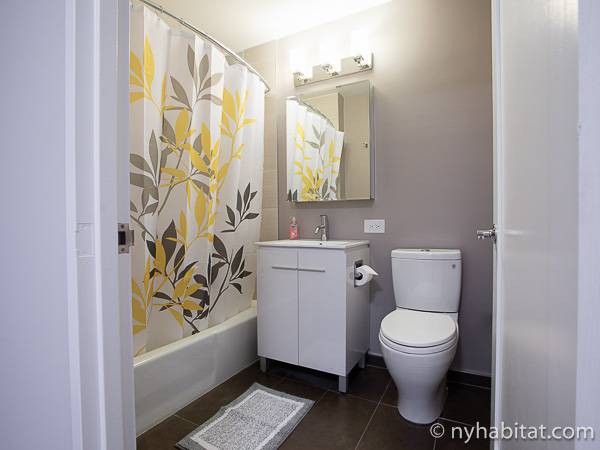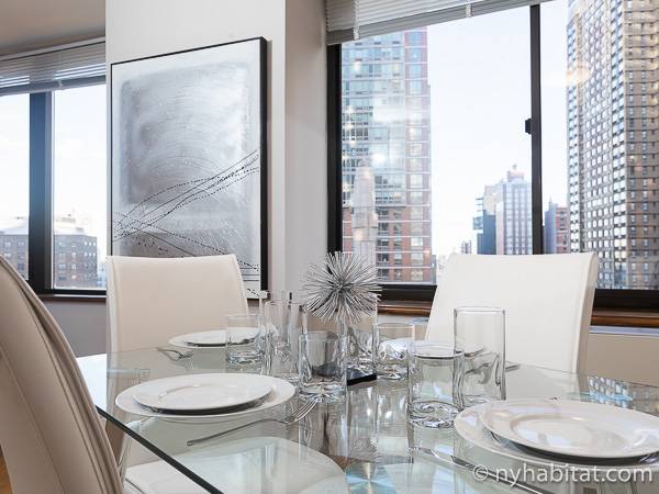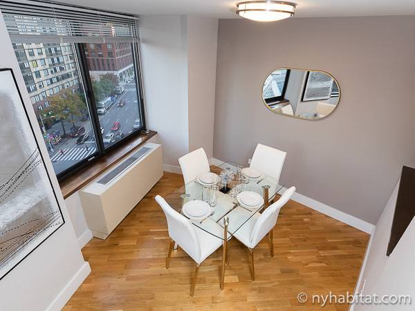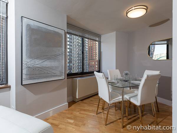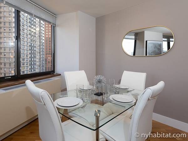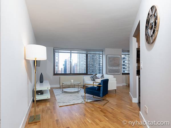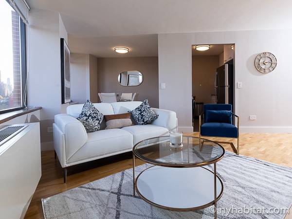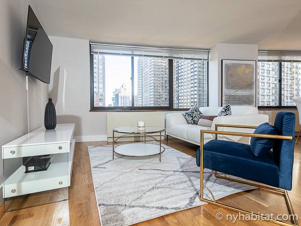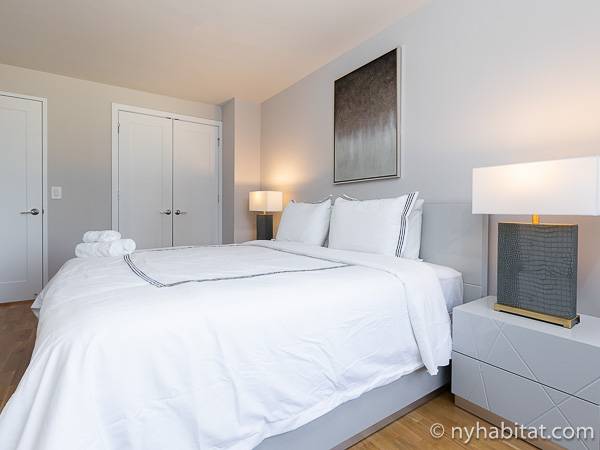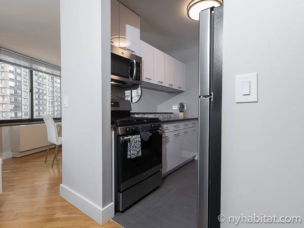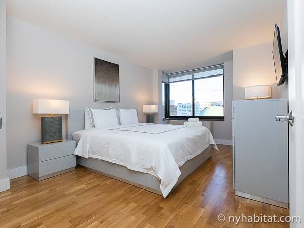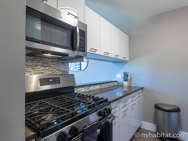 Este apartamento amueblado de un dormitorio está diseñado en tonos blancos y grises con algunos toques de color y suelos de madera. En el salón hay muchas ventanas con vistas a la ciudad, un sofá, un sillón, una mesa y una televisión de pantalla plana. En la esquina, encontrará una mesa de comedor de cristal para cuatro personas con sillas blancas donde podrá disfrutar de las vistas de Nueva York mientras cena. La cocina está diseñada con armarios blancos, encimeras de granito y electrodomésticos de acero inoxidable que incluyen un frigorífico, un horno de gas y un lavavajillas. La cocina tiene una zona de encimera que se abre a la zona de comedor para que pueda conversar con los invitados mientras prepara las comidas. El dormitorio tiene una cama tamaño queen y mobiliario gris claro que incluye mesas de noche y una cómoda junto con armarios a medida para guardar sus pertenencias. Hay otro televisor de pantalla plana en esta habitación. Se proporcionan sábanas y toallas. El cuarto de baño tiene una combinación de bañera y ducha, un lavabo con armarios debajo, un espejo y un inodoro.