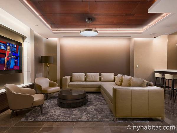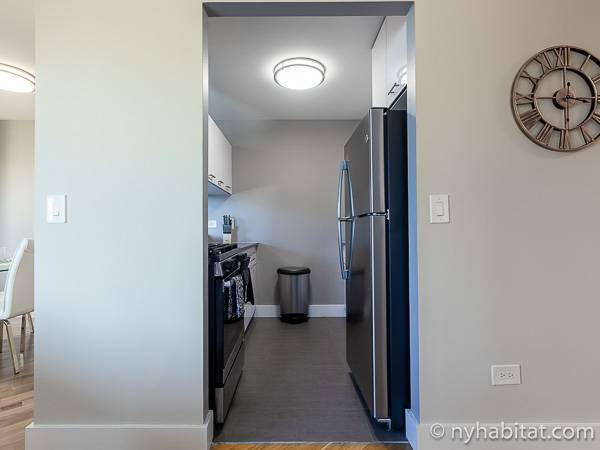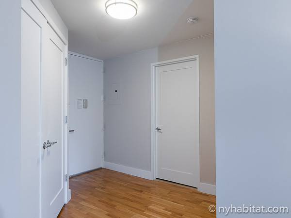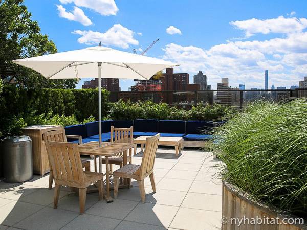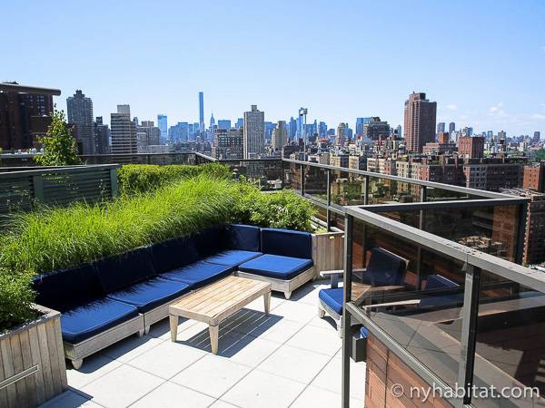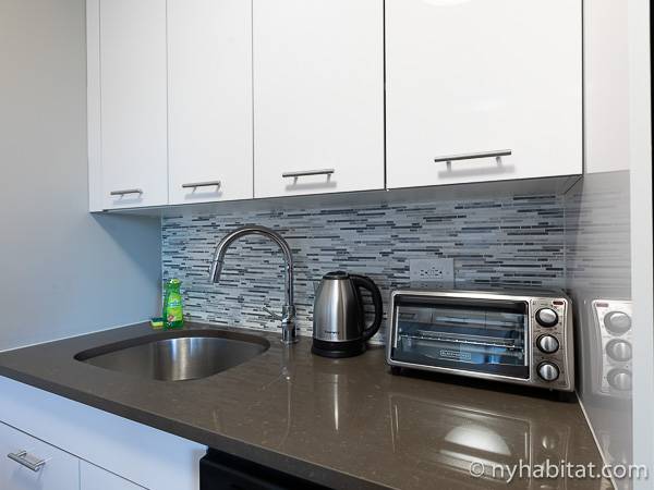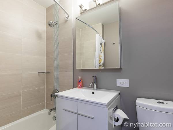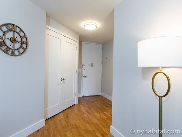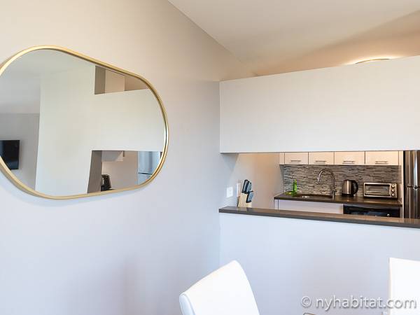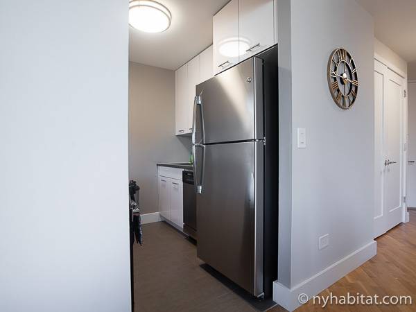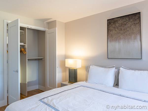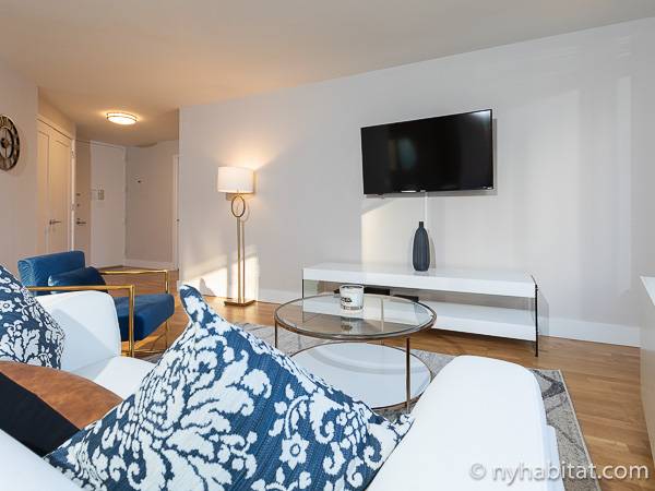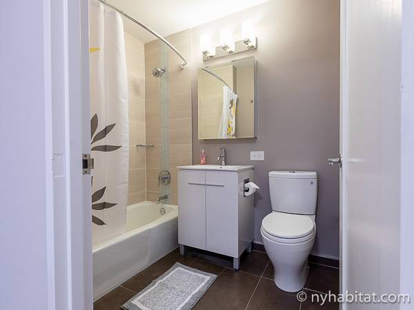 Este apartamento amueblado de un dormitorio está diseñado en tonos blancos y grises con algunos toques de color y suelos de madera. En el salón hay muchas ventanas con vistas a la ciudad, un sofá, un sillón, una mesa y una televisión de pantalla plana. En la esquina, encontrará una mesa de comedor de cristal para cuatro personas con sillas blancas donde podrá disfrutar de las vistas de Nueva York mientras cena. La cocina está diseñada con armarios blancos, encimeras de granito y electrodomésticos de acero inoxidable que incluyen un frigorífico, un horno de gas y un lavavajillas. La cocina tiene una zona de encimera que se abre a la zona de comedor para que pueda conversar con los invitados mientras prepara las comidas. El dormitorio tiene una cama tamaño queen y mobiliario gris claro que incluye mesas de noche y una cómoda junto con armarios a medida para guardar sus pertenencias. Hay otro televisor de pantalla plana en esta habitación. Se proporcionan sábanas y toallas. El cuarto de baño tiene una combinación de bañera y ducha, un lavabo con armarios debajo, un espejo y un inodoro.