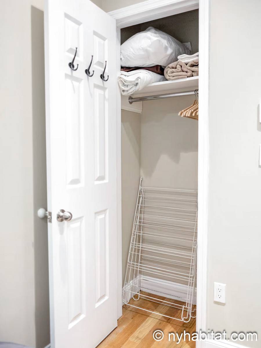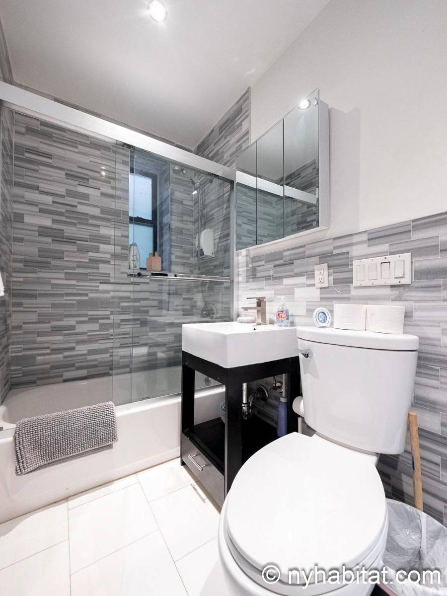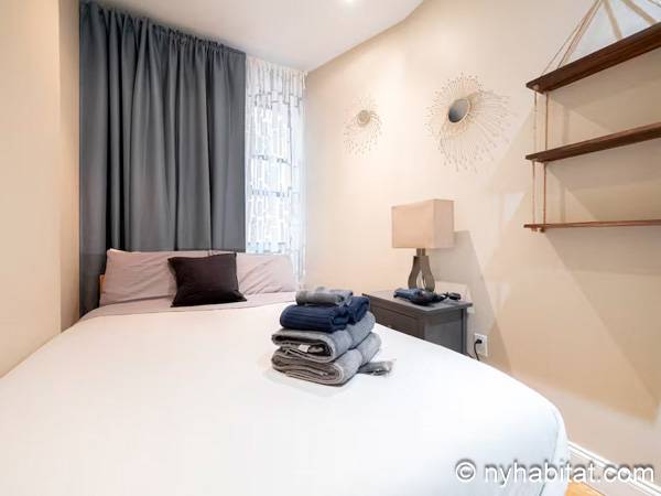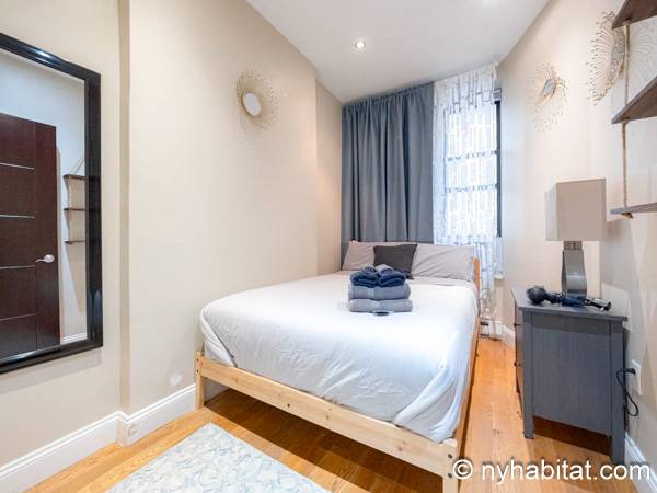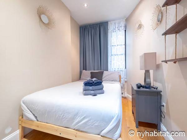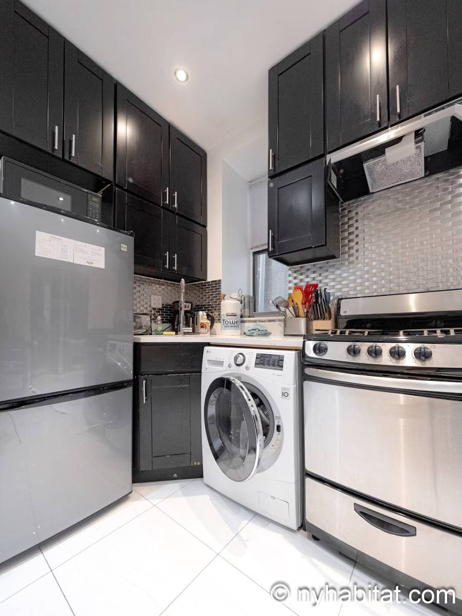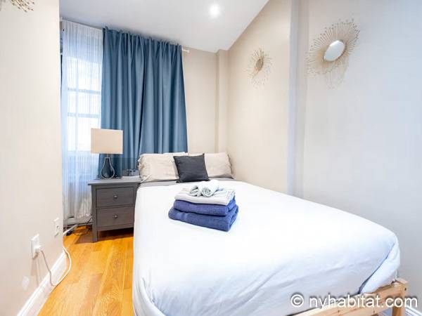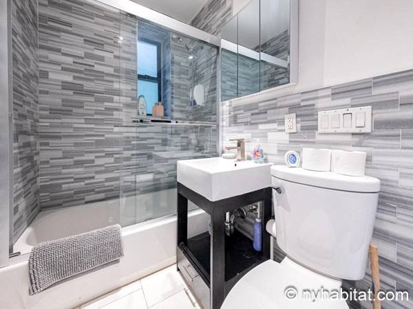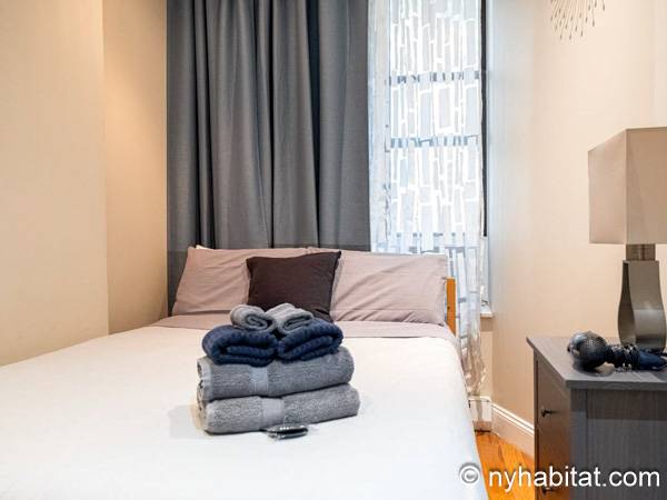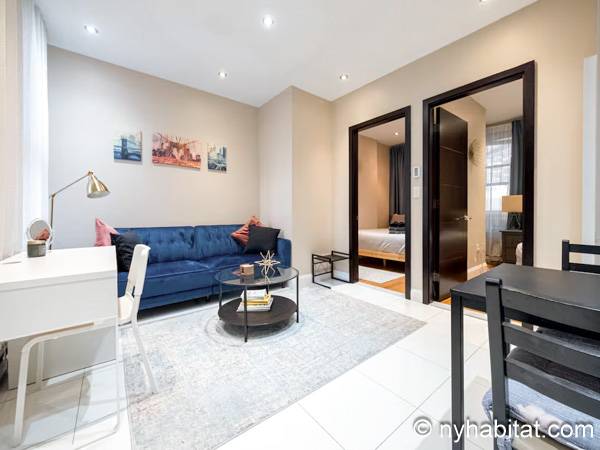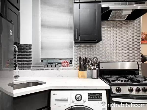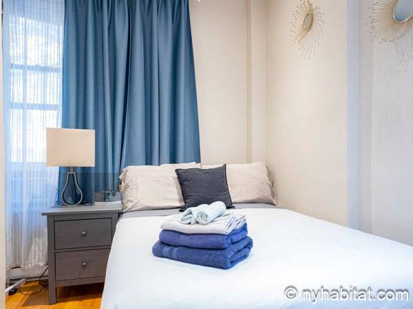 Este apartamento está ubicado en la quinta planta, o cuarta planta europea, de un edificio construido en el año 1930. Al llegar al nuevo apartamento, se encuentra la cocina abierta. La cocina tiene armarios oscuros, un salpicadero moderno y una lavadora. También está equipada con un frigorífico, un congelador, una tostadora, un microondas, una cafetera, un lavavajillas y un horno. También se puede ver una mesa de comedor para 4 personas como las transiciones de espacio a la sala de estar. El salón es hogareño y cómodo, con un sofá cama convertible, una alfombra, un escritorio, una silla, una mesa de café y un televisor por cable. En el otro extremo de la sala de estar están las 2 puertas en cada dormitorio. Ambos dormitorios están completamente amueblados, e incluyen una cama tamaño full con sábanas, una mesa de noche, cortinas, una alfombra y una unidad de aire acondicionado. Y, por último, el baño moderno de mármol gris y blanco tiene una ducha-bañera con una puerta corredera de cristal, también con un inodoro y toallas para su uso.