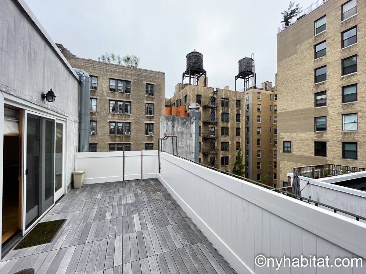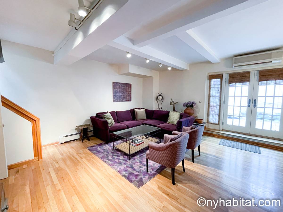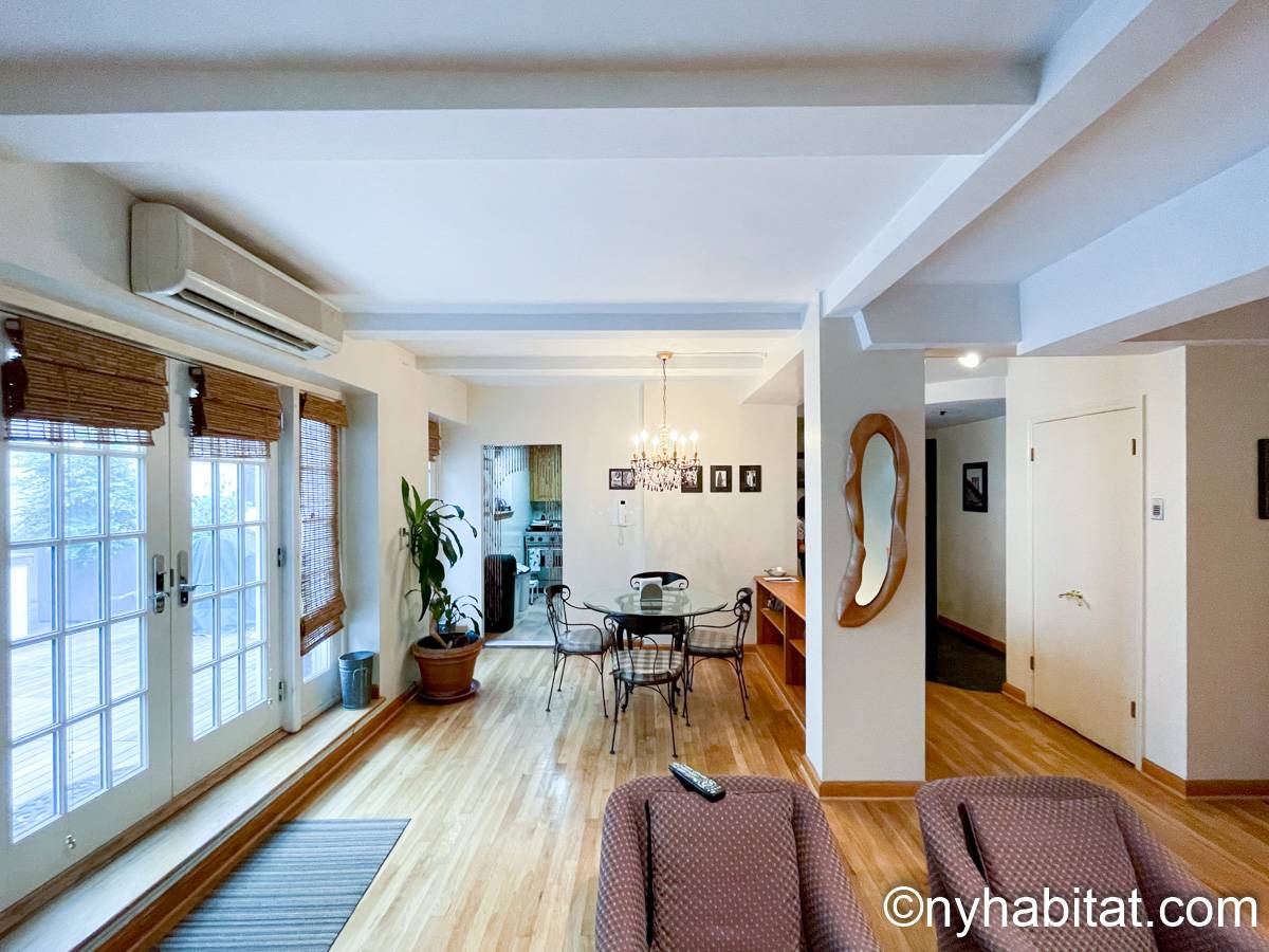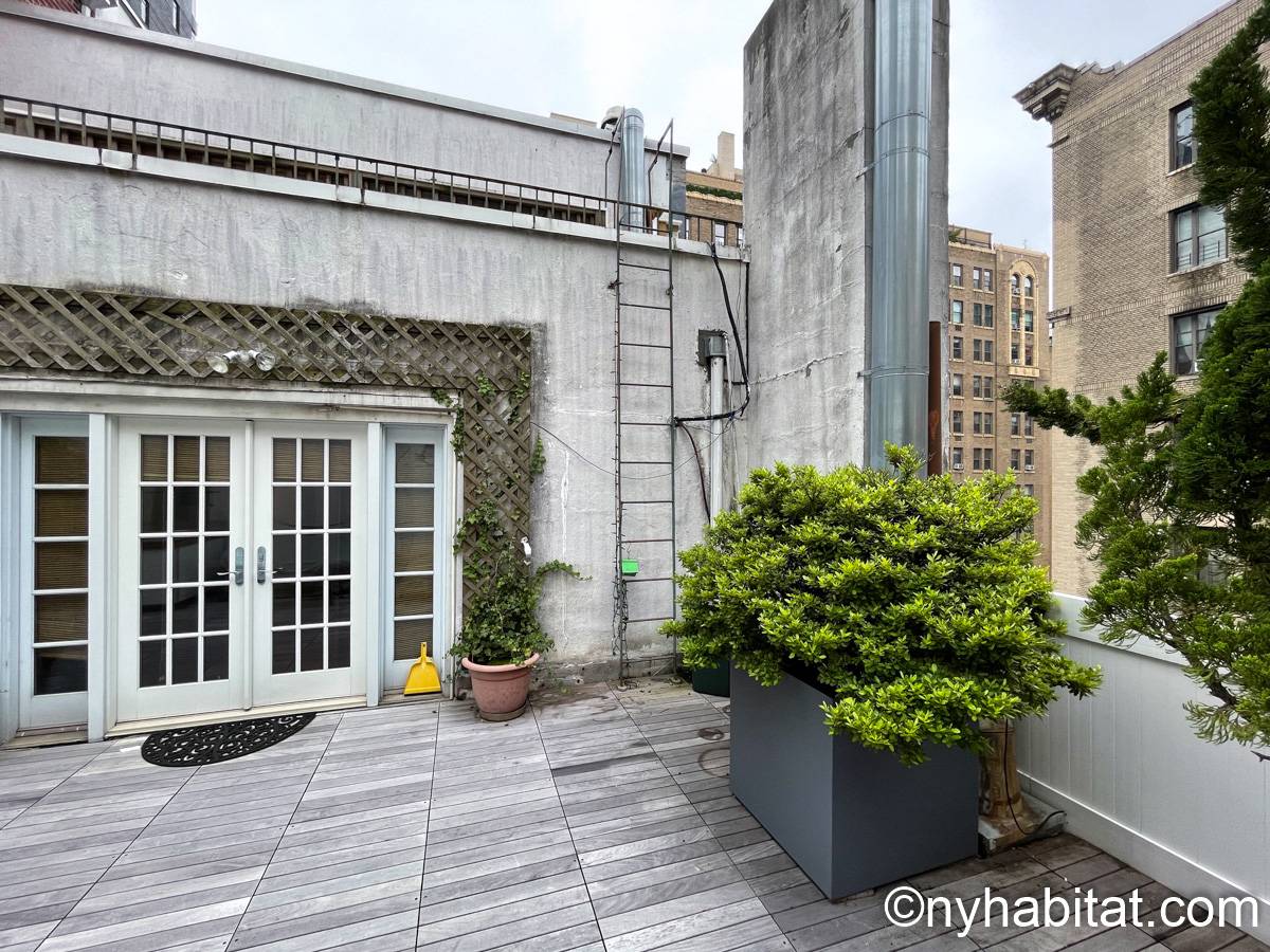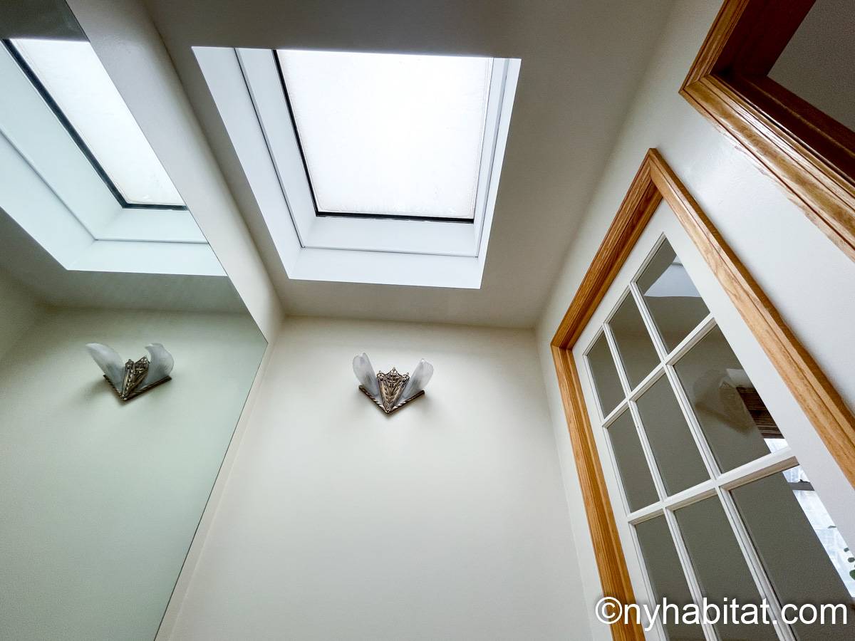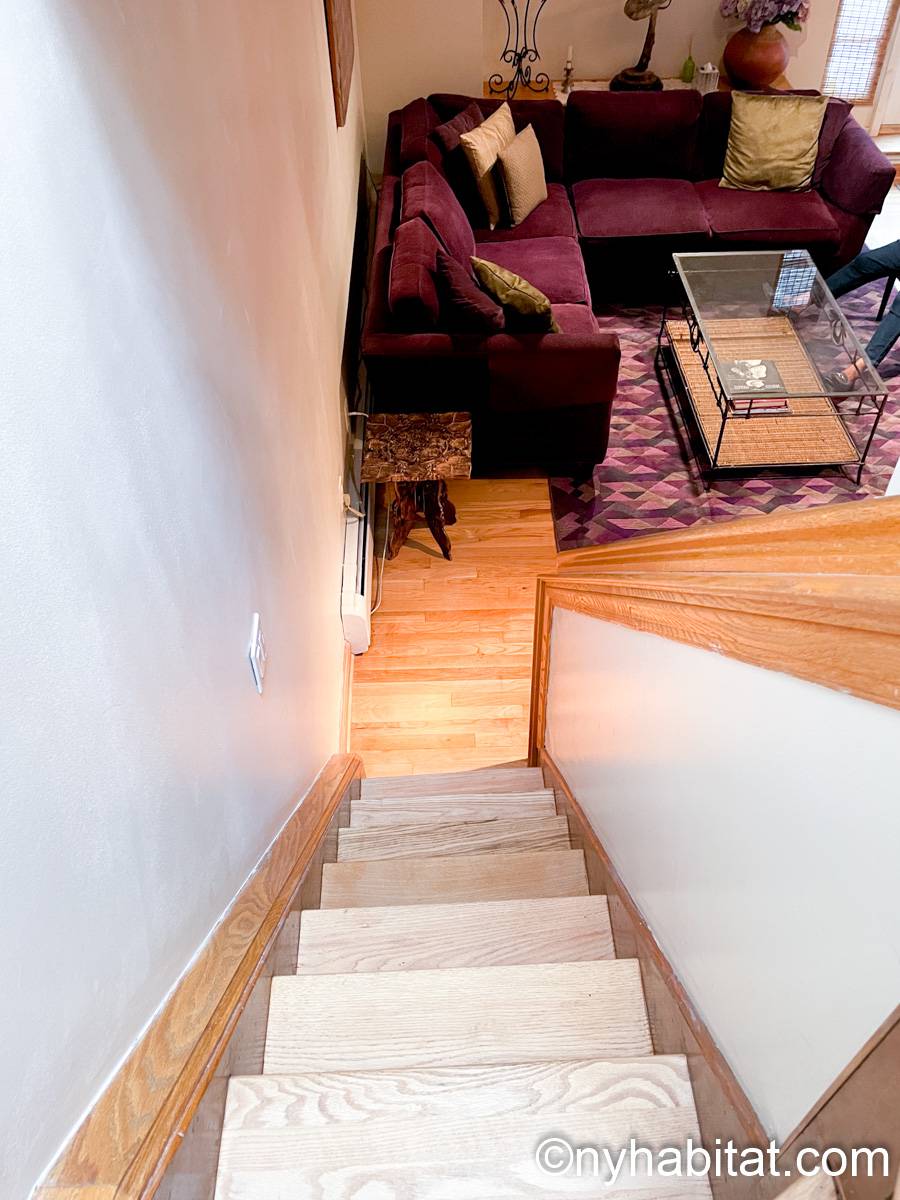 Como para la mayoría de los neoyorquinos, no es habitual que el ascensor dé directamente al apartamento. Al entrar en este edificio construido en los años 30, uno se siente y vive como un auténtico neoyorquino. Este apartamento dúplex está situado en las plantas sexta y séptima del edificio (plantas cinco y seis para los europeos). En el salón, lo reciben unas puertas que lo llevan al exterior, a la terraza. El salón cuenta aire acondicionado. En la cocina, tiene una nevera y congelador, microondas, cafetera, tostadora, lavavajillas, una estufa de cuatro quemadores con un horno, y una ventana para mirar hacia fuera recordándole que está cocinando con una vista de Manhattan. Los dos dormitorios están con un aire acondicionado y ventanas. Los cuartos de baño disponen de un combo de bañera-ducha, un váter, un espejo y un lavabo con espacio debajo para artículos de aseo.
