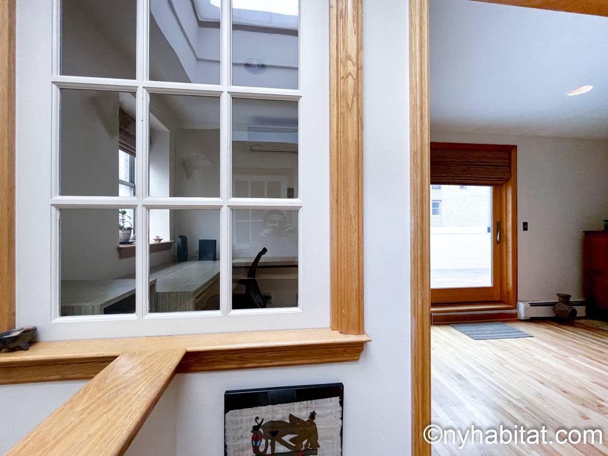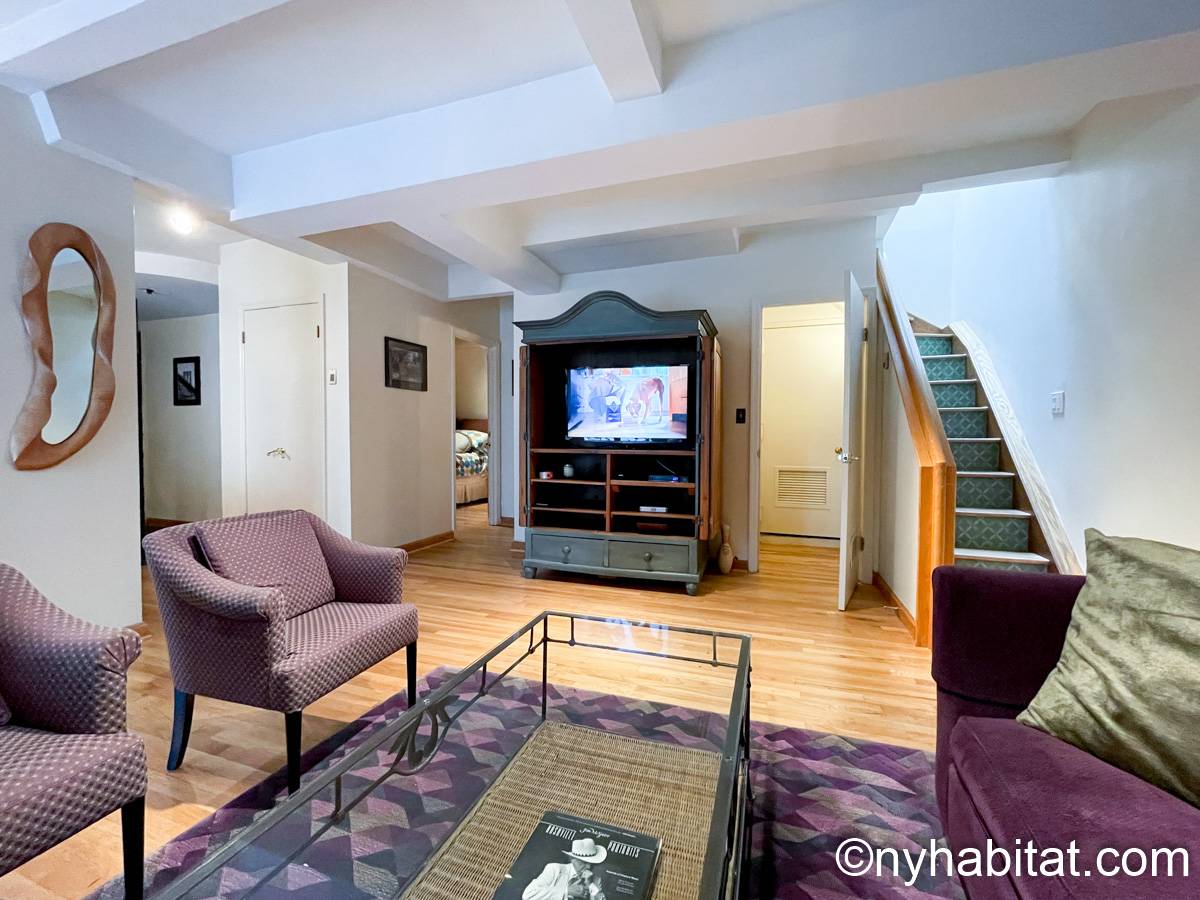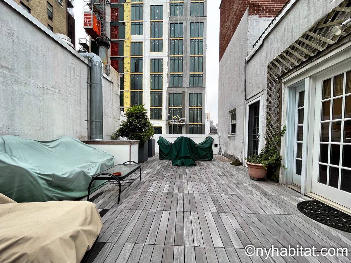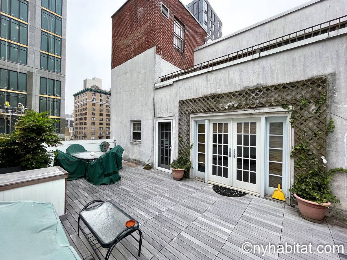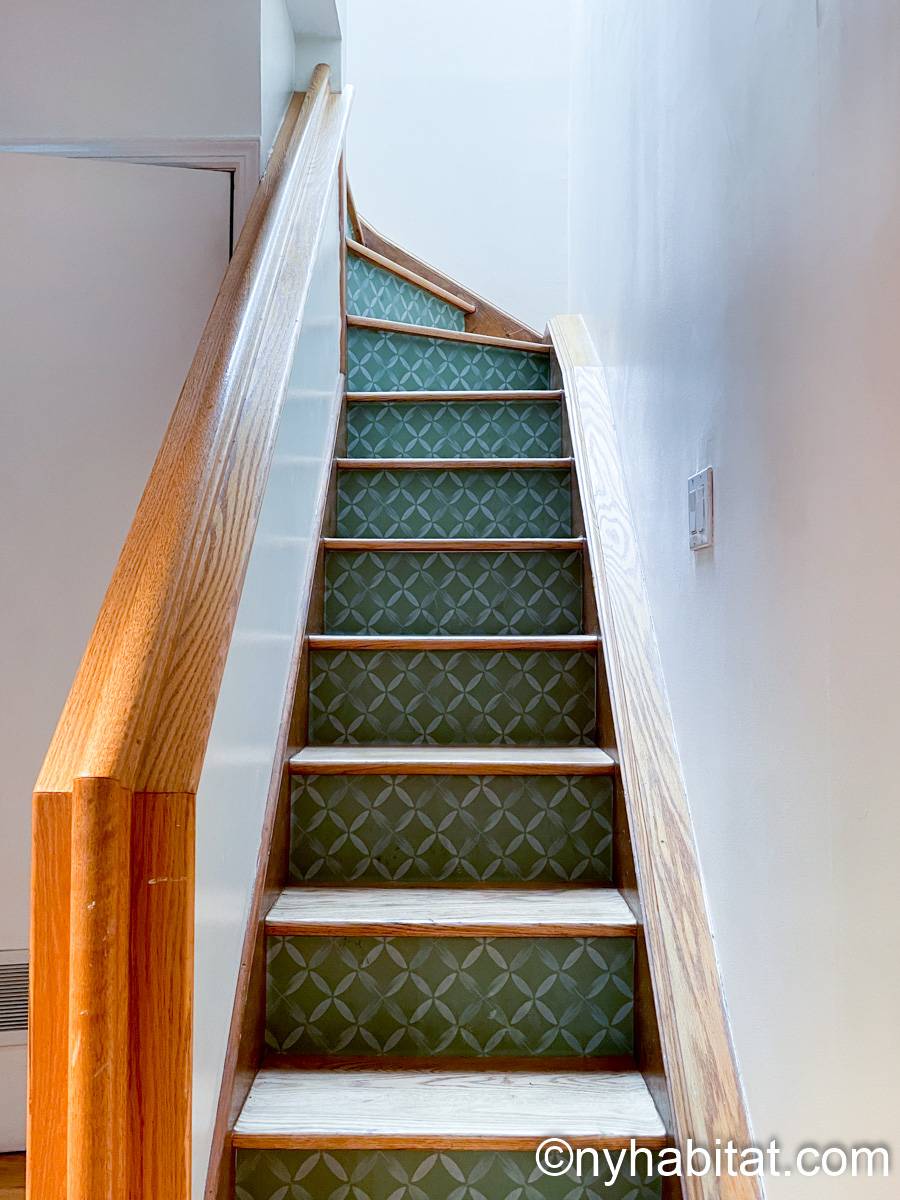 Como para la mayoría de los neoyorquinos, no es habitual que el ascensor dé directamente al apartamento. Al entrar en este edificio construido en los años 30, uno se siente y vive como un auténtico neoyorquino. Este apartamento dúplex está situado en las plantas sexta y séptima del edificio (plantas cinco y seis para los europeos). En el salón, lo reciben unas puertas que lo llevan al exterior, a la terraza. El salón cuenta aire acondicionado. En la cocina, tiene una nevera y congelador, microondas, cafetera, tostadora, lavavajillas, una estufa de cuatro quemadores con un horno, y una ventana para mirar hacia fuera recordándole que está cocinando con una vista de Manhattan. Los dos dormitorios están con un aire acondicionado y ventanas. Los cuartos de baño disponen de un combo de bañera-ducha, un váter, un espejo y un lavabo con espacio debajo para artículos de aseo.
