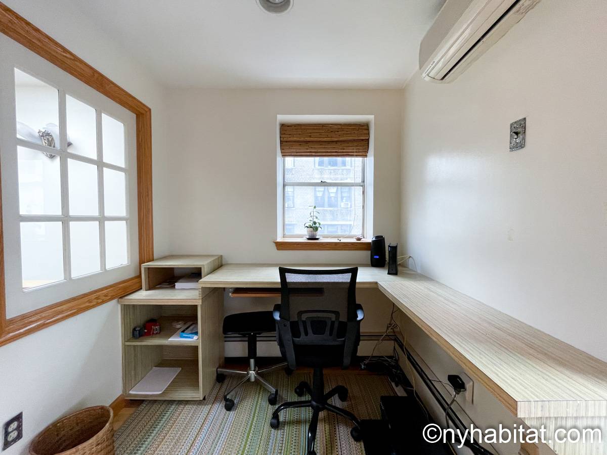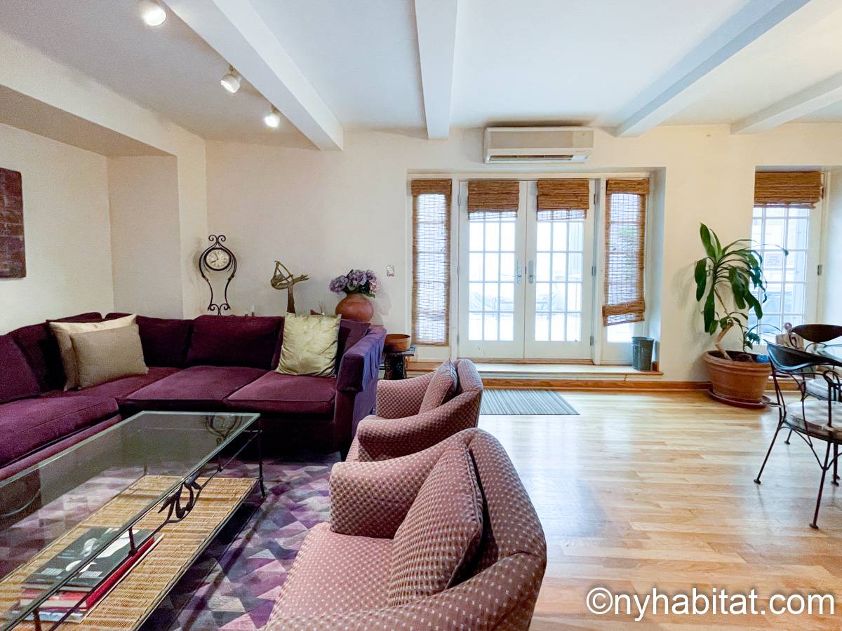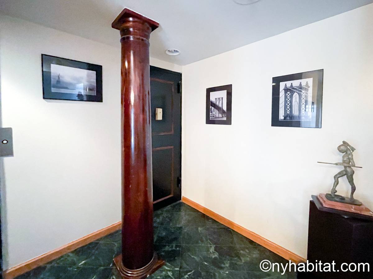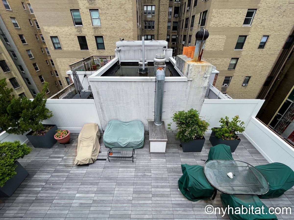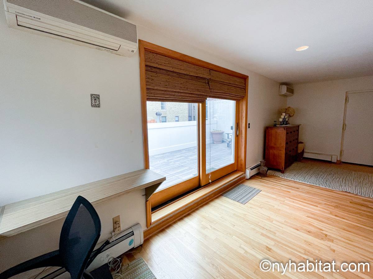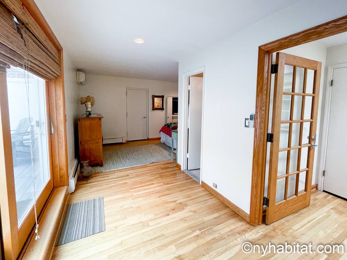 Como para la mayoría de los neoyorquinos, no es habitual que el ascensor dé directamente al apartamento. Al entrar en este edificio construido en los años 30, uno se siente y vive como un auténtico neoyorquino. Este apartamento dúplex está situado en las plantas sexta y séptima del edificio (plantas cinco y seis para los europeos). En el salón, lo reciben unas puertas que lo llevan al exterior, a la terraza. El salón cuenta aire acondicionado. En la cocina, tiene una nevera y congelador, microondas, cafetera, tostadora, lavavajillas, una estufa de cuatro quemadores con un horno, y una ventana para mirar hacia fuera recordándole que está cocinando con una vista de Manhattan. Los dos dormitorios están con un aire acondicionado y ventanas. Los cuartos de baño disponen de un combo de bañera-ducha, un váter, un espejo y un lavabo con espacio debajo para artículos de aseo.