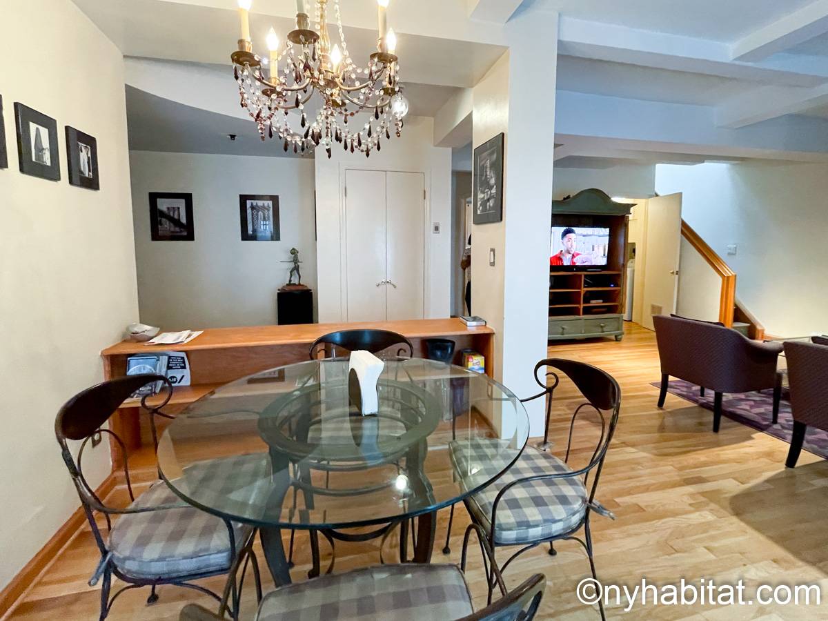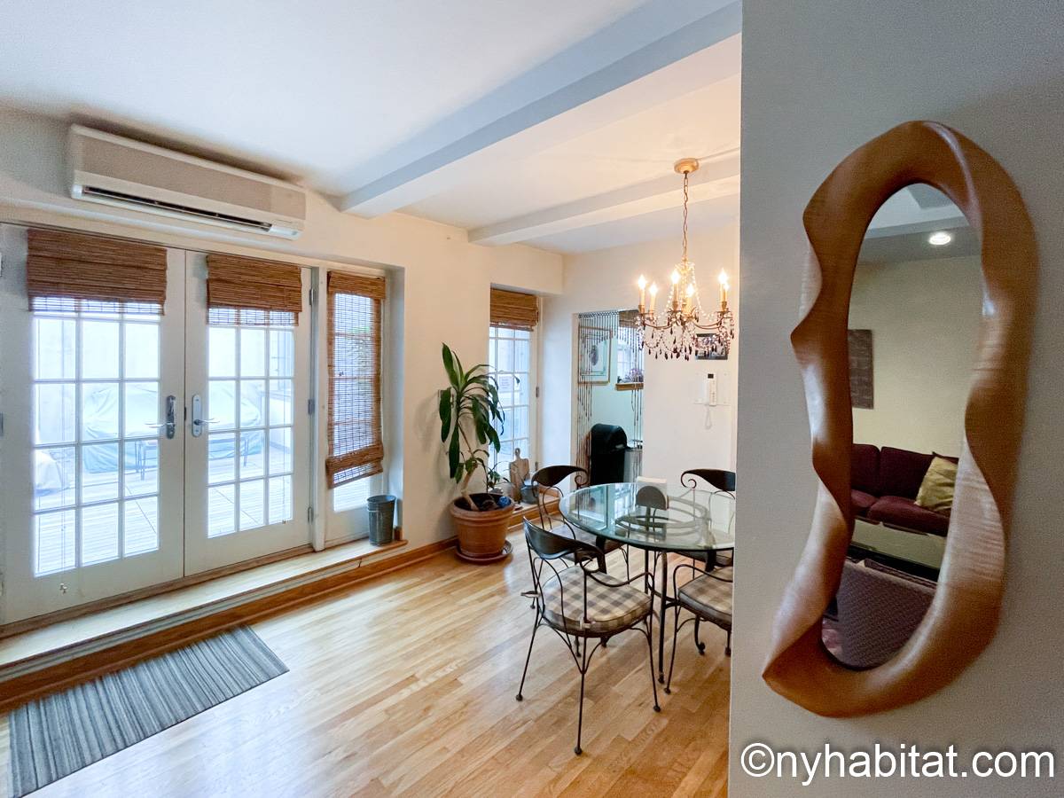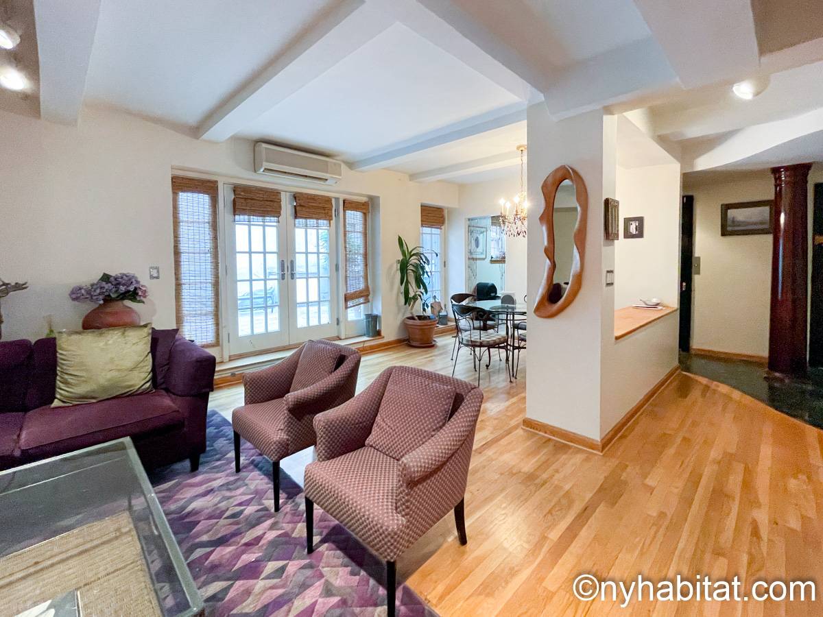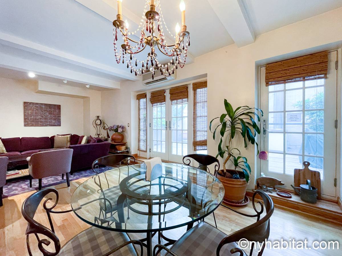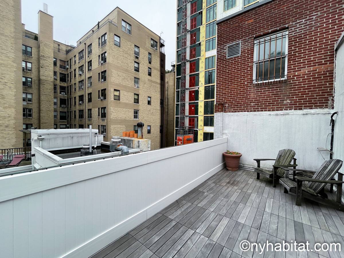 Como para la mayoría de los neoyorquinos, no es habitual que el ascensor dé directamente al apartamento. Al entrar en este edificio construido en los años 30, uno se siente y vive como un auténtico neoyorquino. Este apartamento dúplex está situado en las plantas sexta y séptima del edificio (plantas cinco y seis para los europeos). En el salón, lo reciben unas puertas que lo llevan al exterior, a la terraza. El salón cuenta aire acondicionado. En la cocina, tiene una nevera y congelador, microondas, cafetera, tostadora, lavavajillas, una estufa de cuatro quemadores con un horno, y una ventana para mirar hacia fuera recordándole que está cocinando con una vista de Manhattan. Los dos dormitorios están con un aire acondicionado y ventanas. Los cuartos de baño disponen de un combo de bañera-ducha, un váter, un espejo y un lavabo con espacio debajo para artículos de aseo.