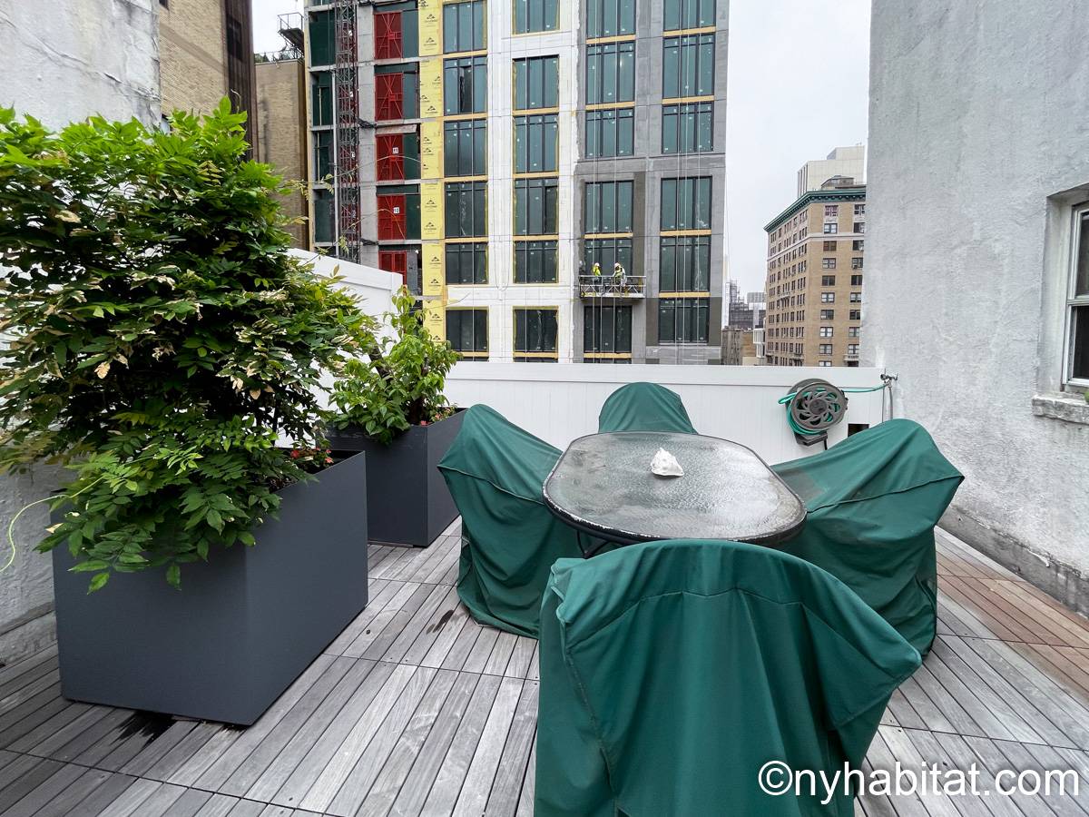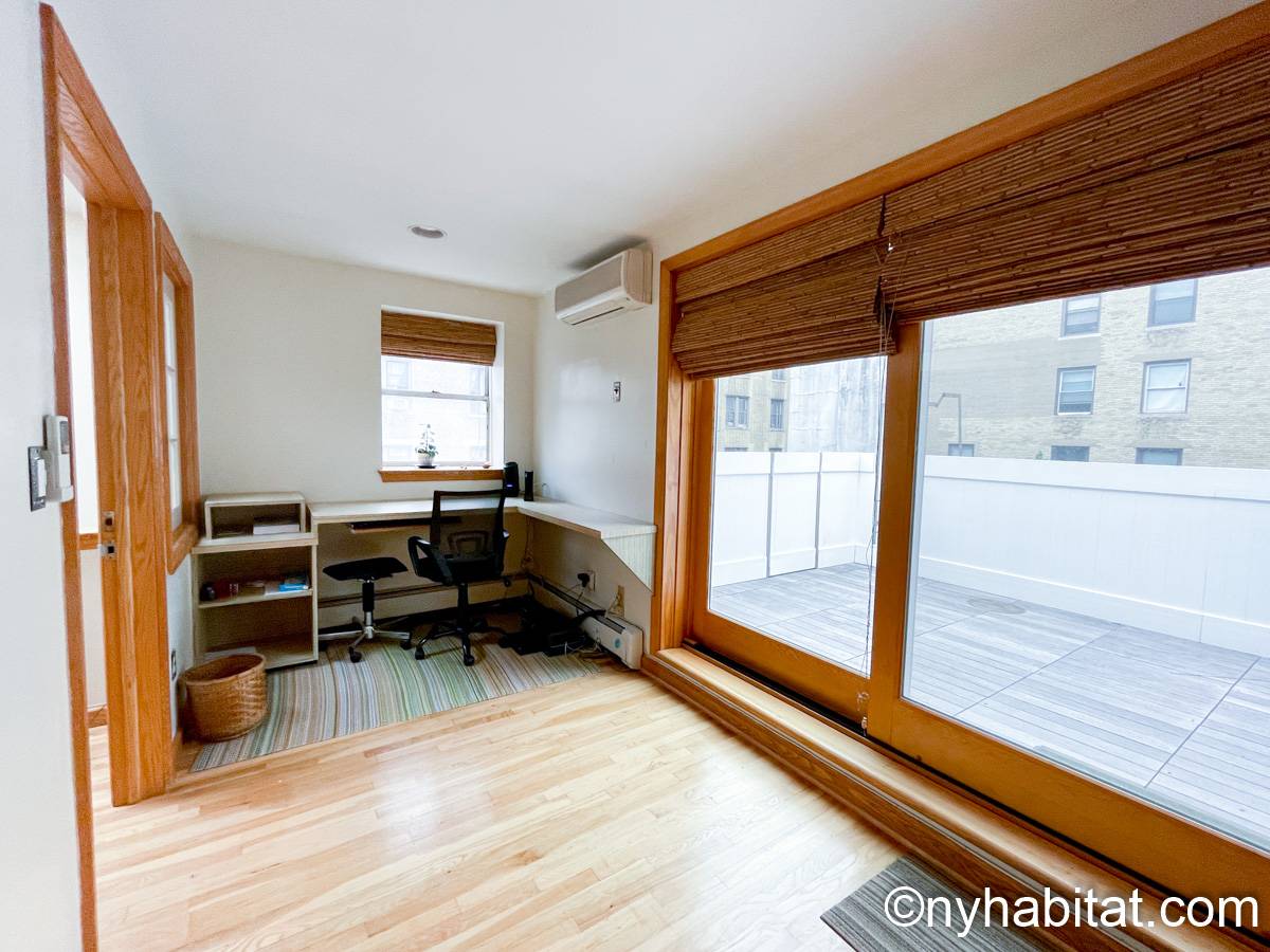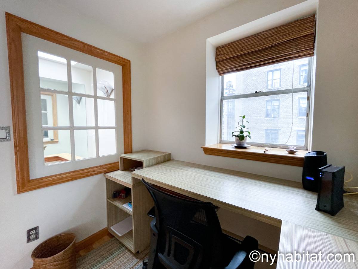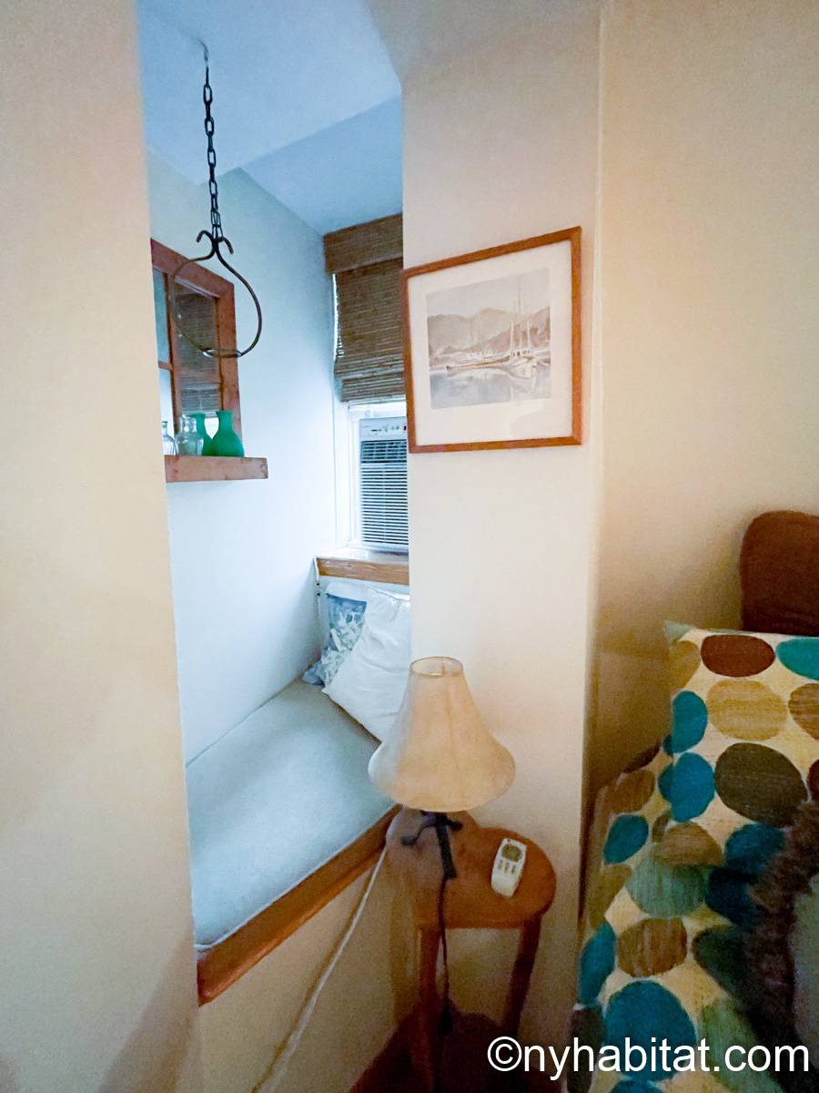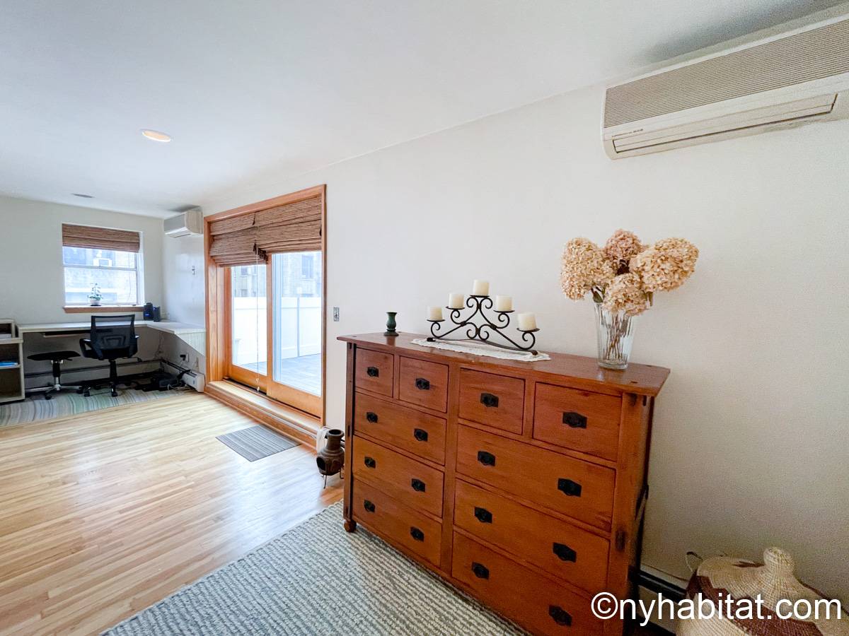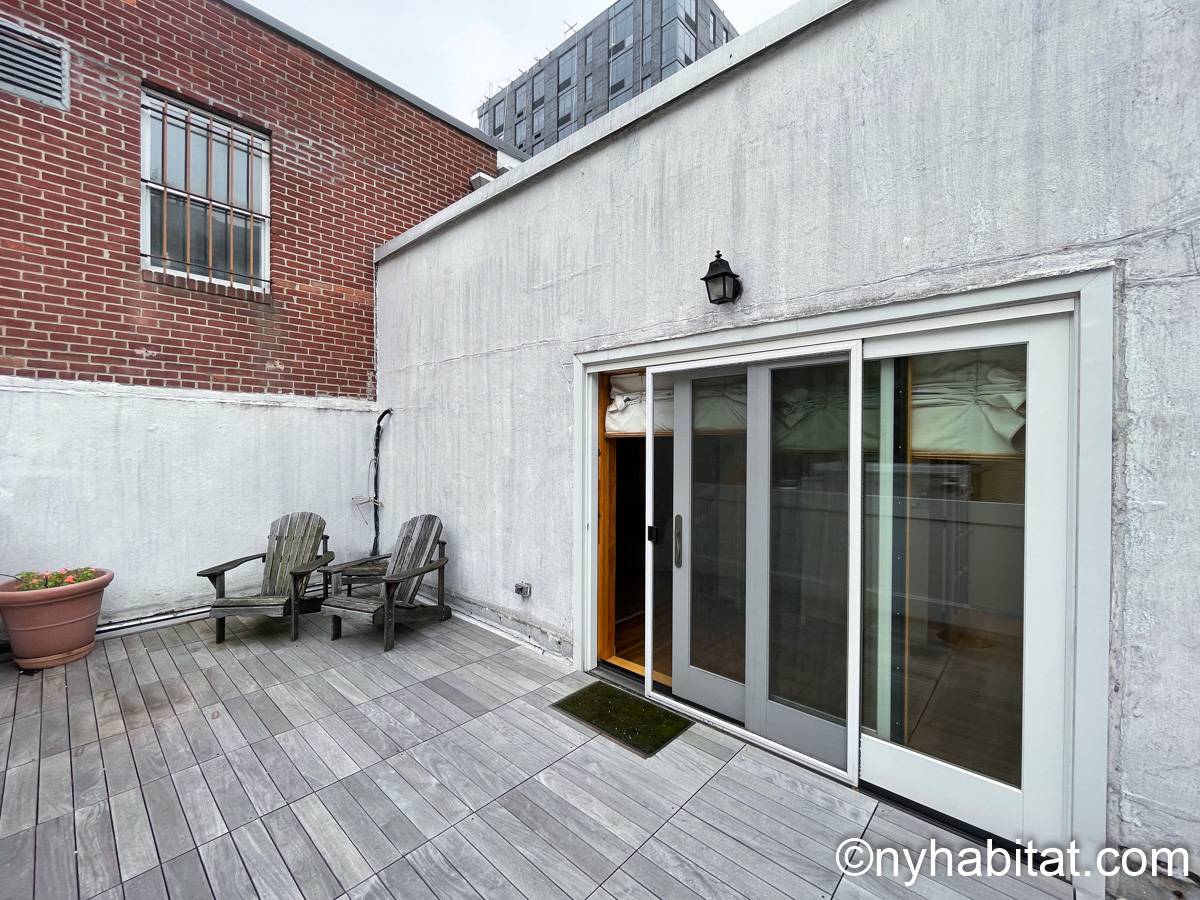 Como para la mayoría de los neoyorquinos, no es habitual que el ascensor dé directamente al apartamento. Al entrar en este edificio construido en los años 30, uno se siente y vive como un auténtico neoyorquino. Este apartamento dúplex está situado en las plantas sexta y séptima del edificio (plantas cinco y seis para los europeos). En el salón, lo reciben unas puertas que lo llevan al exterior, a la terraza. El salón cuenta aire acondicionado. En la cocina, tiene una nevera y congelador, microondas, cafetera, tostadora, lavavajillas, una estufa de cuatro quemadores con un horno, y una ventana para mirar hacia fuera recordándole que está cocinando con una vista de Manhattan. Los dos dormitorios están con un aire acondicionado y ventanas. Los cuartos de baño disponen de un combo de bañera-ducha, un váter, un espejo y un lavabo con espacio debajo para artículos de aseo.