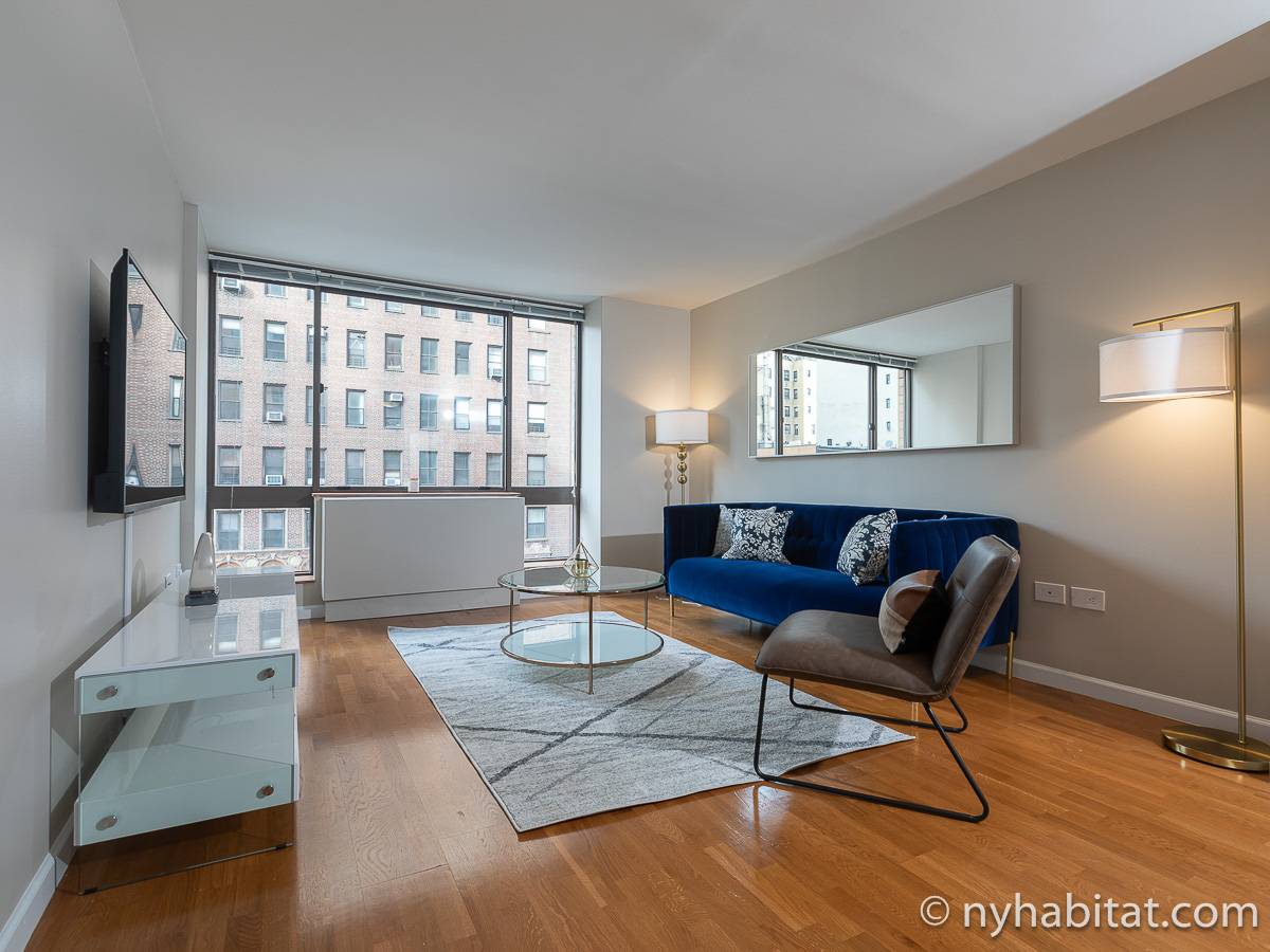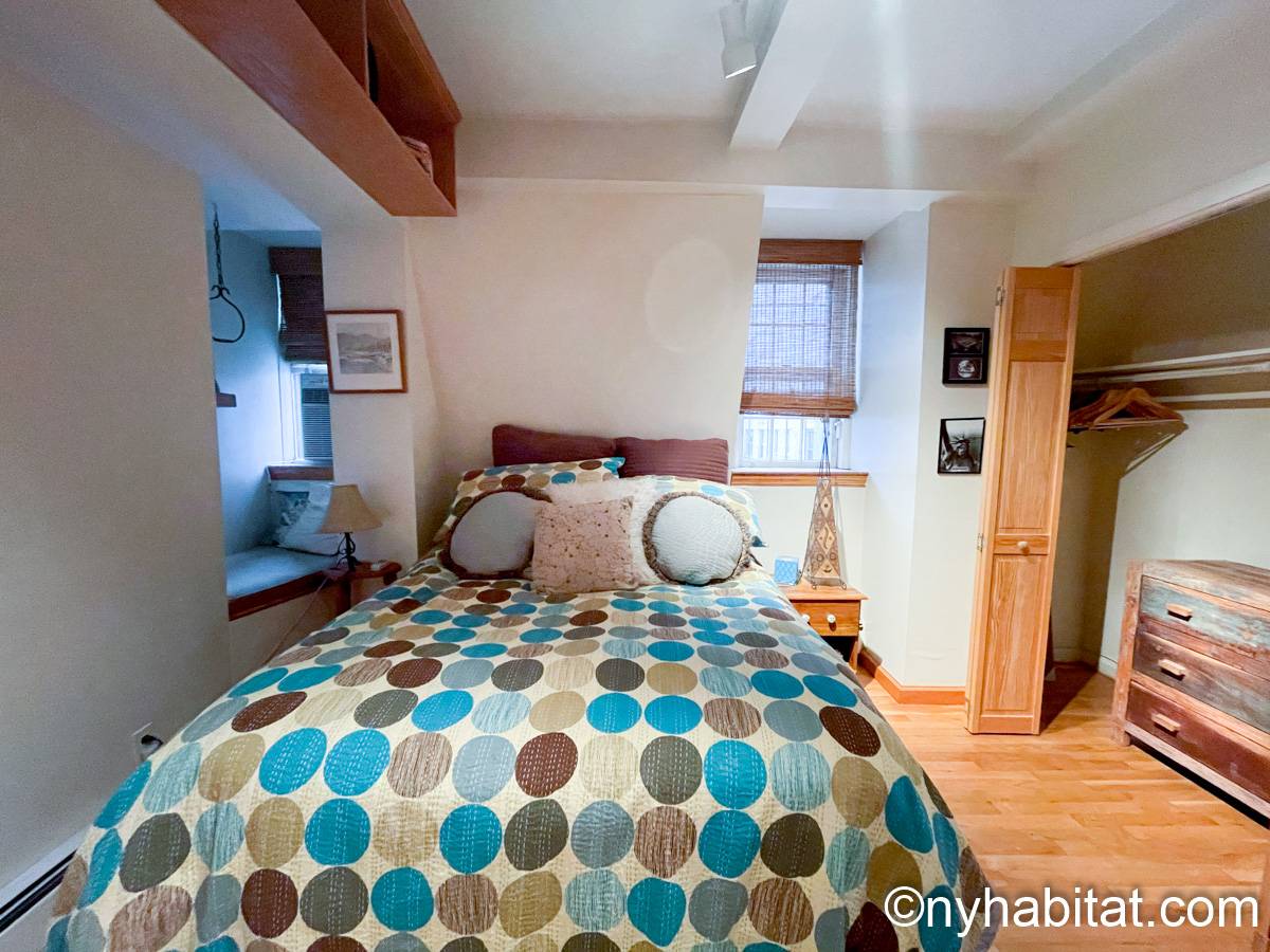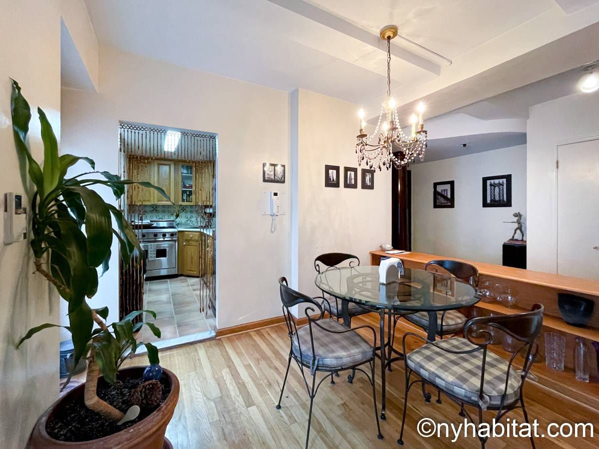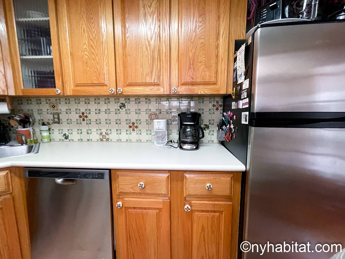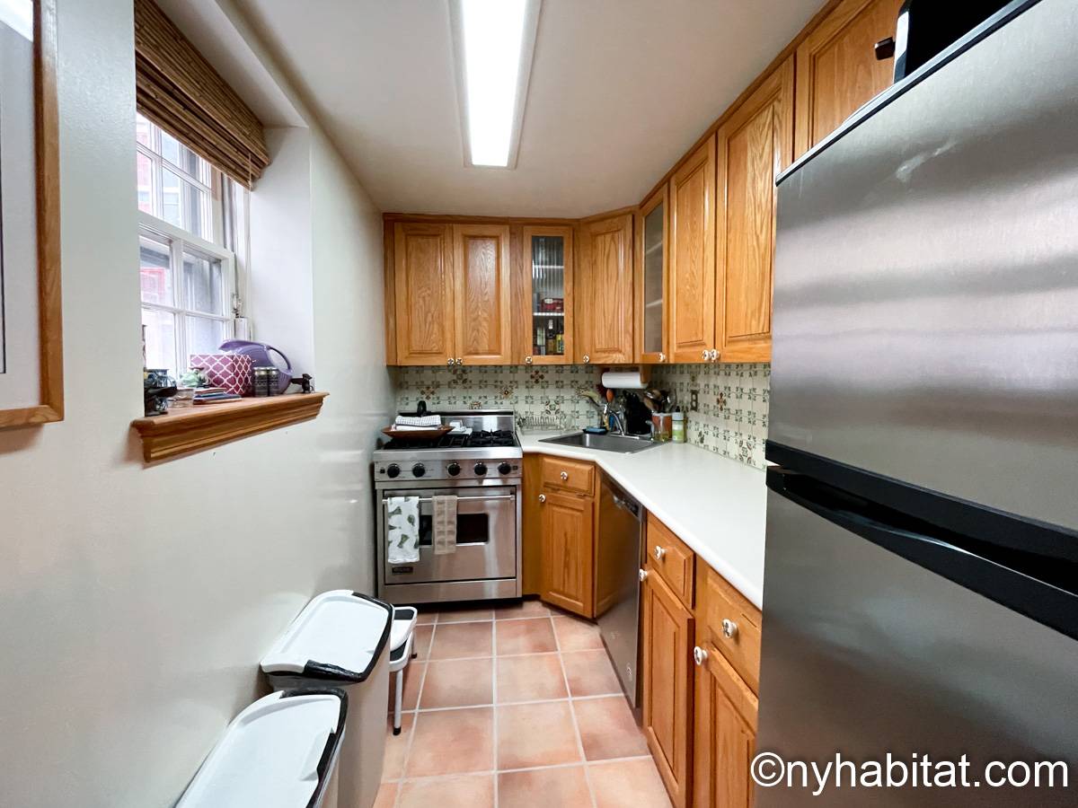 Como para la mayoría de los neoyorquinos, no es habitual que el ascensor dé directamente al apartamento. Al entrar en este edificio construido en los años 30, uno se siente y vive como un auténtico neoyorquino. Este apartamento dúplex está situado en las plantas sexta y séptima del edificio (plantas cinco y seis para los europeos). En el salón, lo reciben unas puertas que lo llevan al exterior, a la terraza. El salón cuenta aire acondicionado. En la cocina, tiene una nevera y congelador, microondas, cafetera, tostadora, lavavajillas, una estufa de cuatro quemadores con un horno, y una ventana para mirar hacia fuera recordándole que está cocinando con una vista de Manhattan. Los dos dormitorios están con un aire acondicionado y ventanas. Los cuartos de baño disponen de un combo de bañera-ducha, un váter, un espejo y un lavabo con espacio debajo para artículos de aseo.