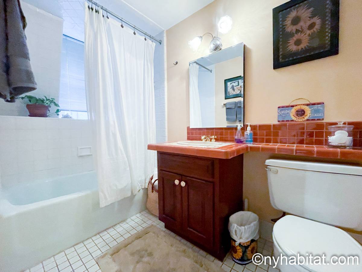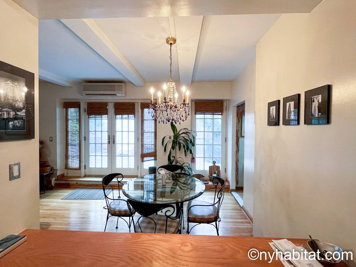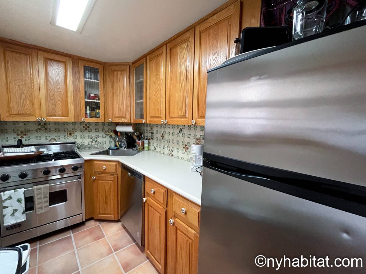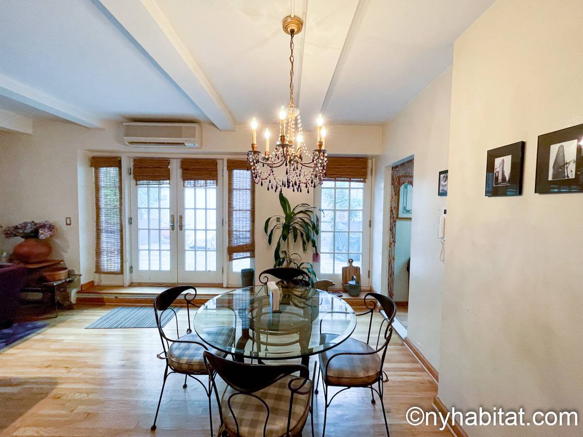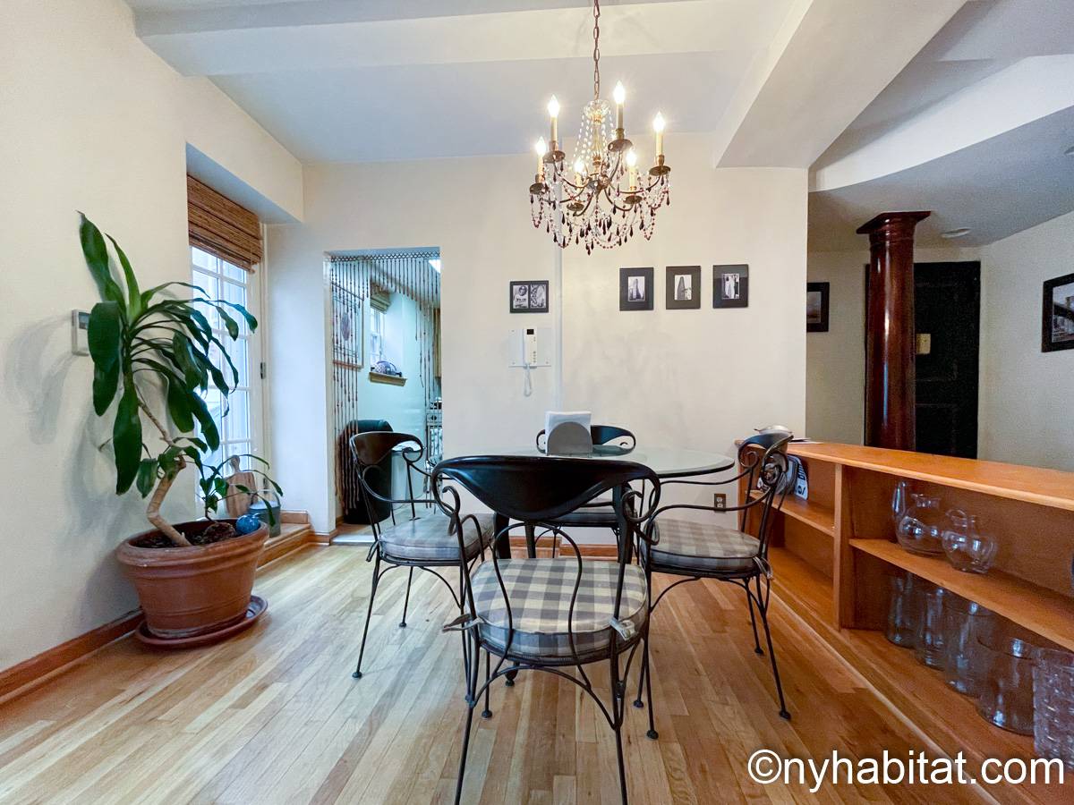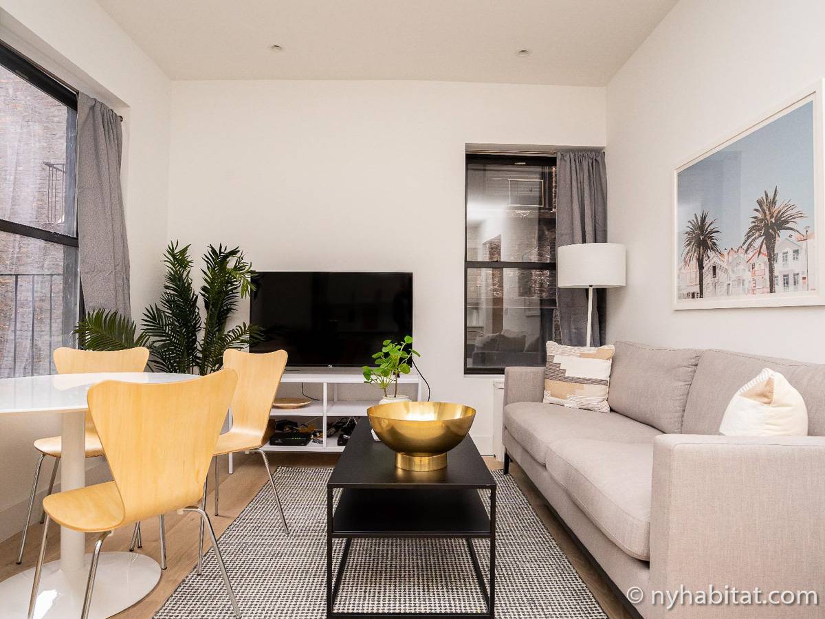 Como para la mayoría de los neoyorquinos, no es habitual que el ascensor dé directamente al apartamento. Al entrar en este edificio construido en los años 30, uno se siente y vive como un auténtico neoyorquino. Este apartamento dúplex está situado en las plantas sexta y séptima del edificio (plantas cinco y seis para los europeos). En el salón, lo reciben unas puertas que lo llevan al exterior, a la terraza. El salón cuenta aire acondicionado. En la cocina, tiene una nevera y congelador, microondas, cafetera, tostadora, lavavajillas, una estufa de cuatro quemadores con un horno, y una ventana para mirar hacia fuera recordándole que está cocinando con una vista de Manhattan. Los dos dormitorios están con un aire acondicionado y ventanas. Los cuartos de baño disponen de un combo de bañera-ducha, un váter, un espejo y un lavabo con espacio debajo para artículos de aseo.