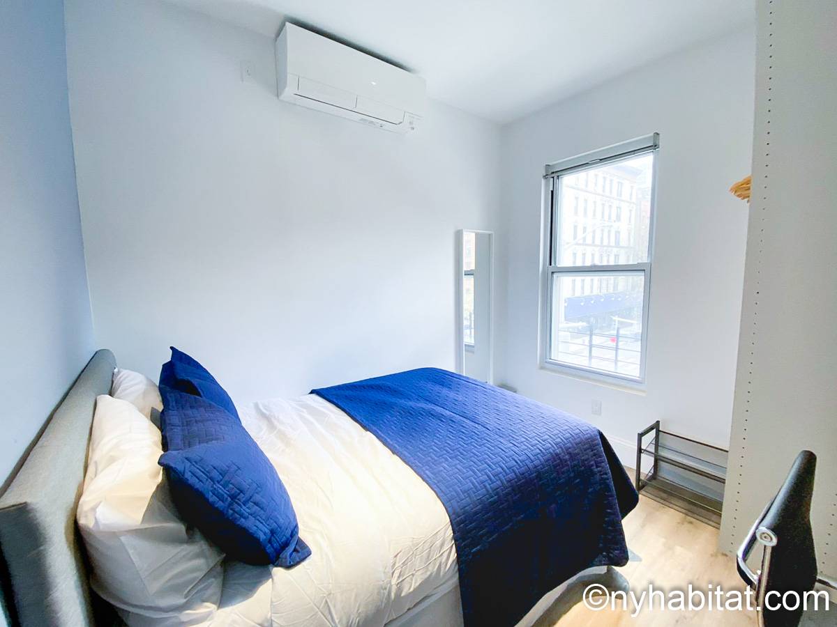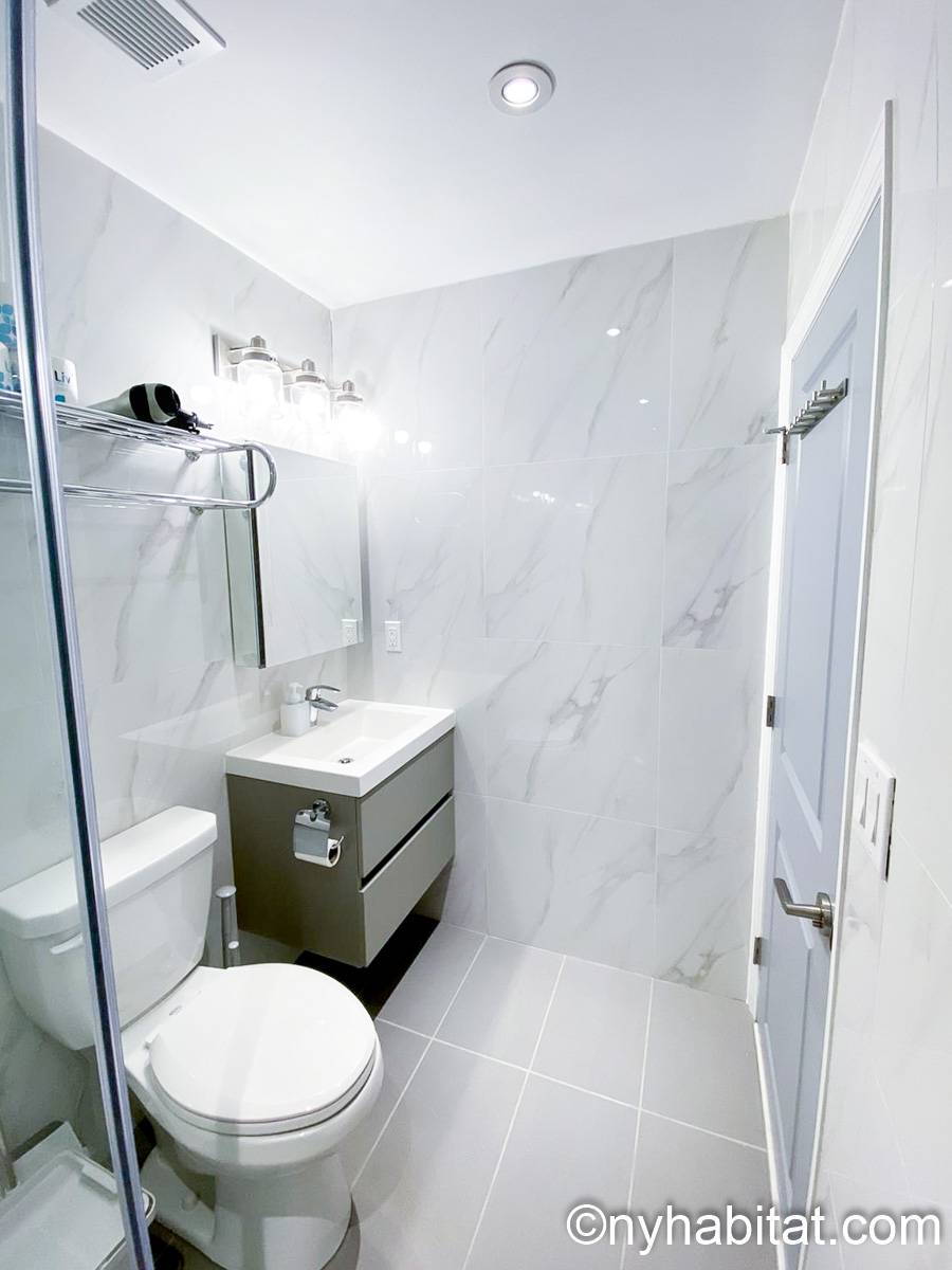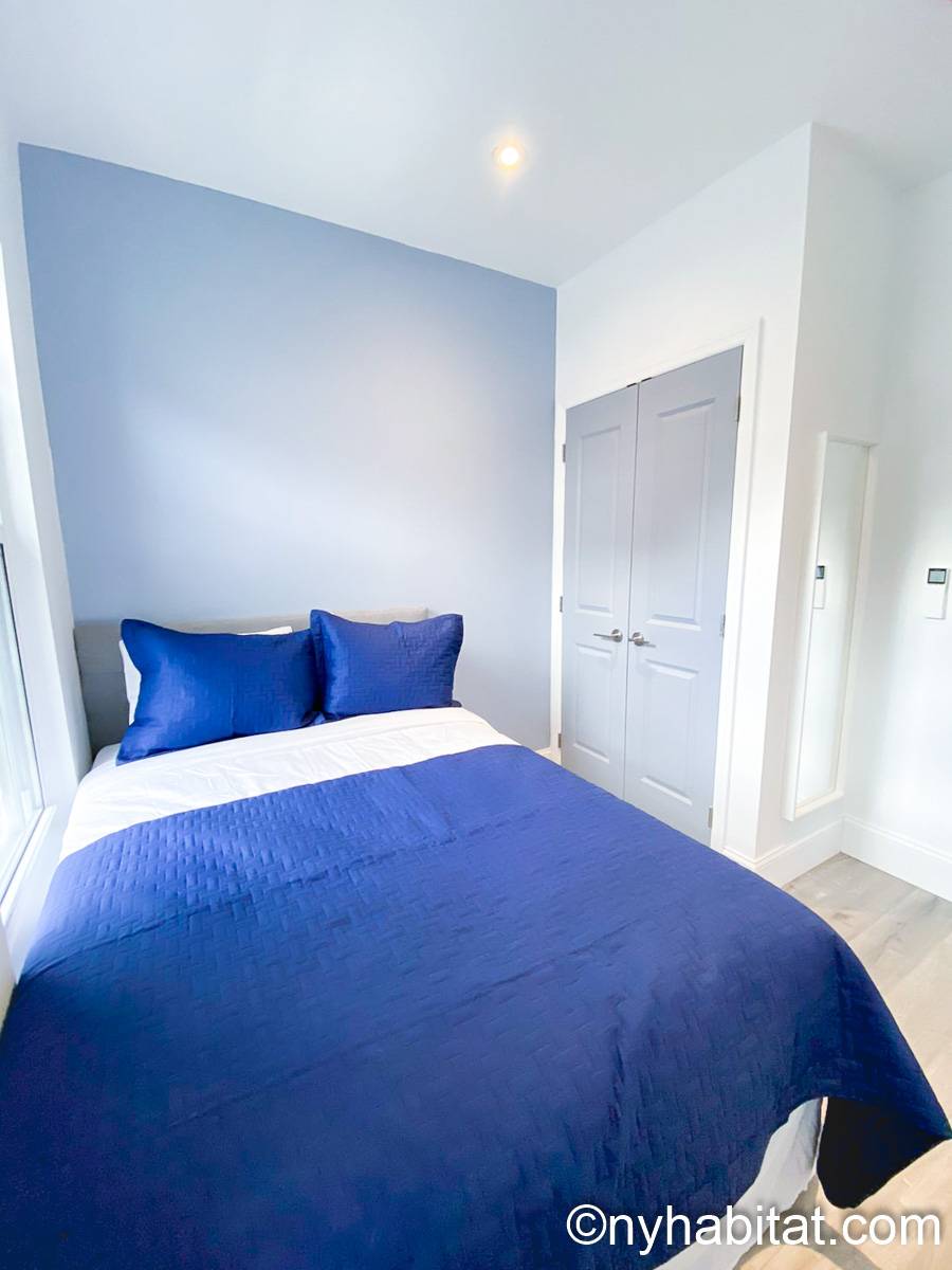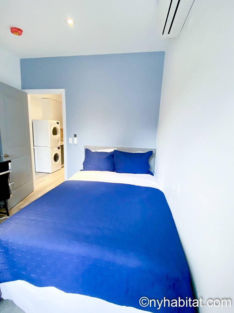 Los dormitorios, completamente amueblados, tienen una televisión en la pared y aire acondicionado. Uno de los dormitorios tiene un armario, y el segundo incluye estanterías empotradas. El mobiliario es contemporáneo e incluye camas tamaño full en ambos dormitorios. El cuarto de baño de paredes blancas incluye una ducha con puerta de cristal.