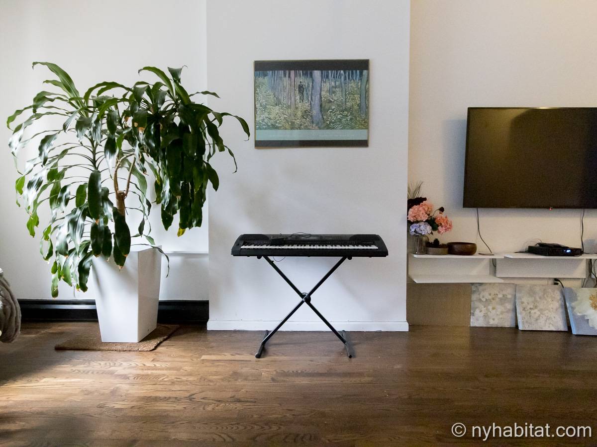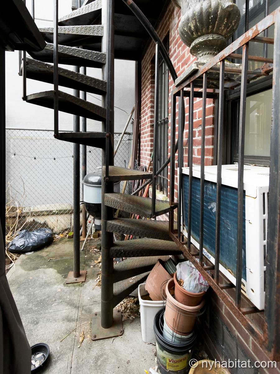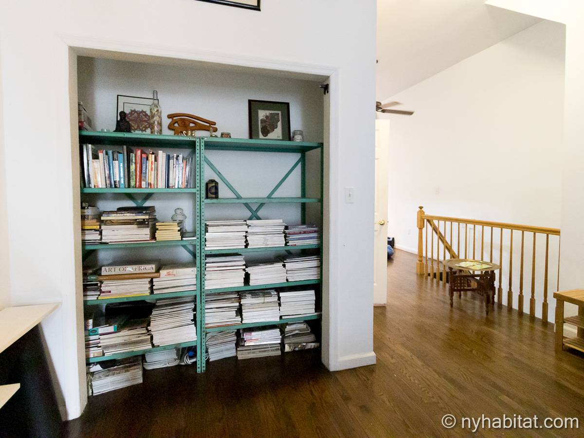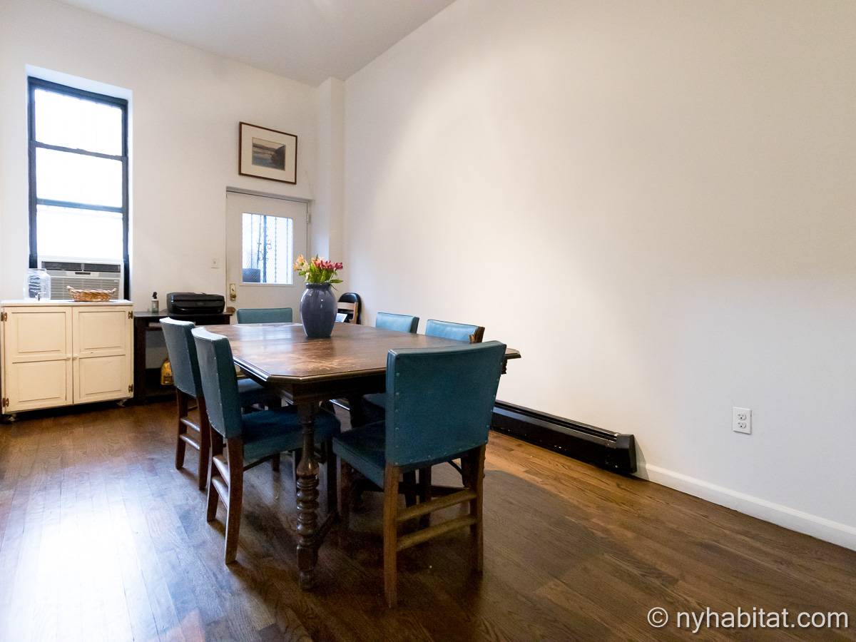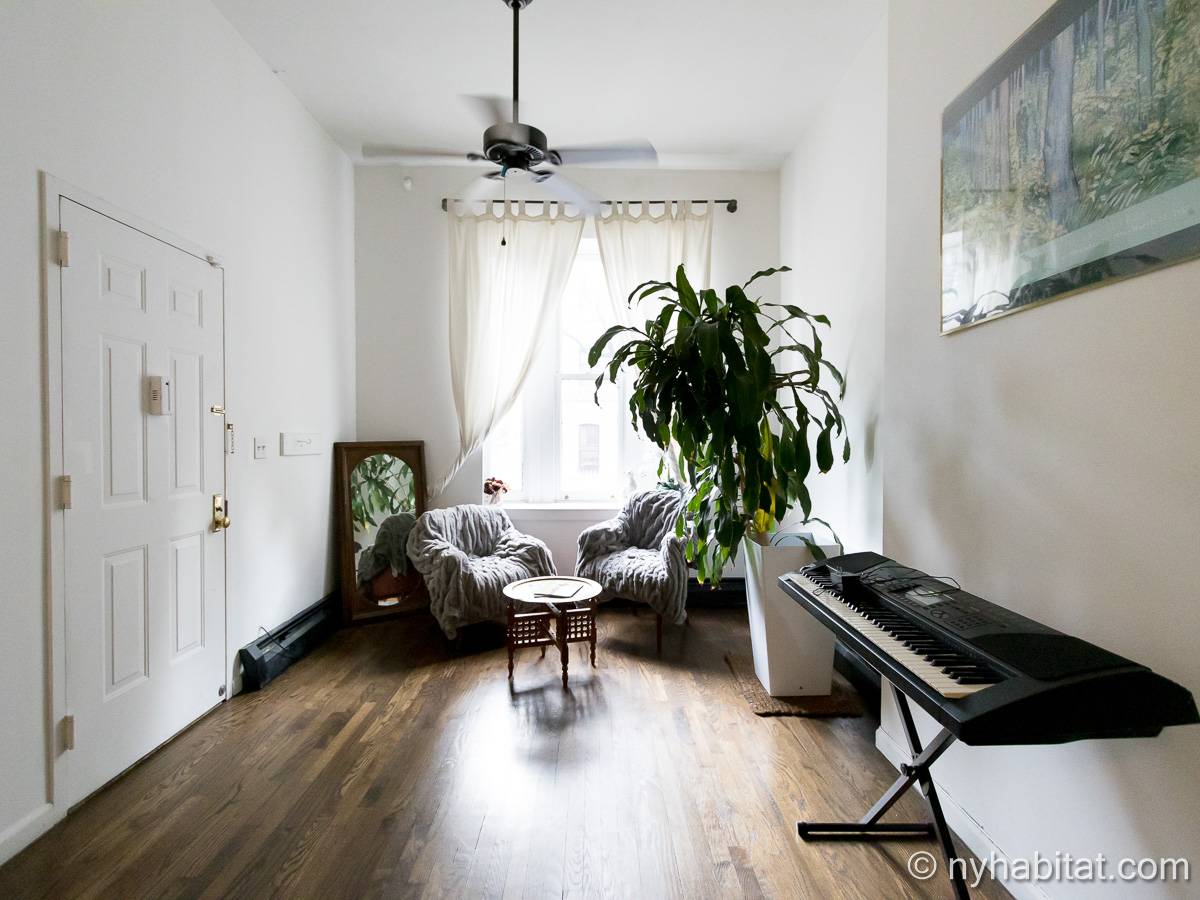 Este apartamento amueblado de 2 dormitorios y 2.5 baños está en los pisos 1 y 2 (equivalente a la planta baja y al piso 1 en Europa) de un edificio de piedra rojiza de 5 pisos en Manhattan, ciudad de Nueva York. El edificio cuenta con un sistema de seguridad, instalaciones de lavandería y un jardín. Este se encuentra en 118th Street y Seventh Avenue, en el barrio de Harlem.