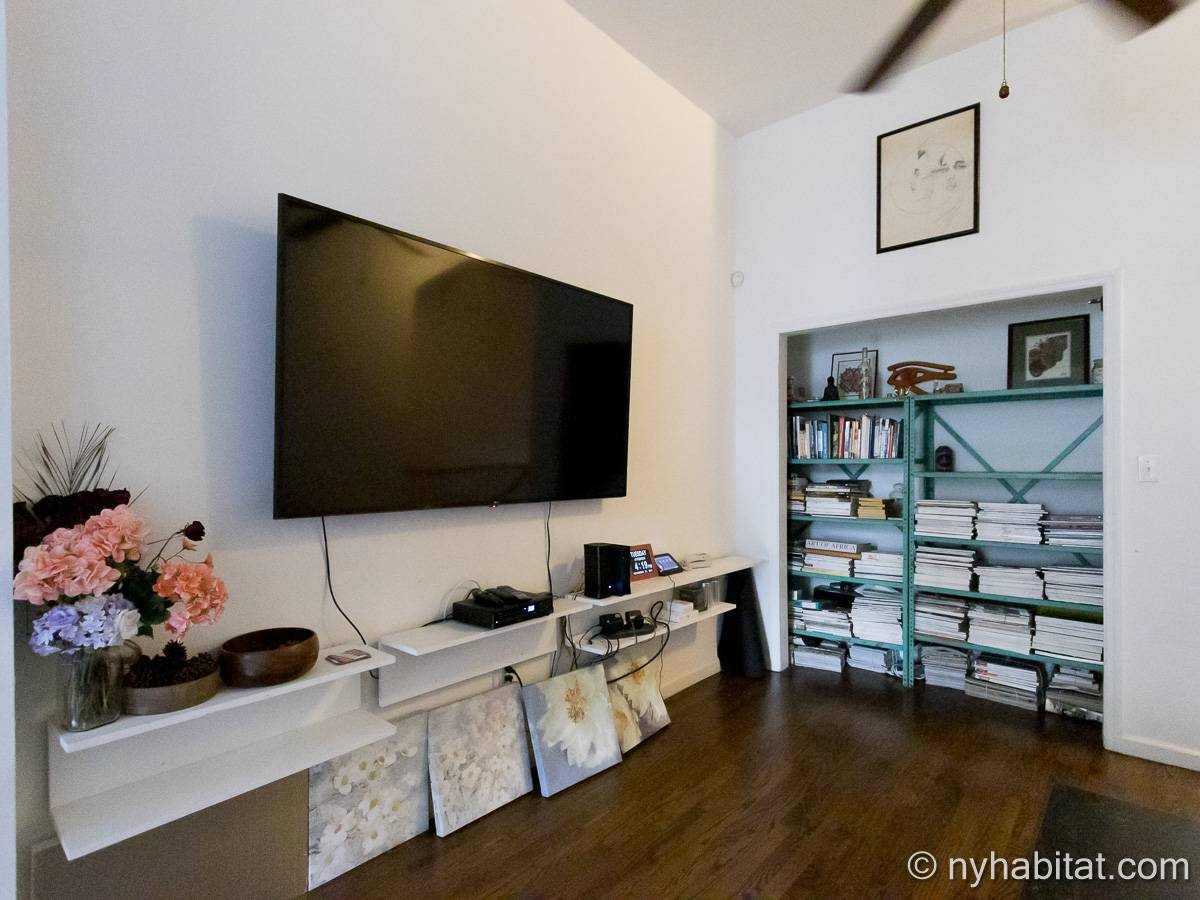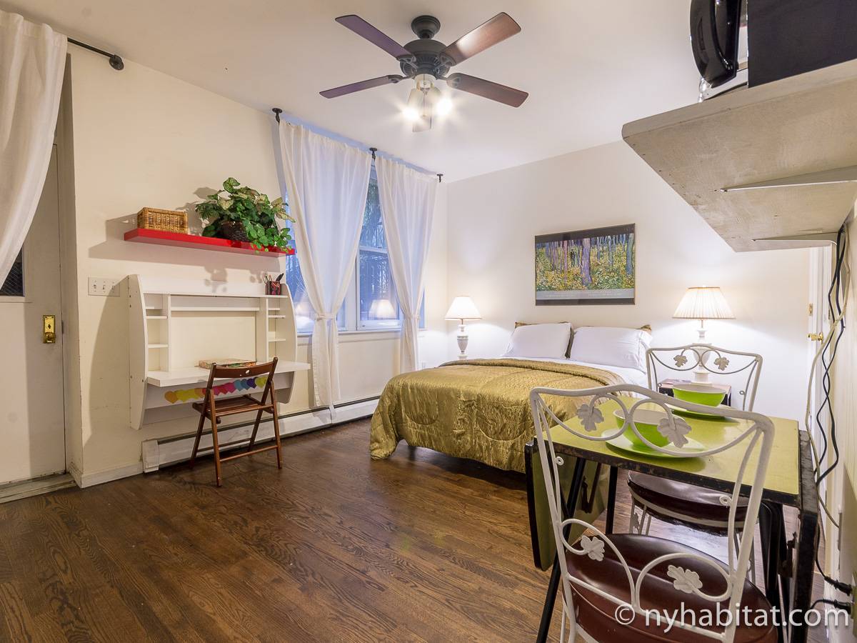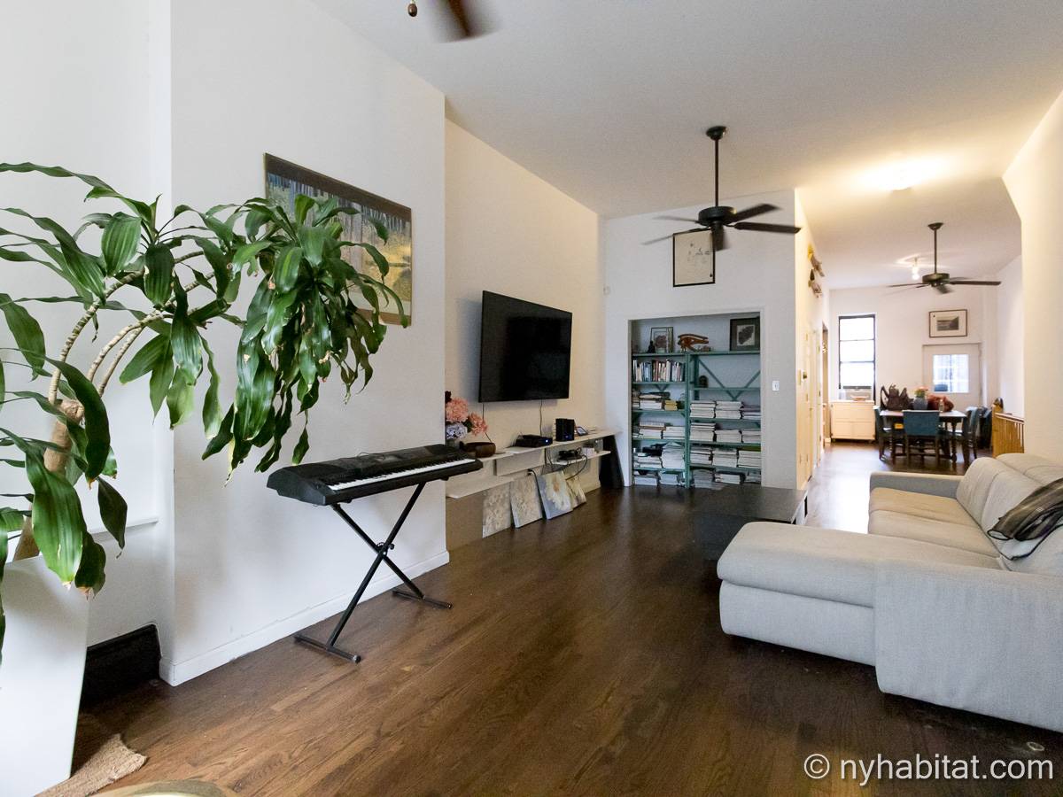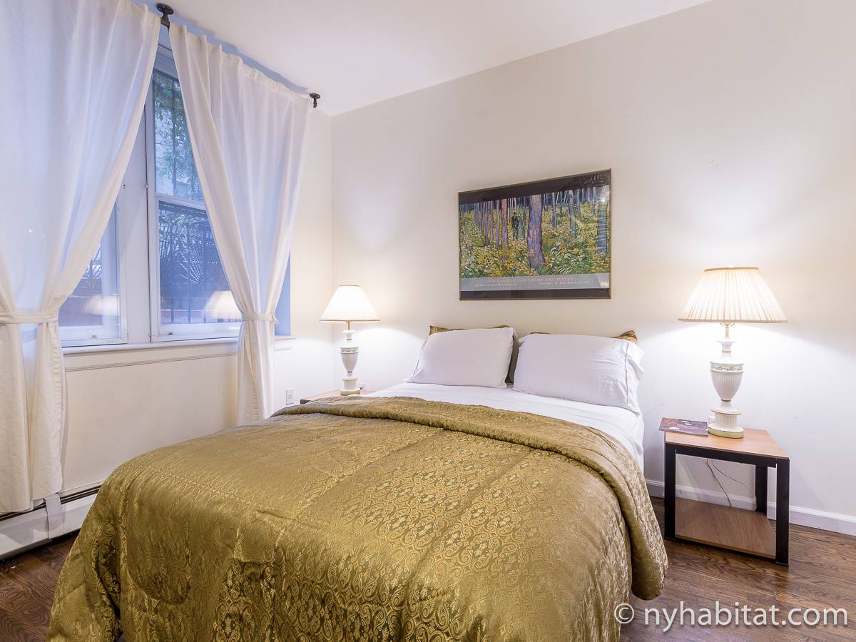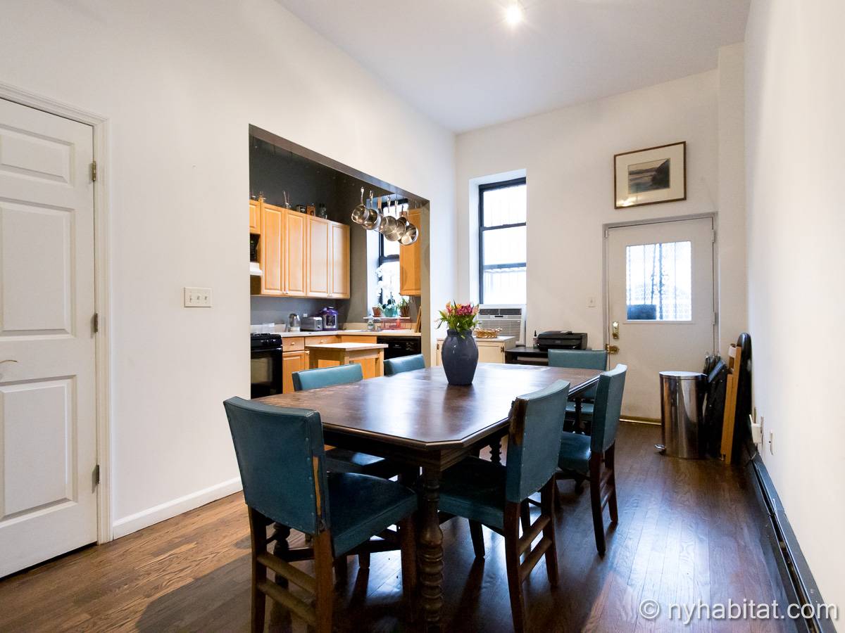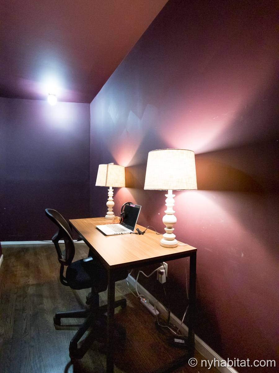 Este apartamento amueblado de 2 dormitorios y 2.5 baños está en los pisos 1 y 2 (equivalente a la planta baja y al piso 1 en Europa) de un edificio de piedra rojiza de 5 pisos en Manhattan, ciudad de Nueva York. El edificio cuenta con un sistema de seguridad, instalaciones de lavandería y un jardín. Este se encuentra en 118th Street y Seventh Avenue, en el barrio de Harlem.