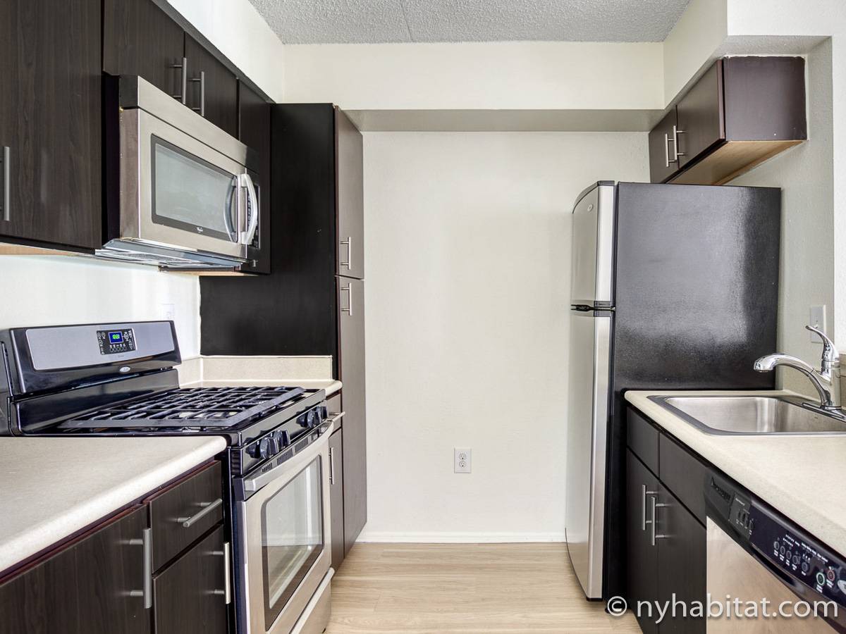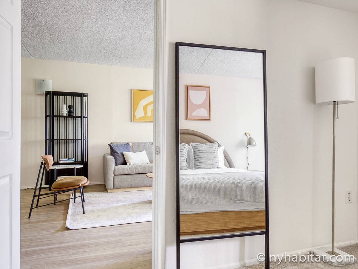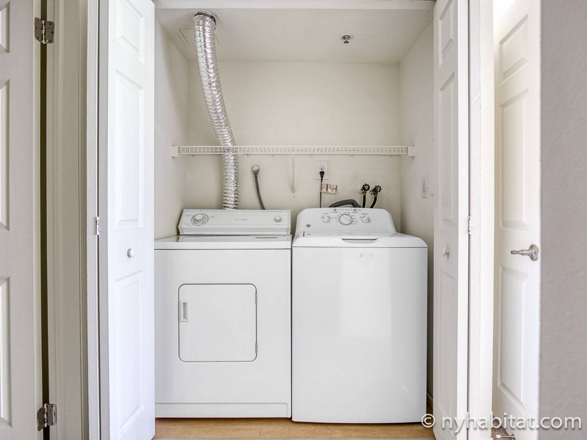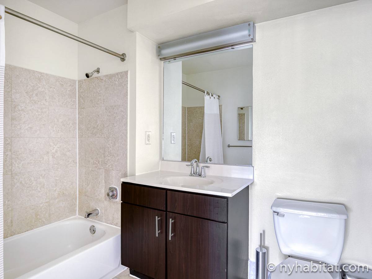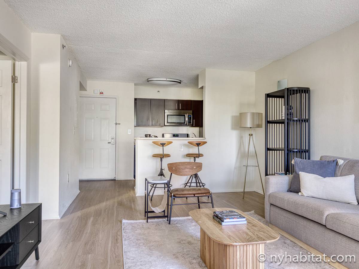 Dispone de un apartamento amueblado de un dormitorio y un baño cerca de la esquina de Washington Boulevard y 2nd Street, ubicado en Nueva Jersey, entre New Port y Exchange Place. Este apartamento de 64 m2 está en la segunda planta (equivalente a la primera planta en Europa) de un edificio de gran altura con ascensor en el vecindario de Waterfront. Dentro del inmueble hay instalaciones como un gimnasio, una piscina, y un sistema de seguridad, y el propio apartamento cuenta con su propia lavadora y secadora.