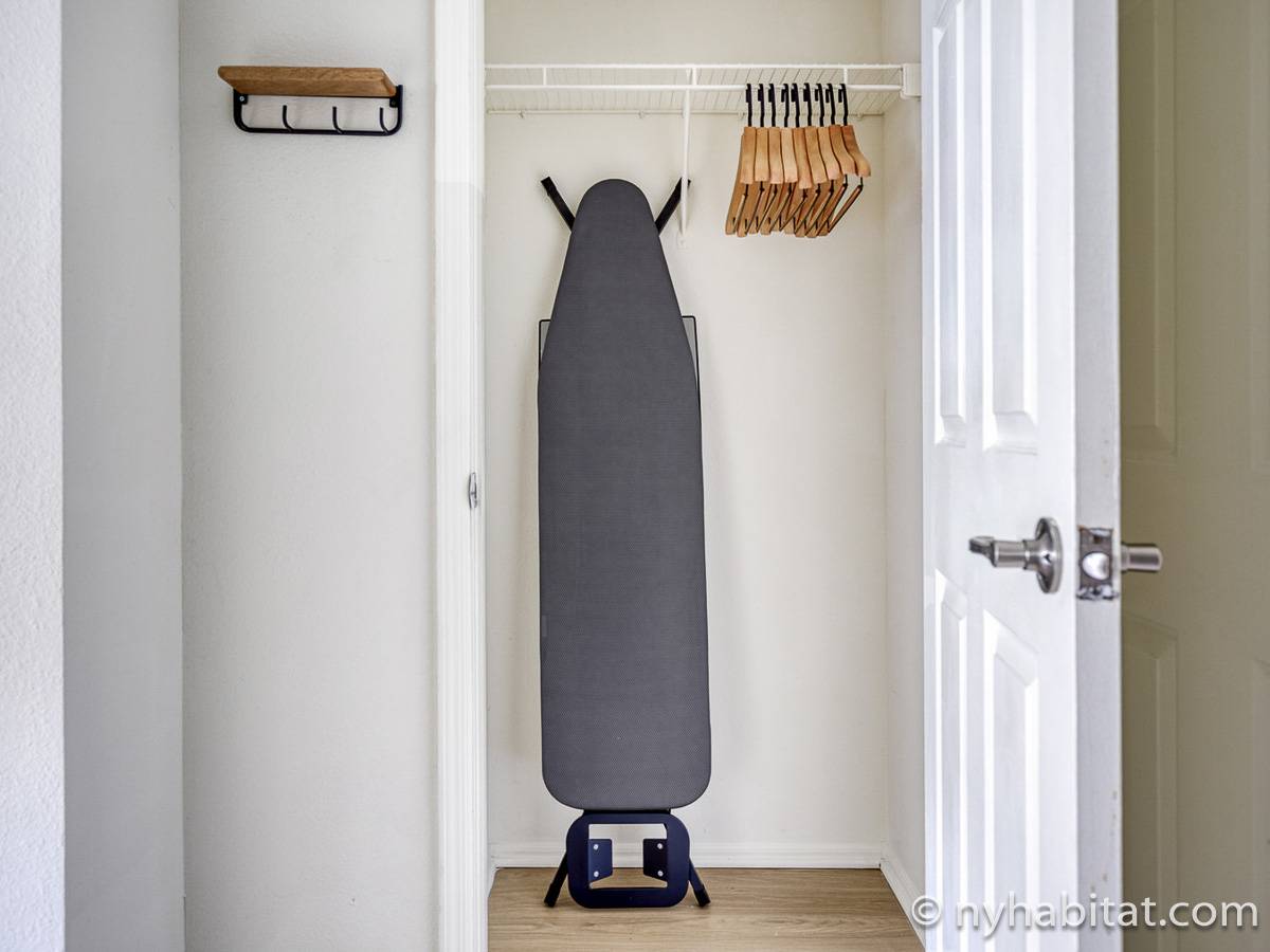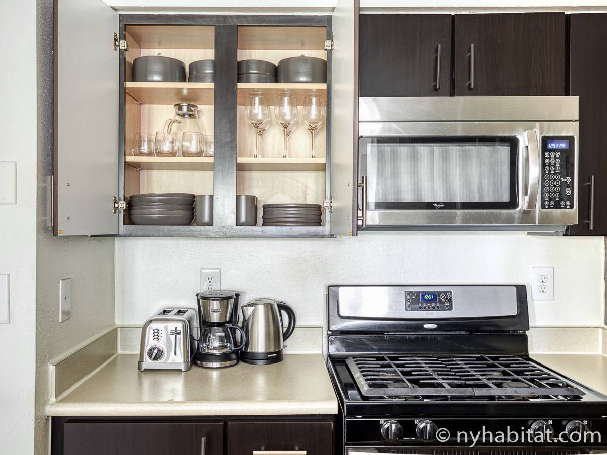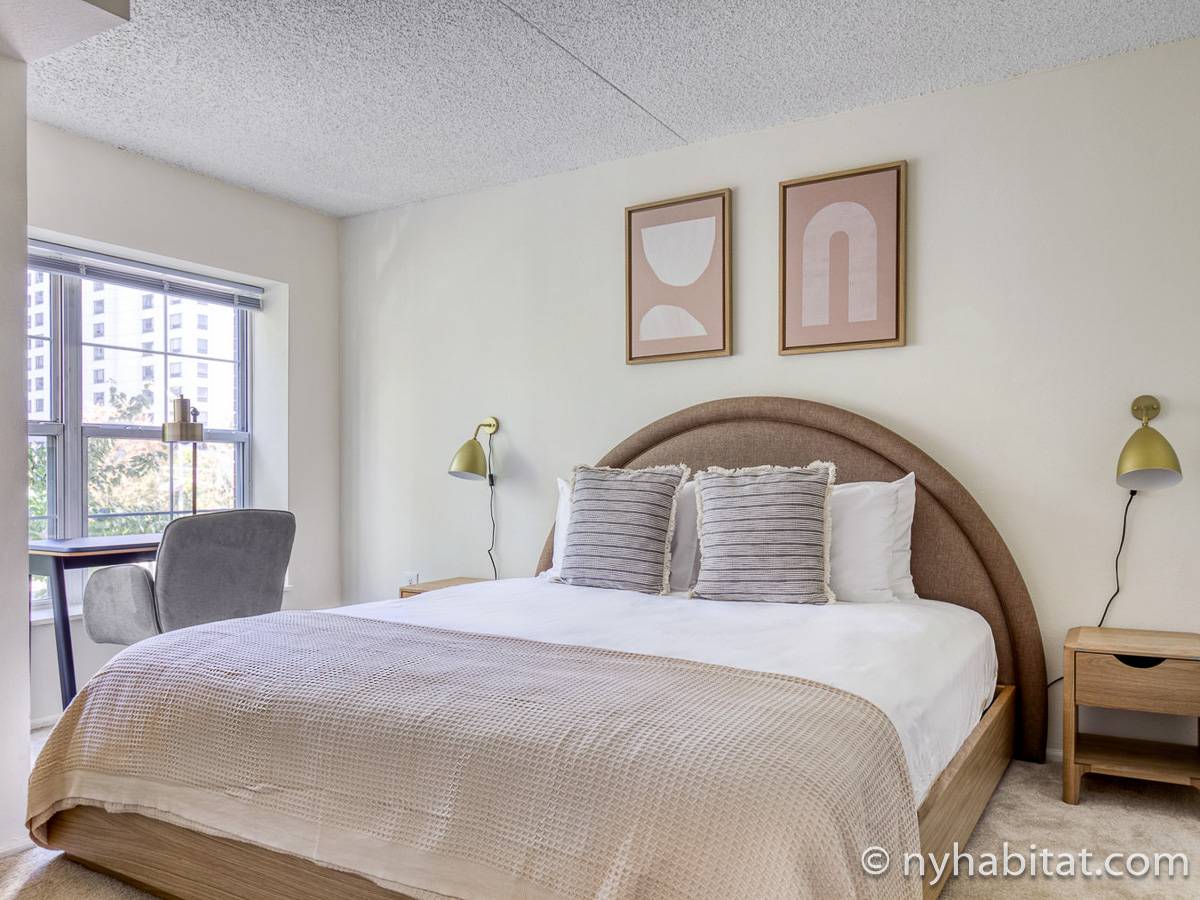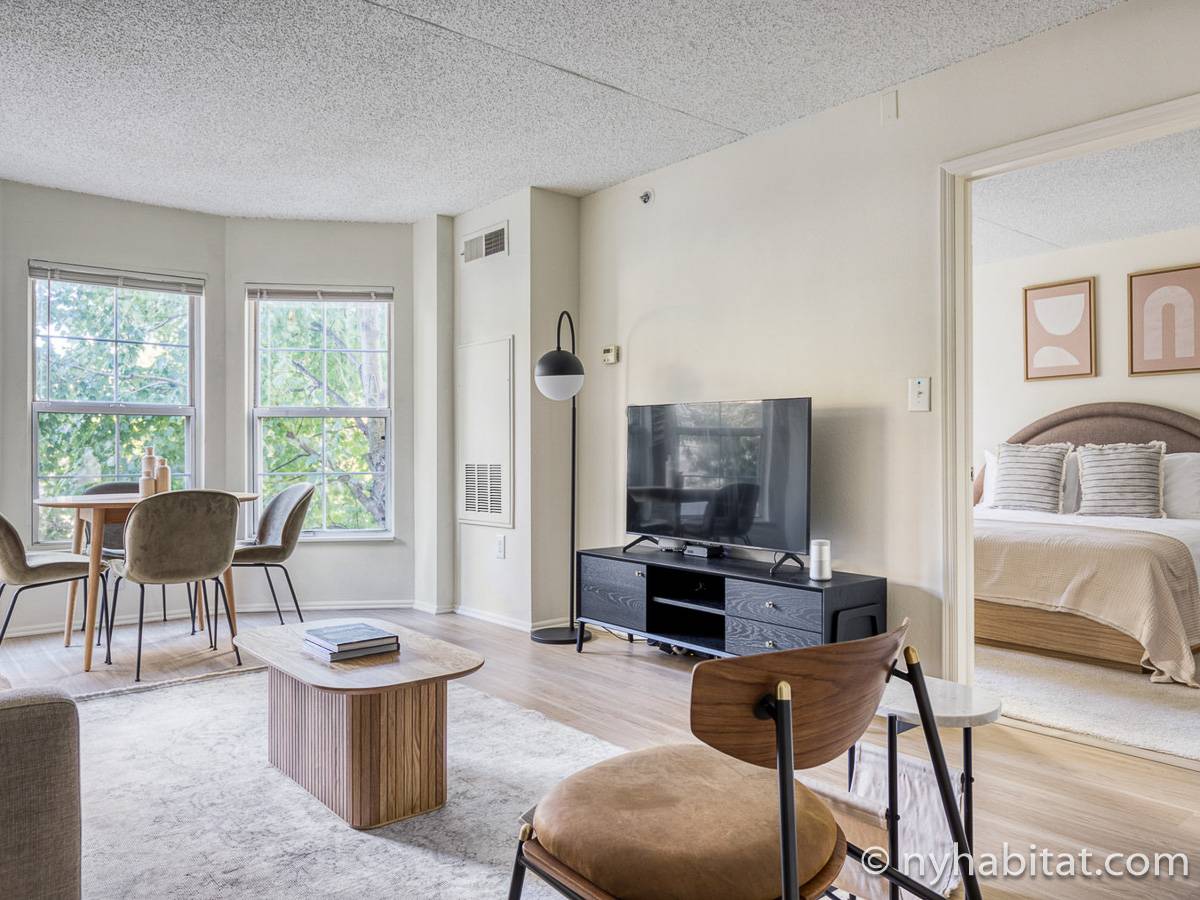 Dispone de un apartamento amueblado de un dormitorio y un baño cerca de la esquina de Washington Boulevard y 2nd Street, ubicado en Nueva Jersey, entre New Port y Exchange Place. Este apartamento de 64 m2 está en la segunda planta (equivalente a la primera planta en Europa) de un edificio de gran altura con ascensor en el vecindario de Waterfront. Dentro del inmueble hay instalaciones como un gimnasio, una piscina, y un sistema de seguridad, y el propio apartamento cuenta con su propia lavadora y secadora.