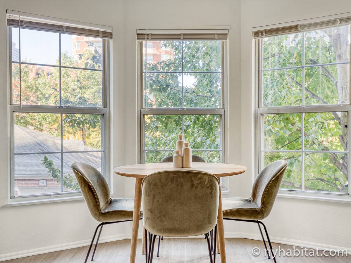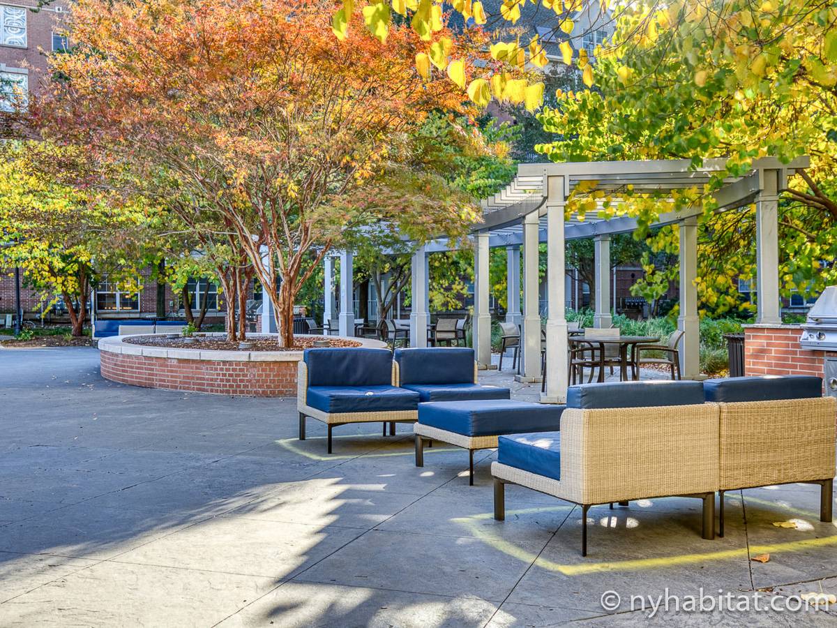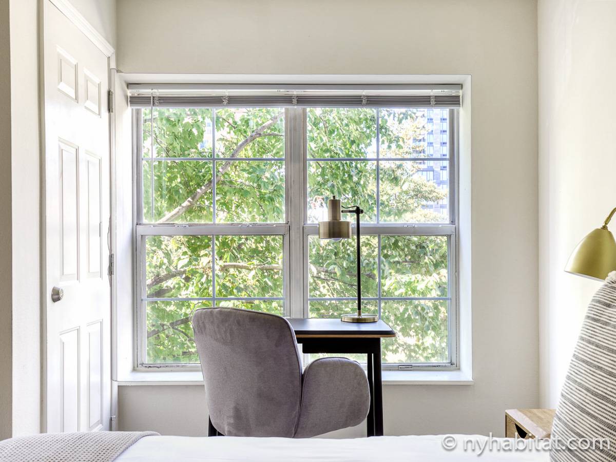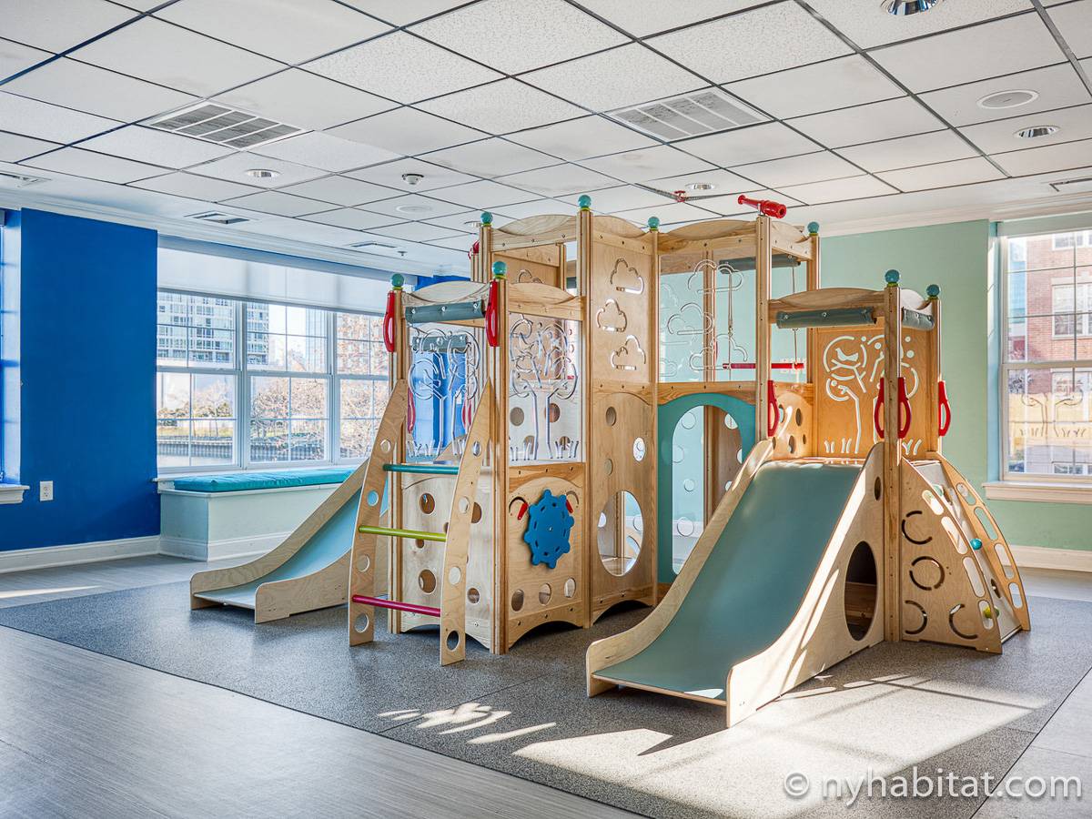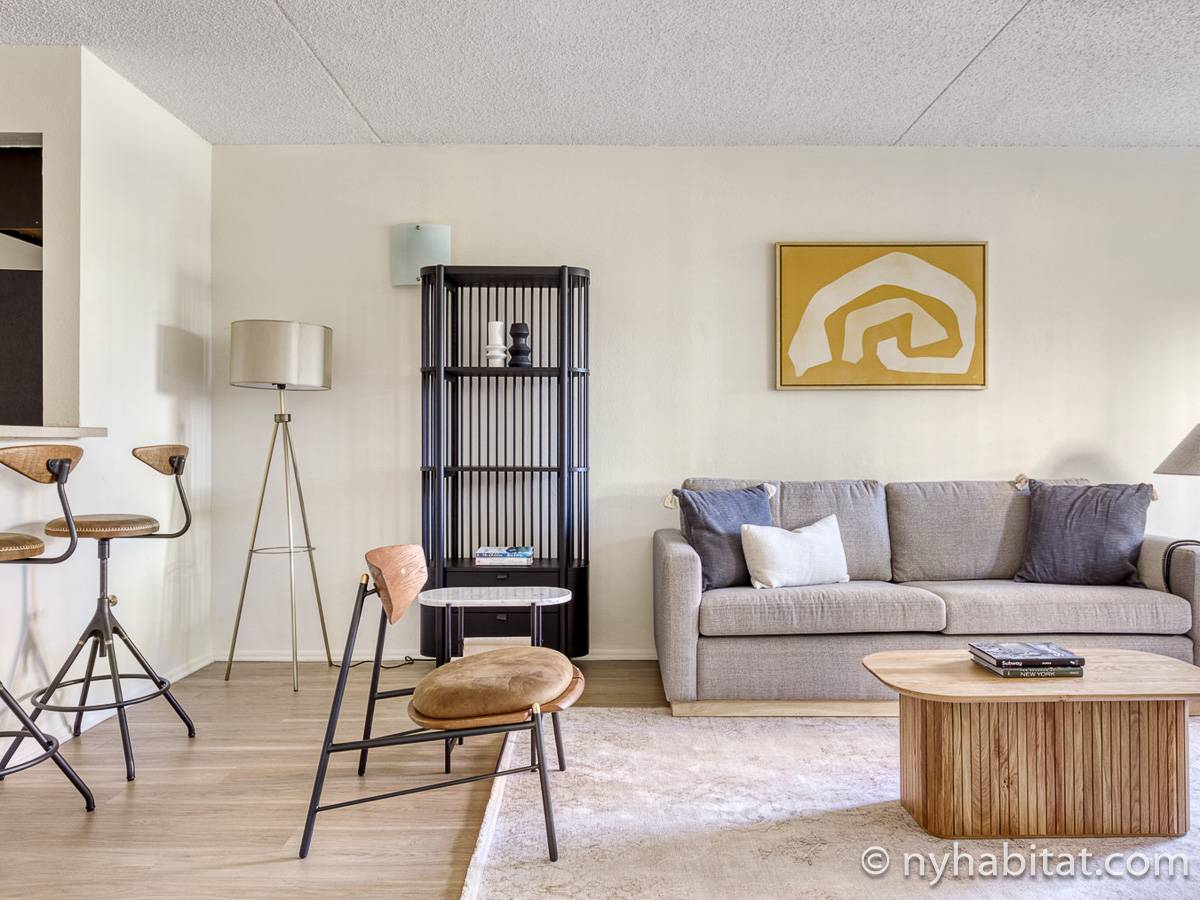 Dispone de un apartamento amueblado de un dormitorio y un baño cerca de la esquina de Washington Boulevard y 2nd Street, ubicado en Nueva Jersey, entre New Port y Exchange Place. Este apartamento de 64 m2 está en la segunda planta (equivalente a la primera planta en Europa) de un edificio de gran altura con ascensor en el vecindario de Waterfront. Dentro del inmueble hay instalaciones como un gimnasio, una piscina, y un sistema de seguridad, y el propio apartamento cuenta con su propia lavadora y secadora.