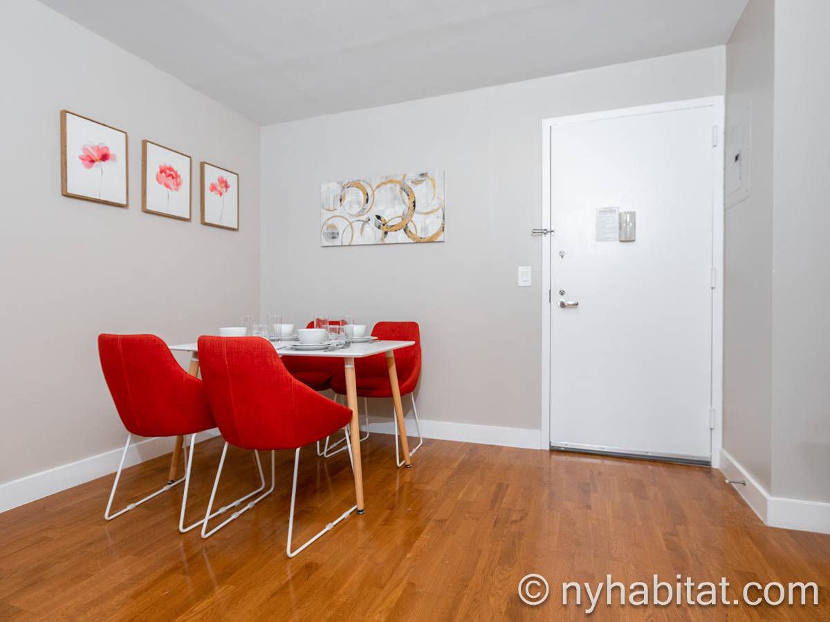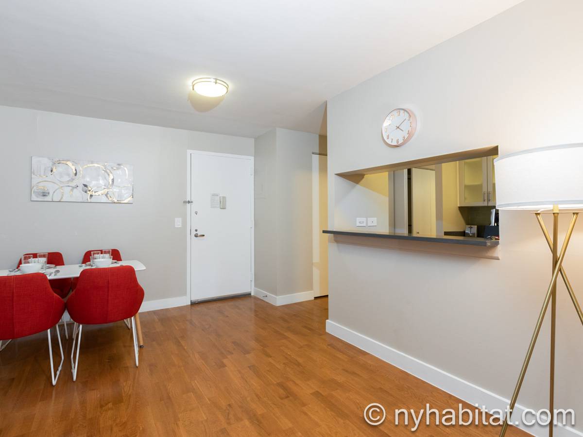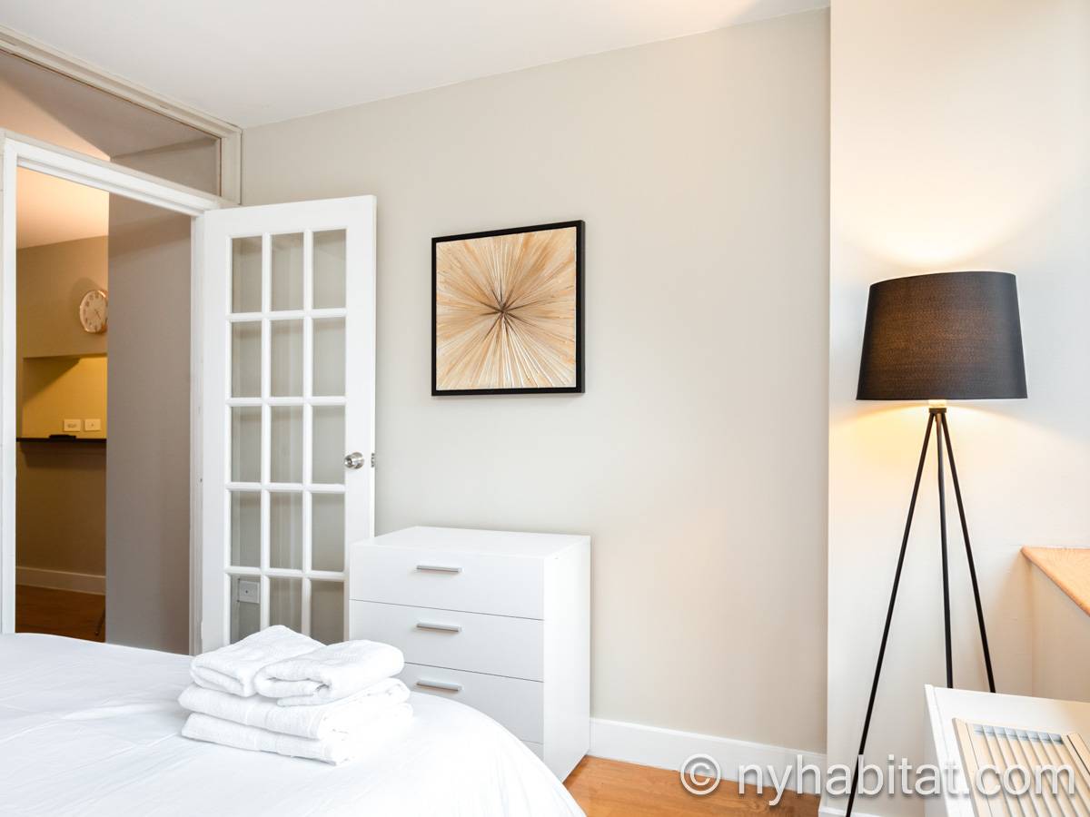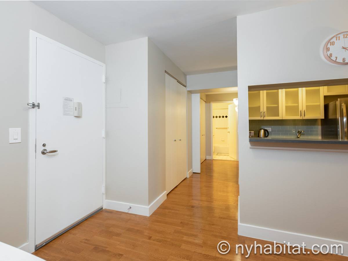 Cerca de la esquina de la 89th Street y la Amsterdam Avenue se sitúa este apartamento de 1 dormitorio y 1 baño en alquiler. Este apartamento amueblado de Manhattan está ubicado en el Upper West Side de Nueva York en el quinto piso (cuarto piso en Europa) de un edificio con ascensor que tiene servicios de lavandería, un gimnasio y un portero.