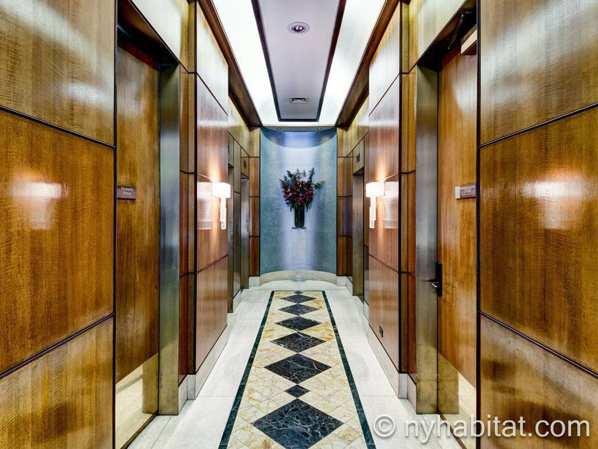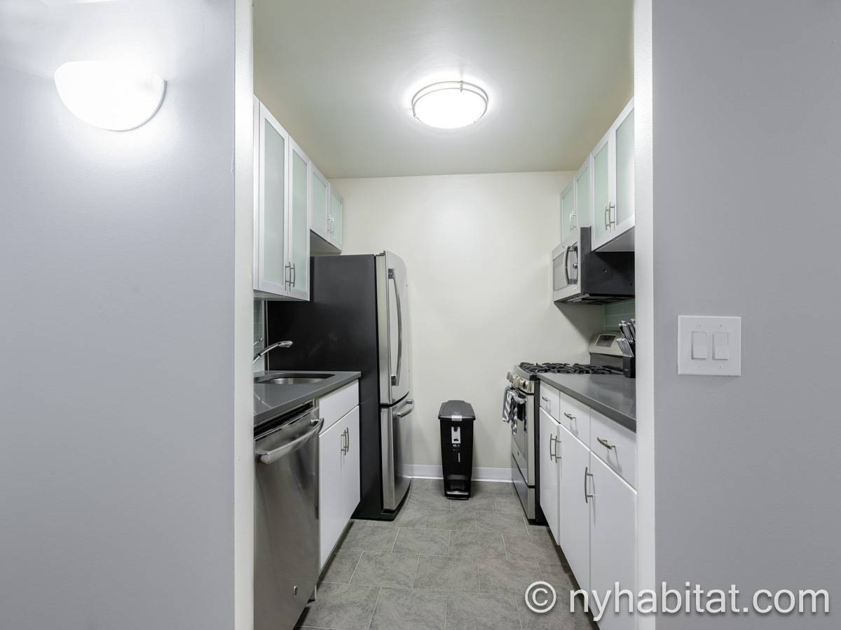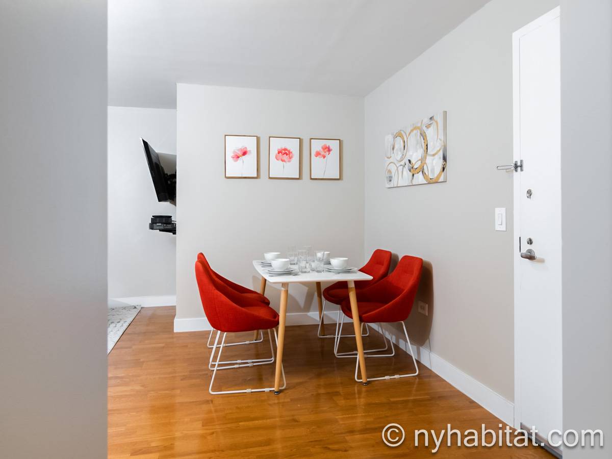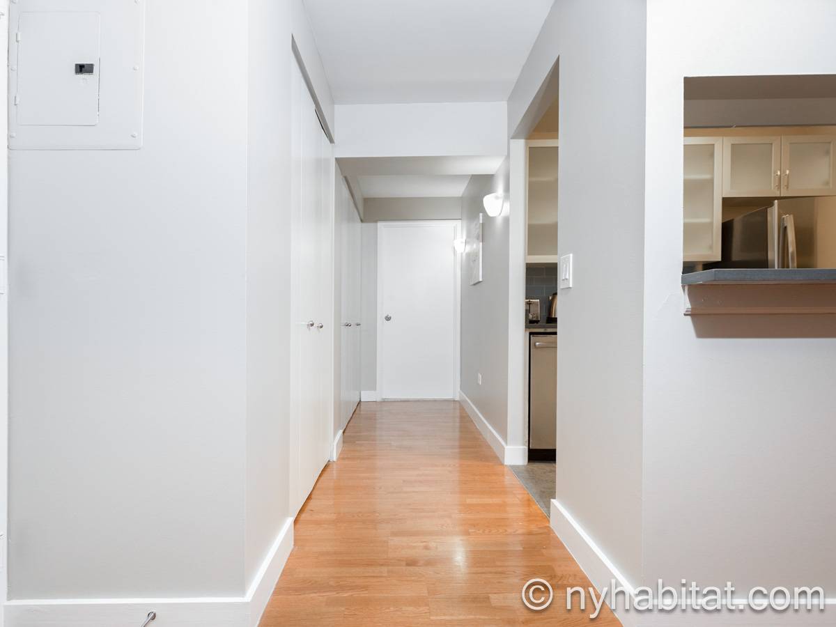 Cerca de la esquina de la 89th Street y la Amsterdam Avenue se sitúa este apartamento de 1 dormitorio y 1 baño en alquiler. Este apartamento amueblado de Manhattan está ubicado en el Upper West Side de Nueva York en el quinto piso (cuarto piso en Europa) de un edificio con ascensor que tiene servicios de lavandería, un gimnasio y un portero.