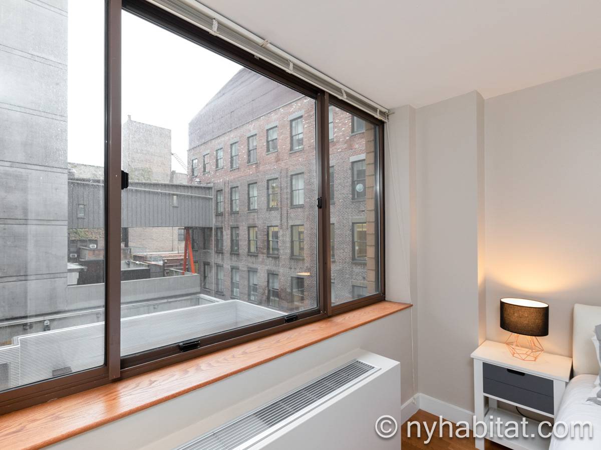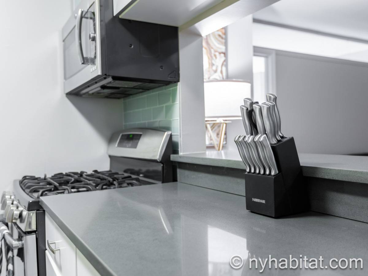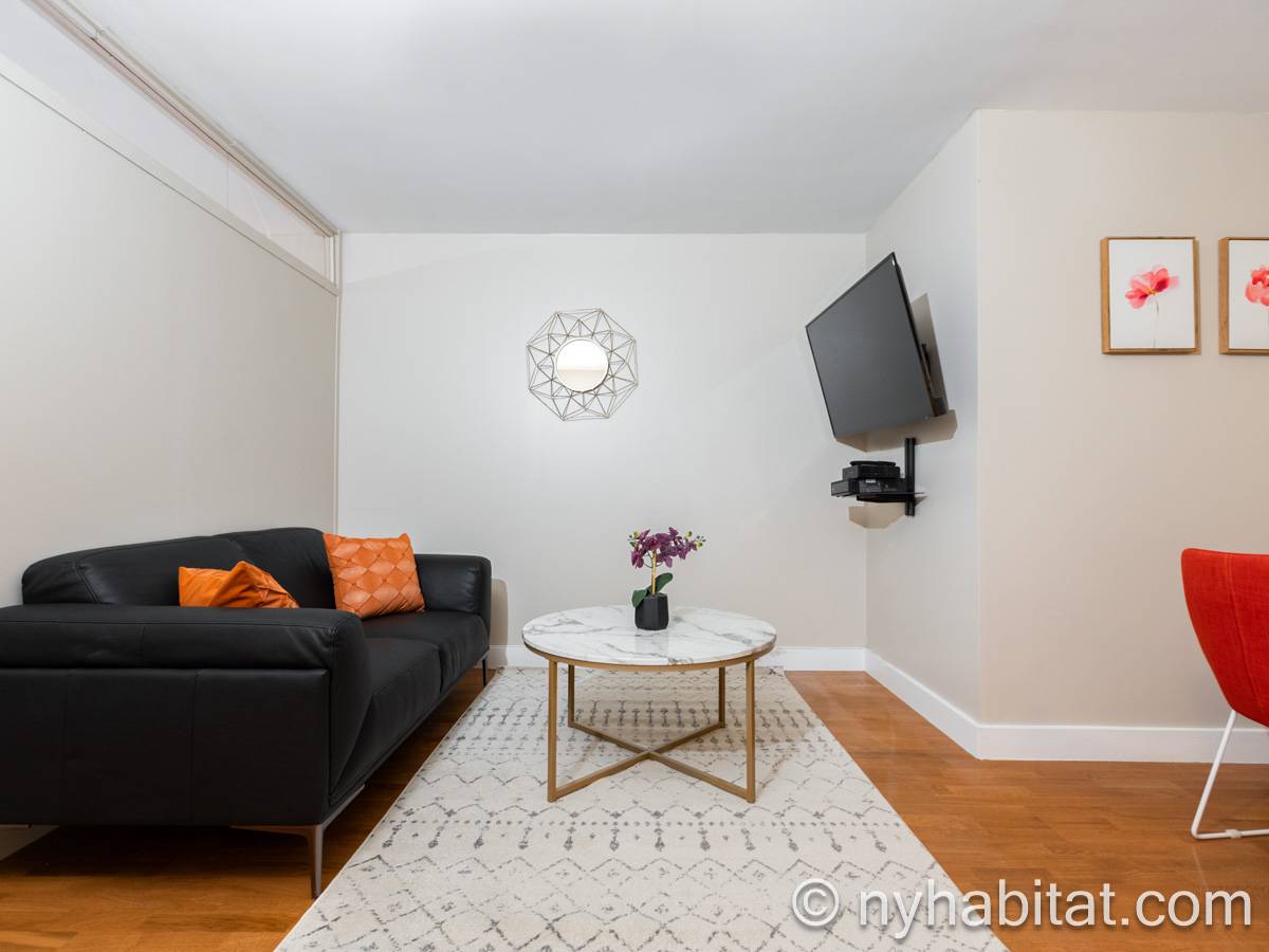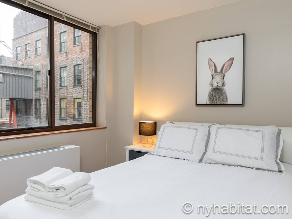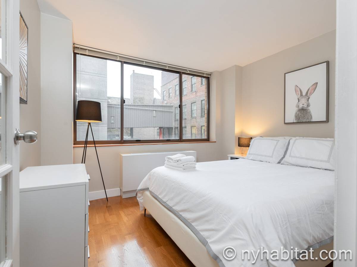 Los pisos de madera le dan la bienvenida a la sala de estar, donde le esperan un sofá, un televisor y una mesa de comedor. Una barra de bar divide la sala de estar de la cocina moderna equipada con una placa para salpicaduras de azulejos tipo metro y gabinetes con paneles de vidrio. Asimismo, en la cocina se encuentran todos los electrodomésticos básicos: un refrigerador con congelador, un horno, un lavavajillas, una tostadora y una cafetera. El dormitorio con su cama de doble da a Manhattan a través de un ventanal casi de pared a pared. En el baño hay una bañera con ducha.