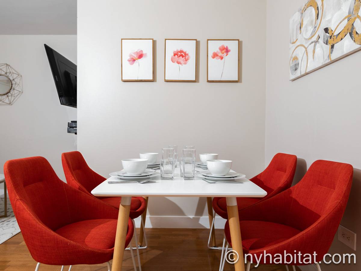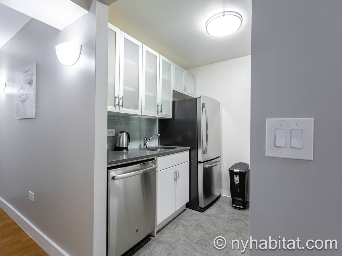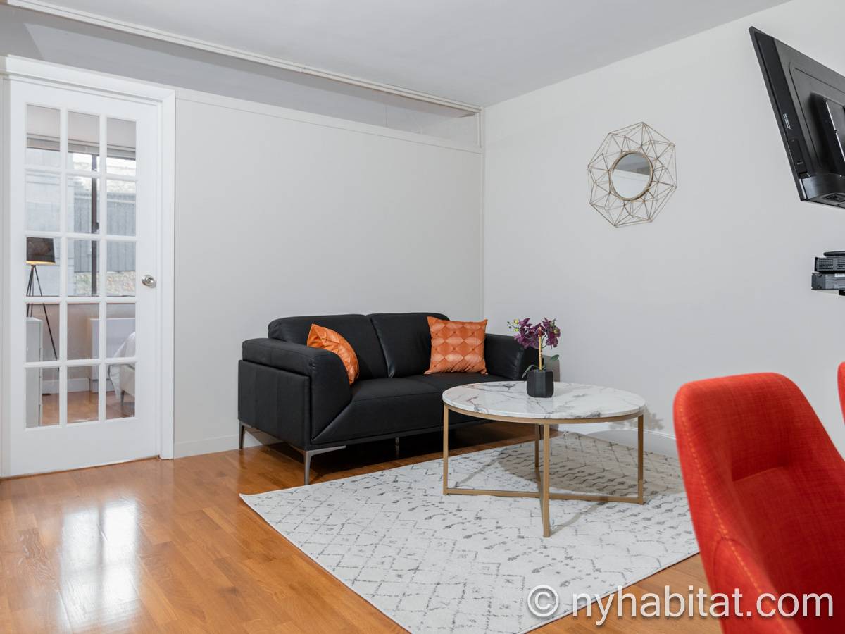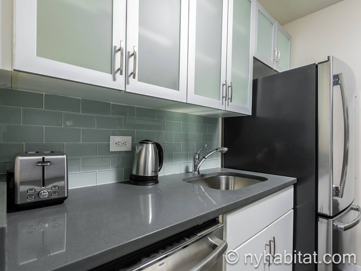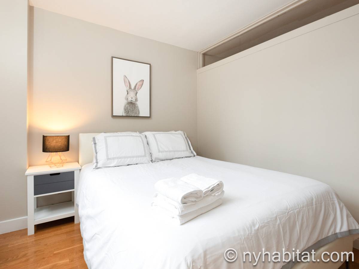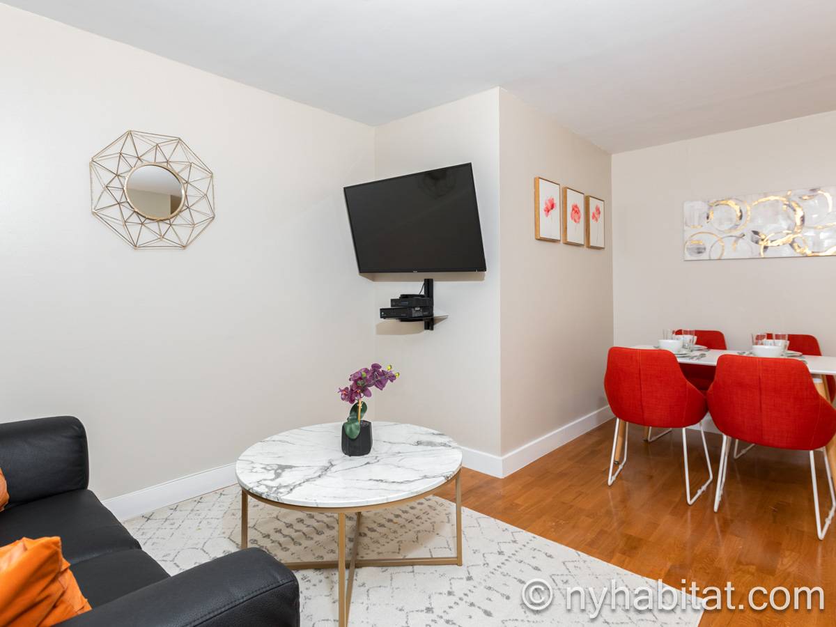 Los pisos de madera le dan la bienvenida a la sala de estar, donde le esperan un sofá, un televisor y una mesa de comedor. Una barra de bar divide la sala de estar de la cocina moderna equipada con una placa para salpicaduras de azulejos tipo metro y gabinetes con paneles de vidrio. Asimismo, en la cocina se encuentran todos los electrodomésticos básicos: un refrigerador con congelador, un horno, un lavavajillas, una tostadora y una cafetera. El dormitorio con su cama de doble da a Manhattan a través de un ventanal casi de pared a pared. En el baño hay una bañera con ducha.