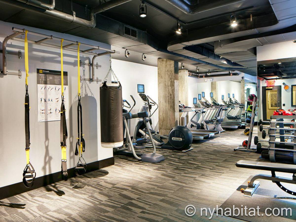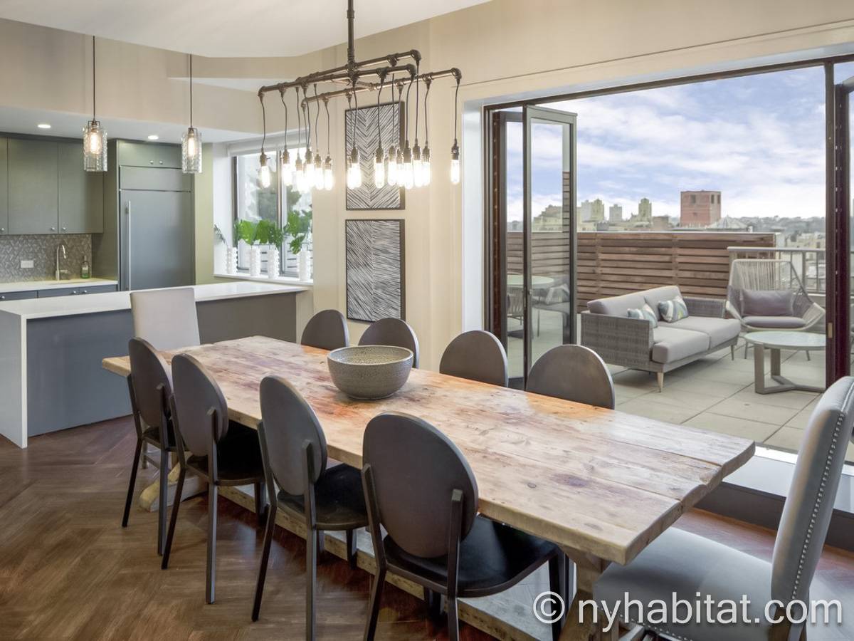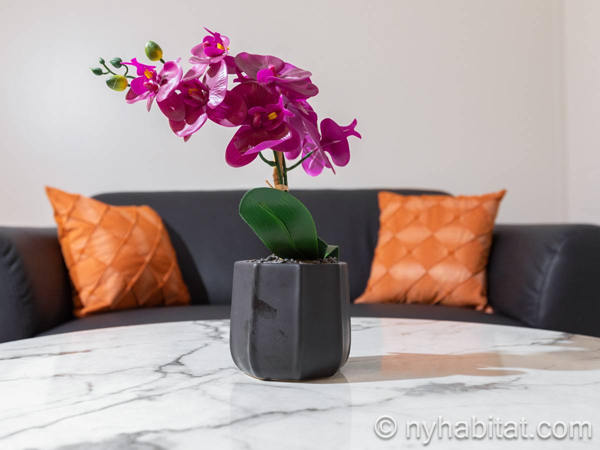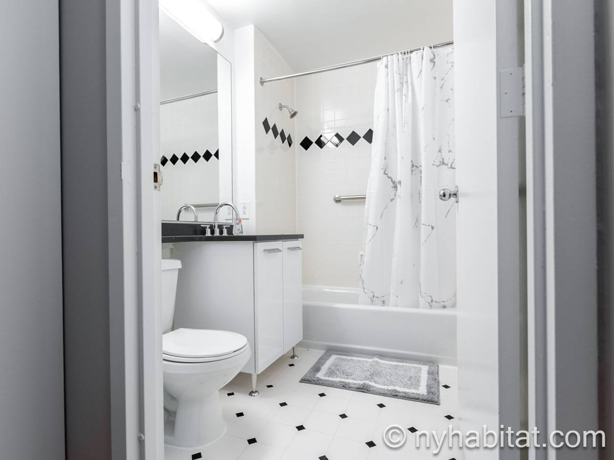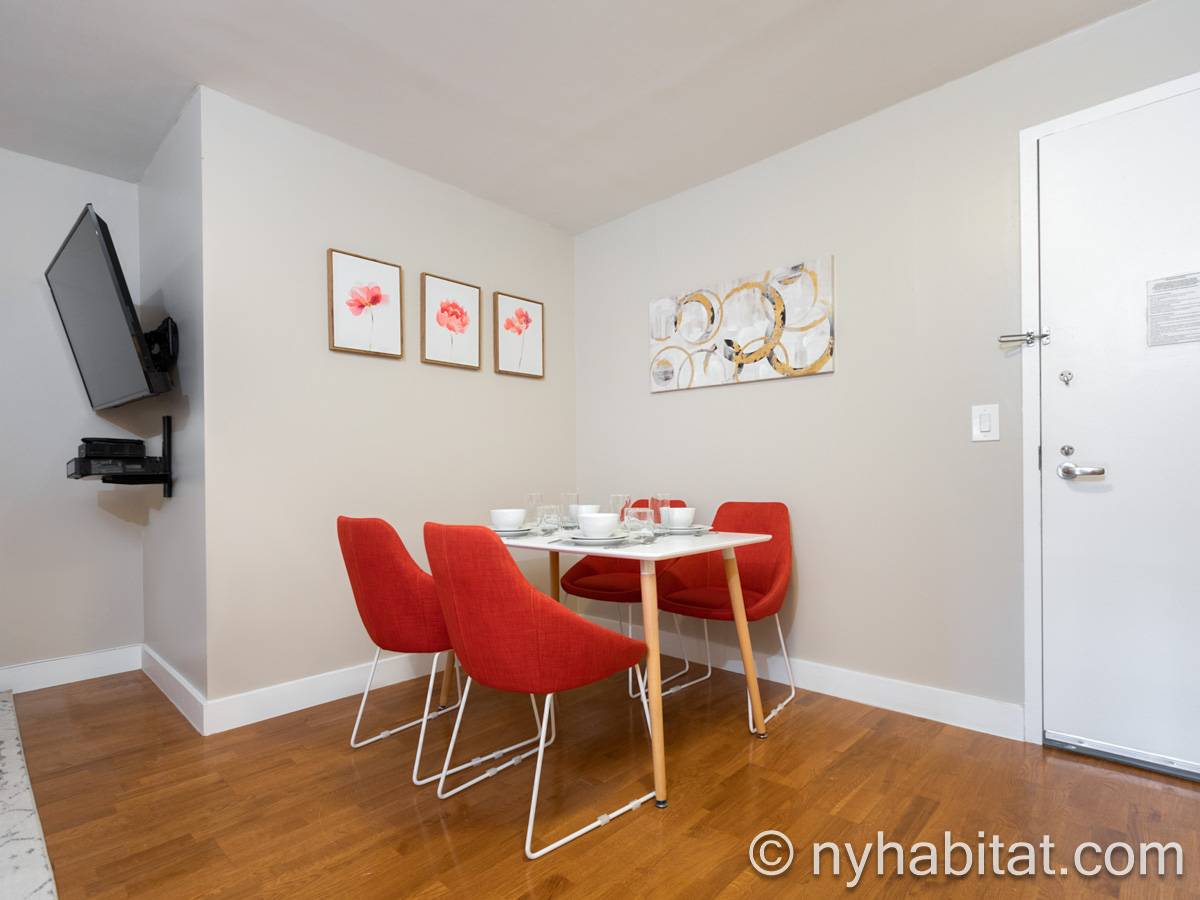 Los pisos de madera le dan la bienvenida a la sala de estar, donde le esperan un sofá, un televisor y una mesa de comedor. Una barra de bar divide la sala de estar de la cocina moderna equipada con una placa para salpicaduras de azulejos tipo metro y gabinetes con paneles de vidrio. Asimismo, en la cocina se encuentran todos los electrodomésticos básicos: un refrigerador con congelador, un horno, un lavavajillas, una tostadora y una cafetera. El dormitorio con su cama de doble da a Manhattan a través de un ventanal casi de pared a pared. En el baño hay una bañera con ducha.