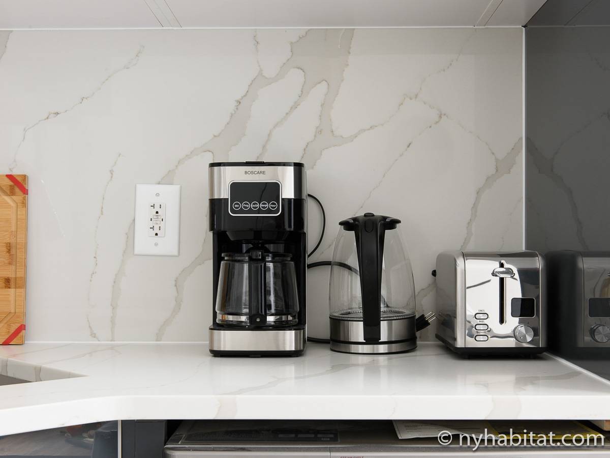 Los pisos de madera lo llevan a la sala de estar de este alquiler amueblado, donde hay un sofá, un escritorio y un televisor. Prepare una comida en la cocina y disfrútela en la mesa de comedor. La cocina tiene puertas de gabinetes de mármol, placa para salpicaduras con patrón de mármol y electrodomésticos de acero inoxidable como un refrigerador con congelador, una cafetera, una tostadora, un microondas y un horno. El dormitorio tiene una cama doble y un armario. En el baño hay una ducha con efecto de lluvia tropical y azulejos del piso al techo.