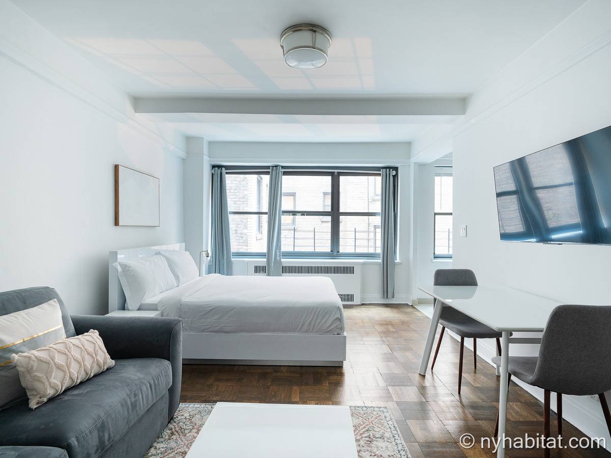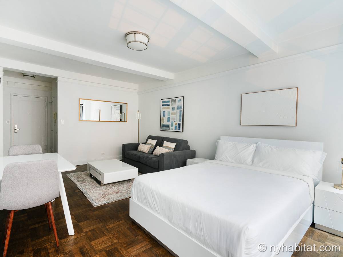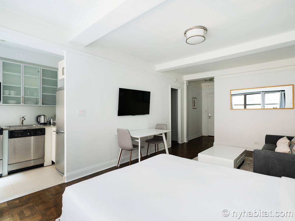 Este apartamento estudio amueblado en el barrio de Midtown East de Manhattan, se encuentra cerca de la esquina de East 52nd Street y 2nd Avenue, este alquiler de Nueva York se encuentra en el segundo piso (equivalente al primer piso en Europa) de un edificio con ascensor. El edificio cuenta con lavandería y portero.