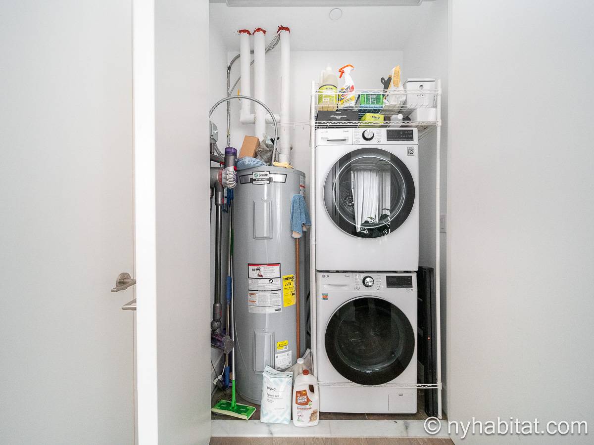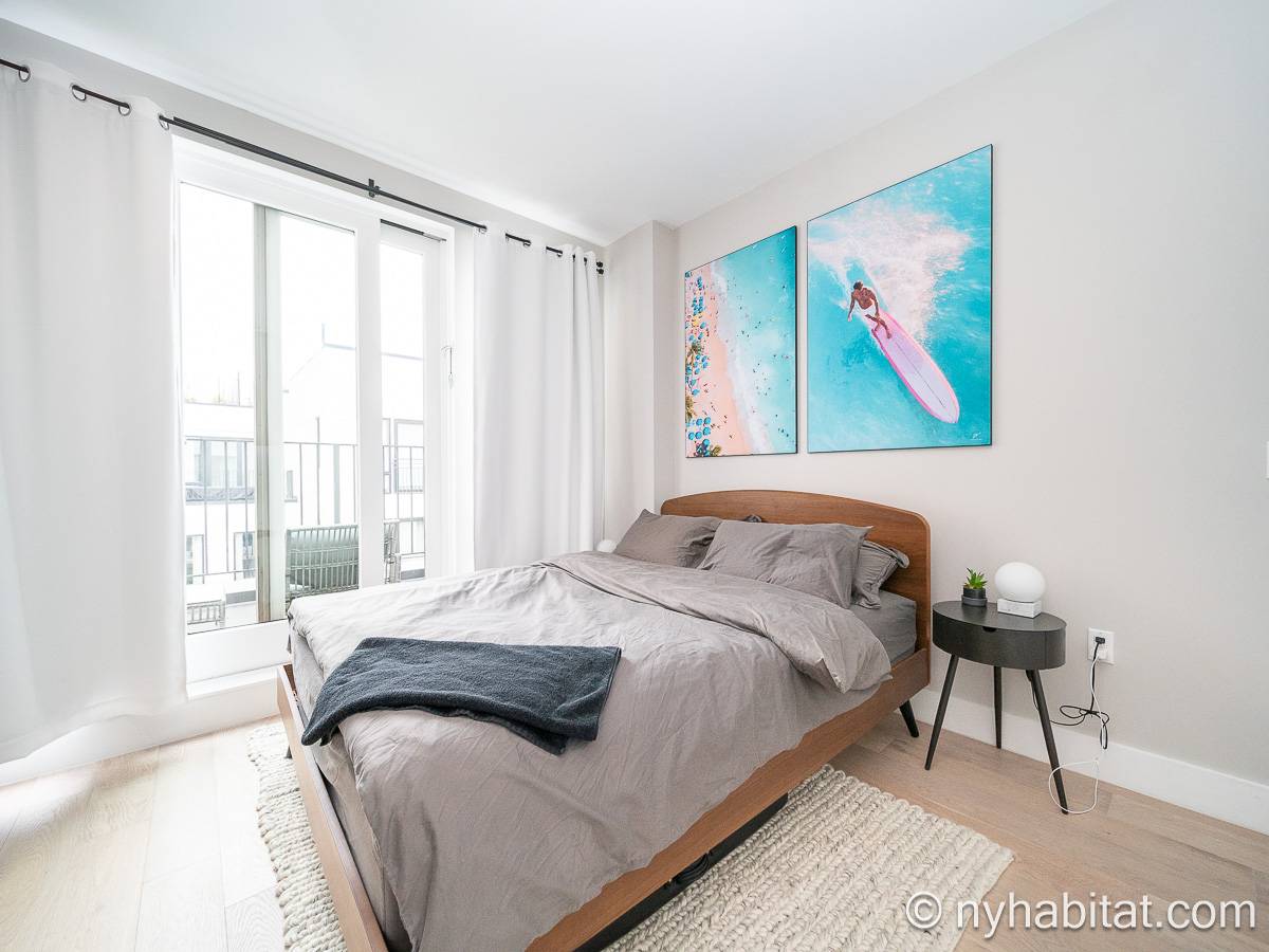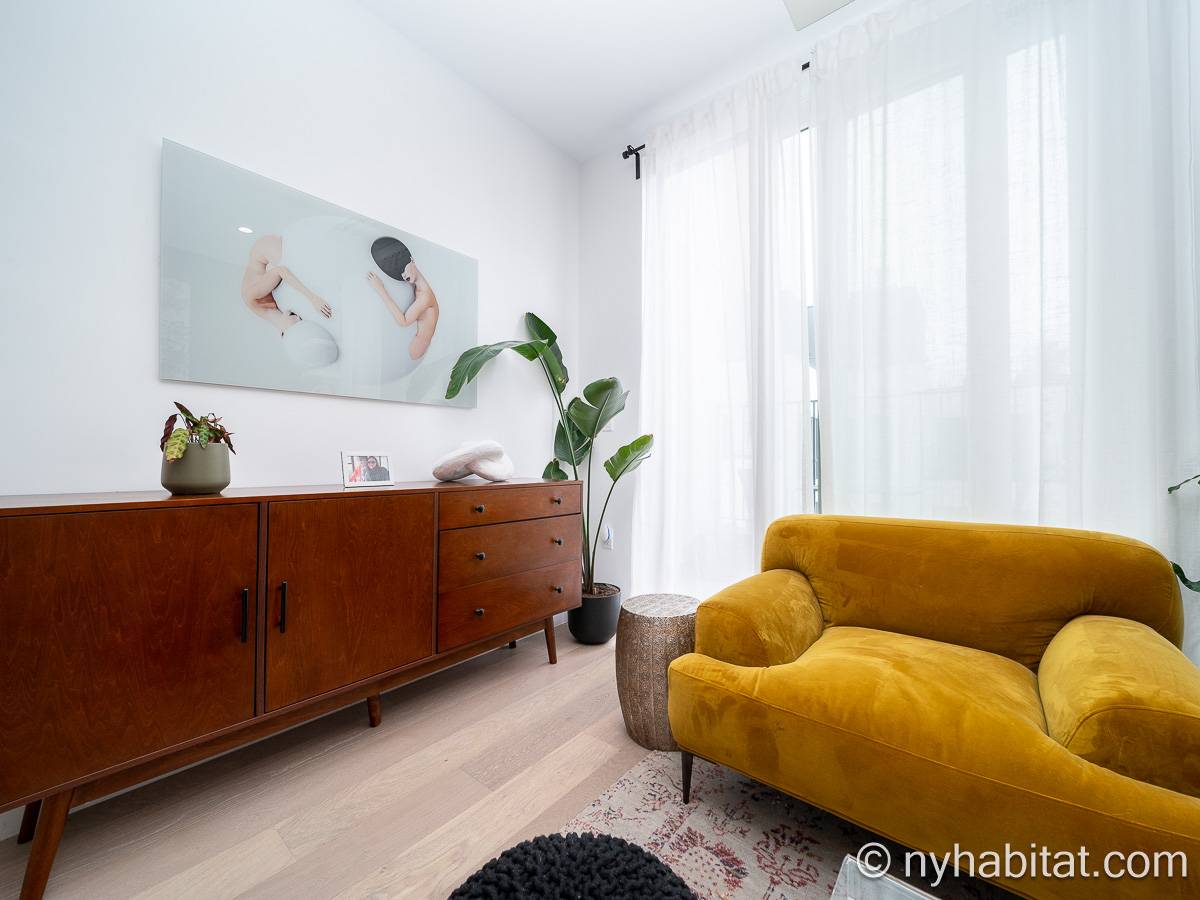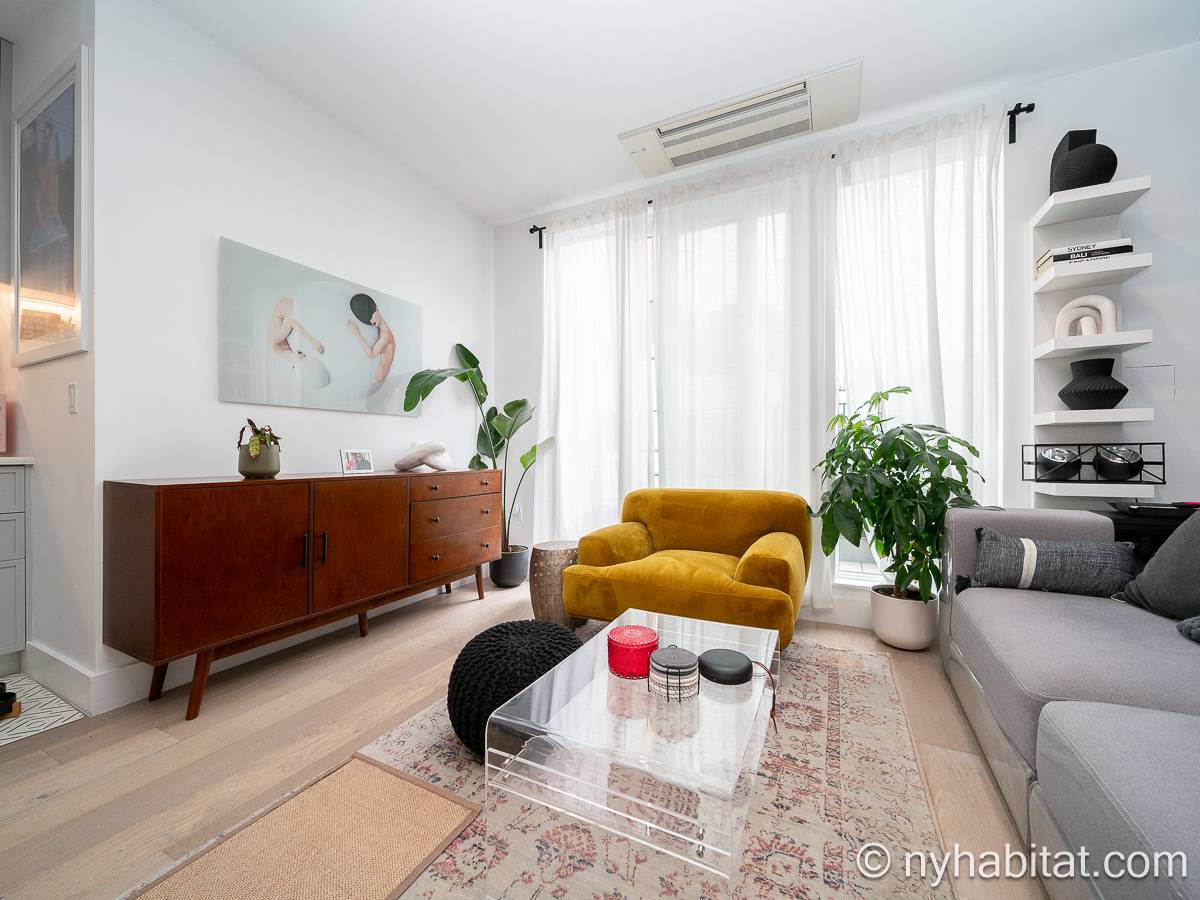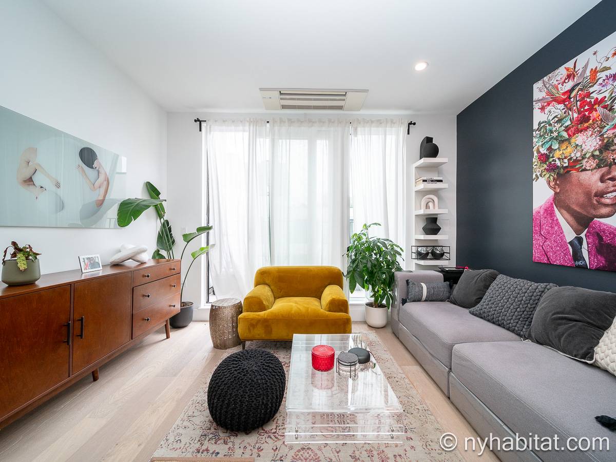 La sala de estar cuenta con una superficie de aproximadamente 29 m² y dispone de suelos de parqué de madera, un sofá, una mesa de comedor y amplios ventanales. Compartiendo parte de esta luz natural, la cocina de concepto abierto está equipada con microondas, cafetera, lavavajillas, nevera y horno. El dormitorio, con una superficie de unos 15 m², está amueblado con una cama tamaño queen, aire acondicionado, un armario y abundante luz natural. El baño incluye una bañera con ducha. Además, la vivienda cuenta con una terraza y dispone de lavadora y secadora dentro de la unidad.